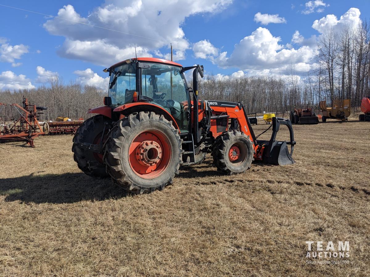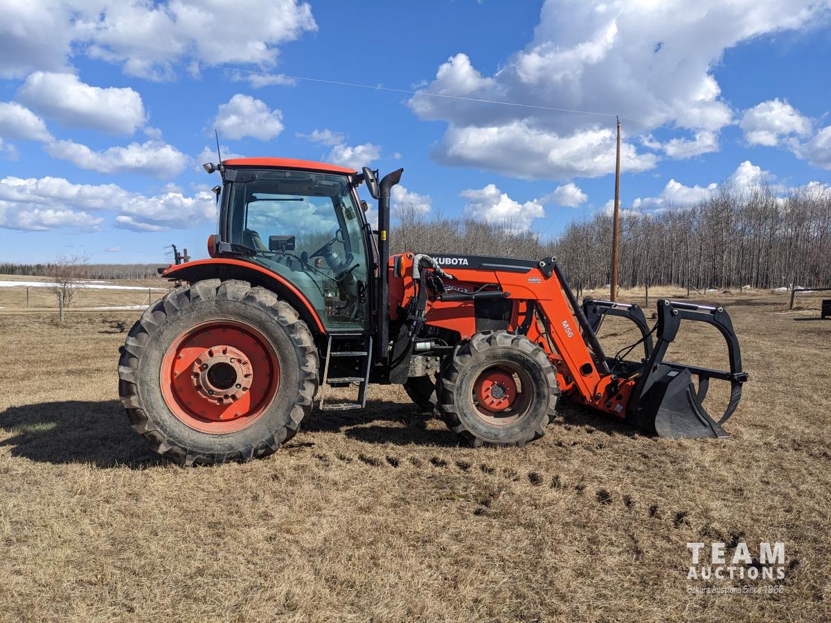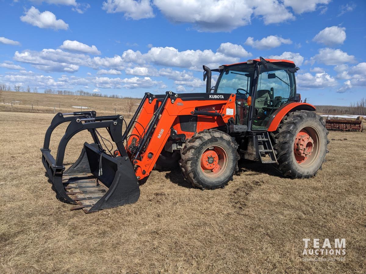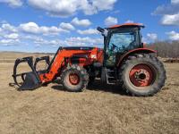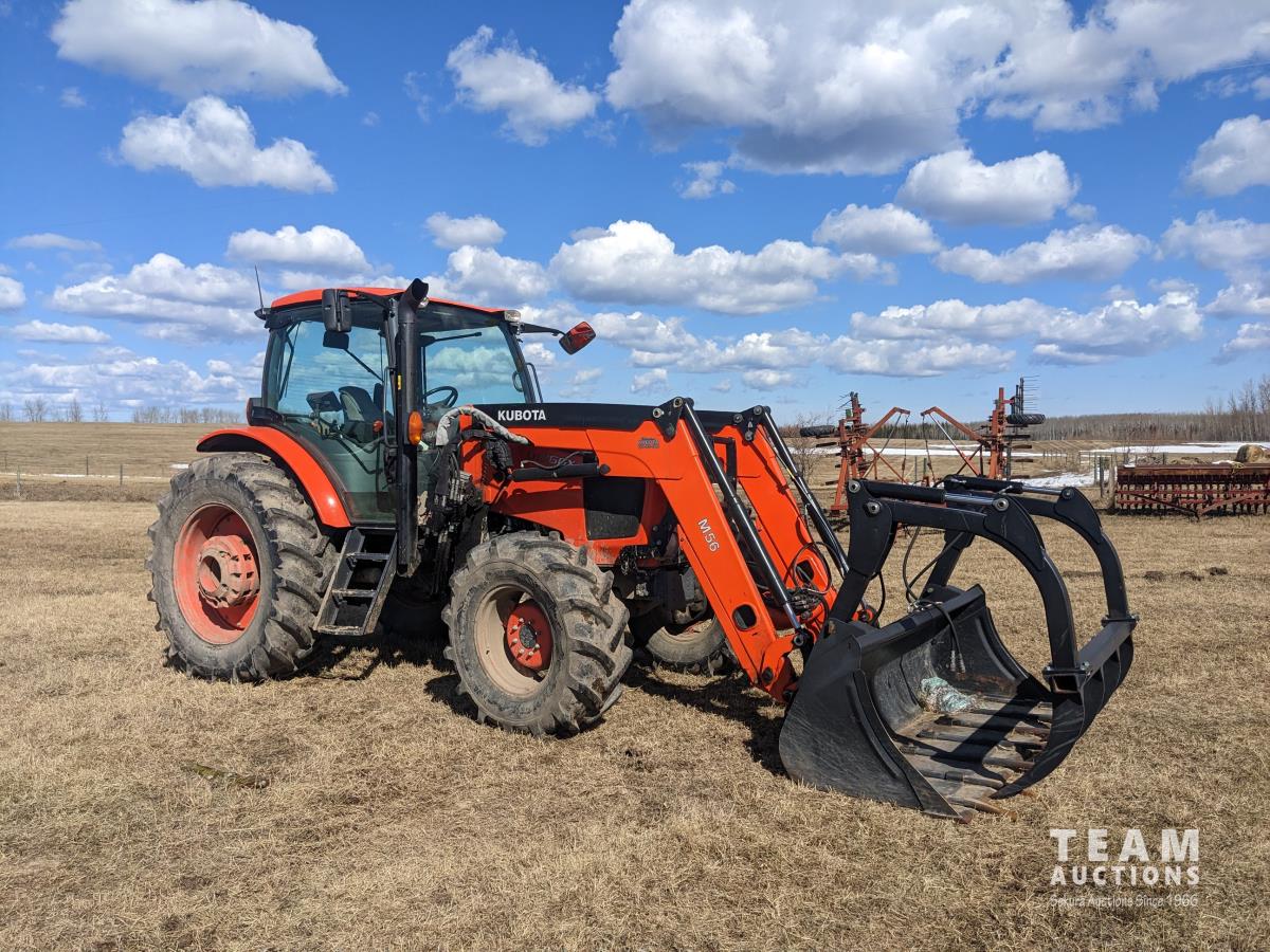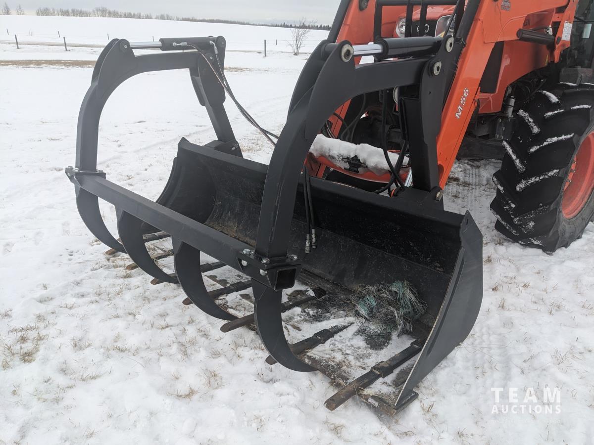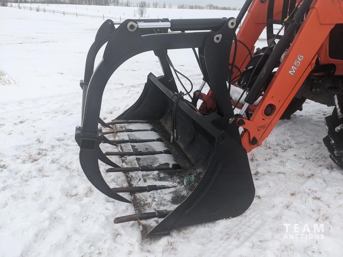 Kubota M56 loader, Q/A, 96 inch bucket, grapple, mid mount hydraulic connection, Kubota 6.1 L 4 125 HP, engine, 108 PTO HP, 24 speed Intelli-Shift partial power shift transmission, cab, left hand reverser, rear differential lock, joystick, A/C, radio, buddy seat, 540/1000 PTO, 3 point hitch, 3 point hitch exterior control, 2 rear hydraulic outlets, rear wheel weights, 420/70R24 front tires, 520/70R38 rear tires