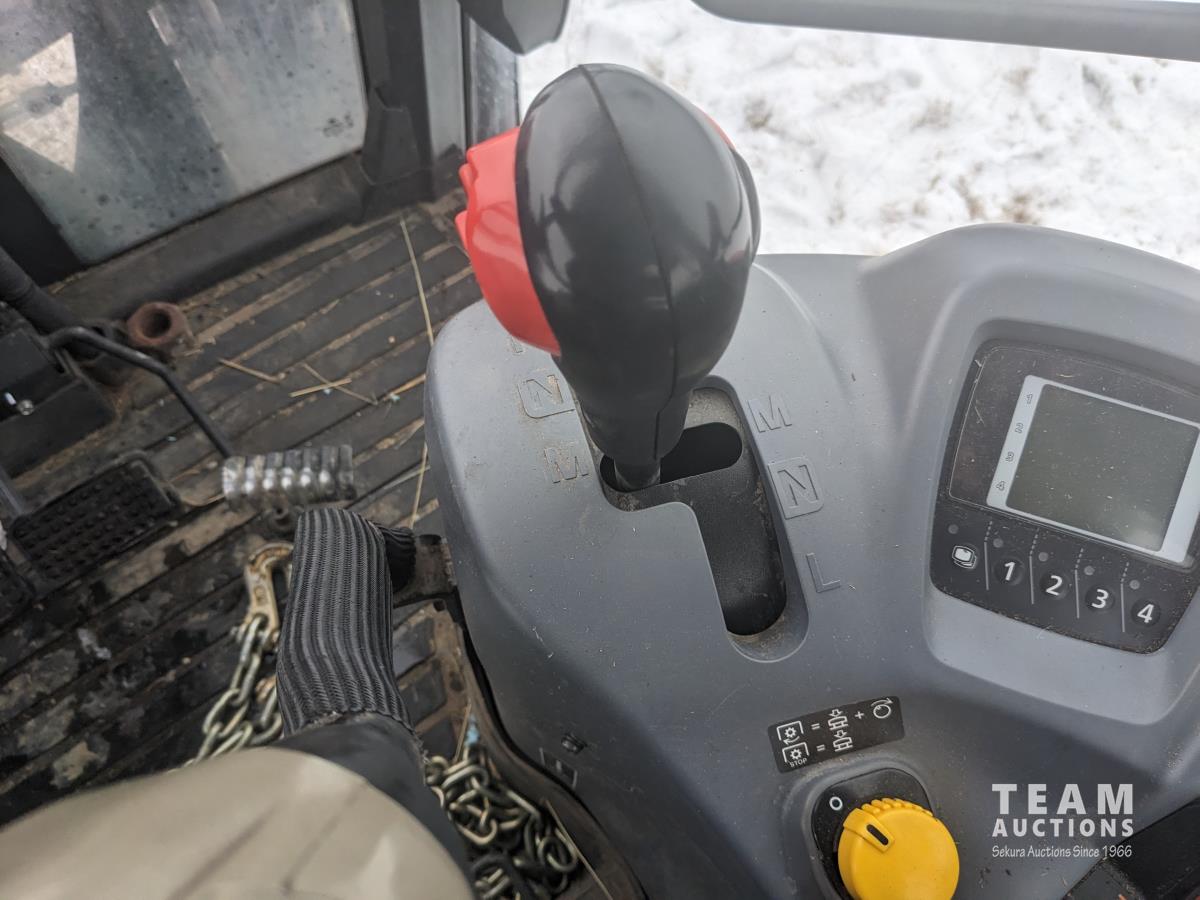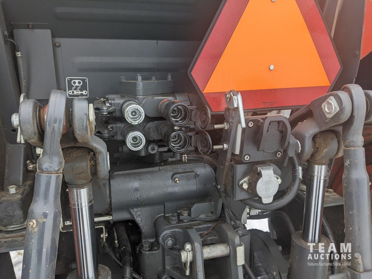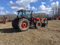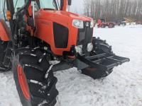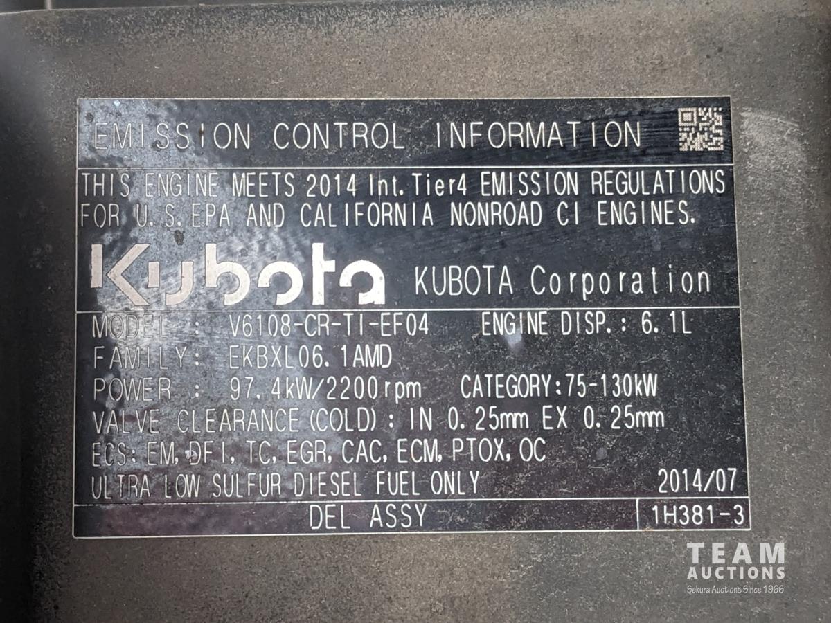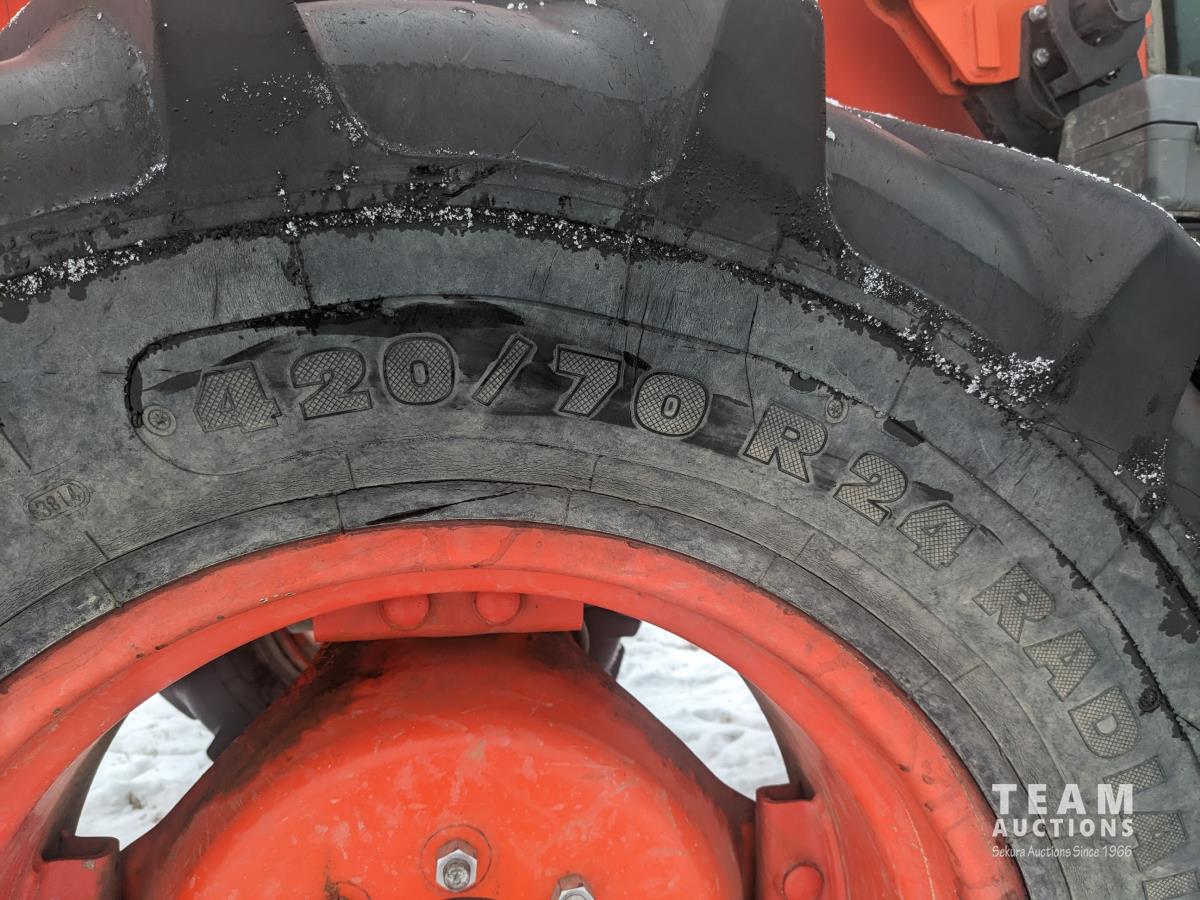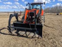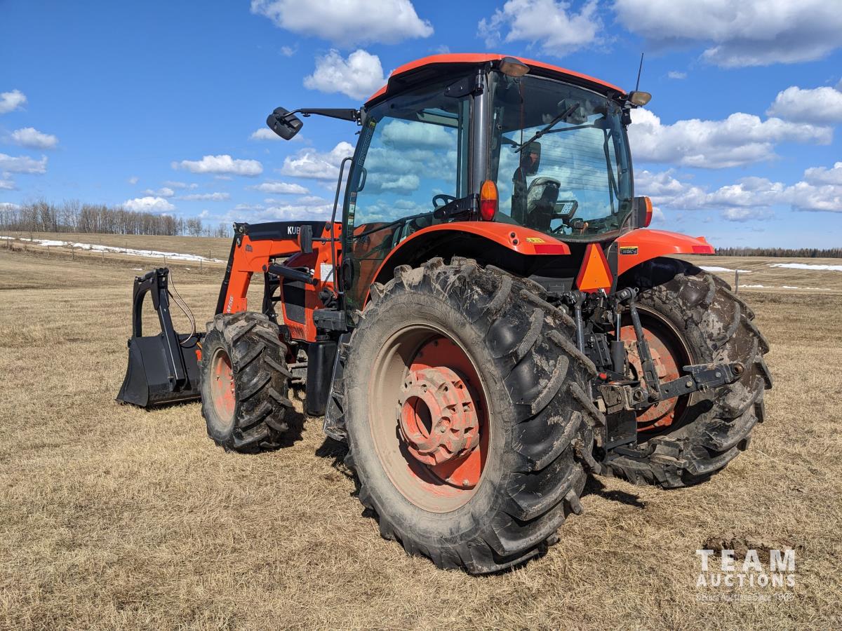 Kubota M56 loader, Q/A, 96 inch bucket, grapple, mid mount hydraulic connection, Kubota 6.1 L 4 125 HP, engine, 108 PTO HP, 24 speed Intelli-Shift partial power shift transmission, cab, left hand reverser, rear differential lock, joystick, A/C, radio, buddy seat, 540/1000 PTO, 3 point hitch, 3 point hitch exterior control, 2 rear hydraulic outlets, rear wheel weights, 420/70R24 front tires, 520/70R38 rear tires