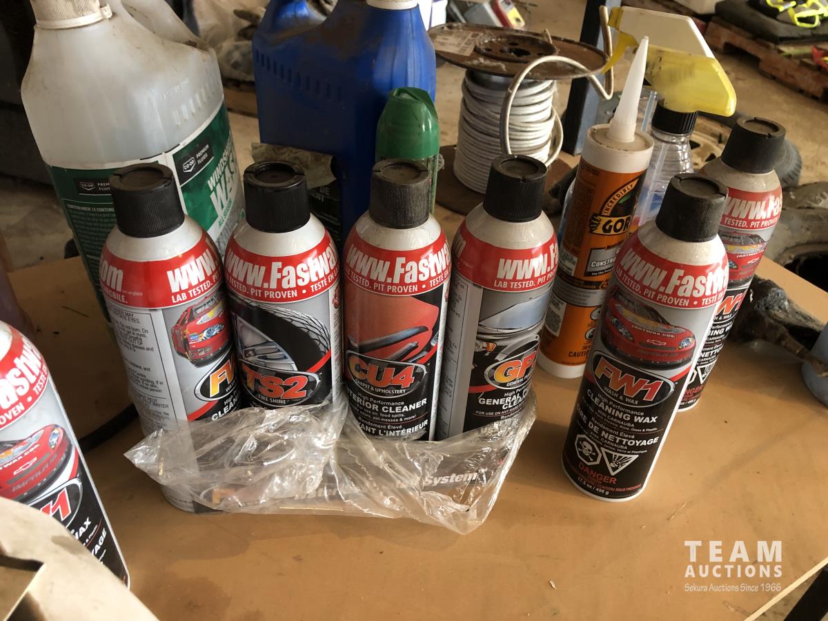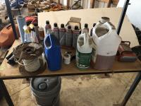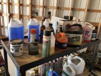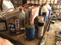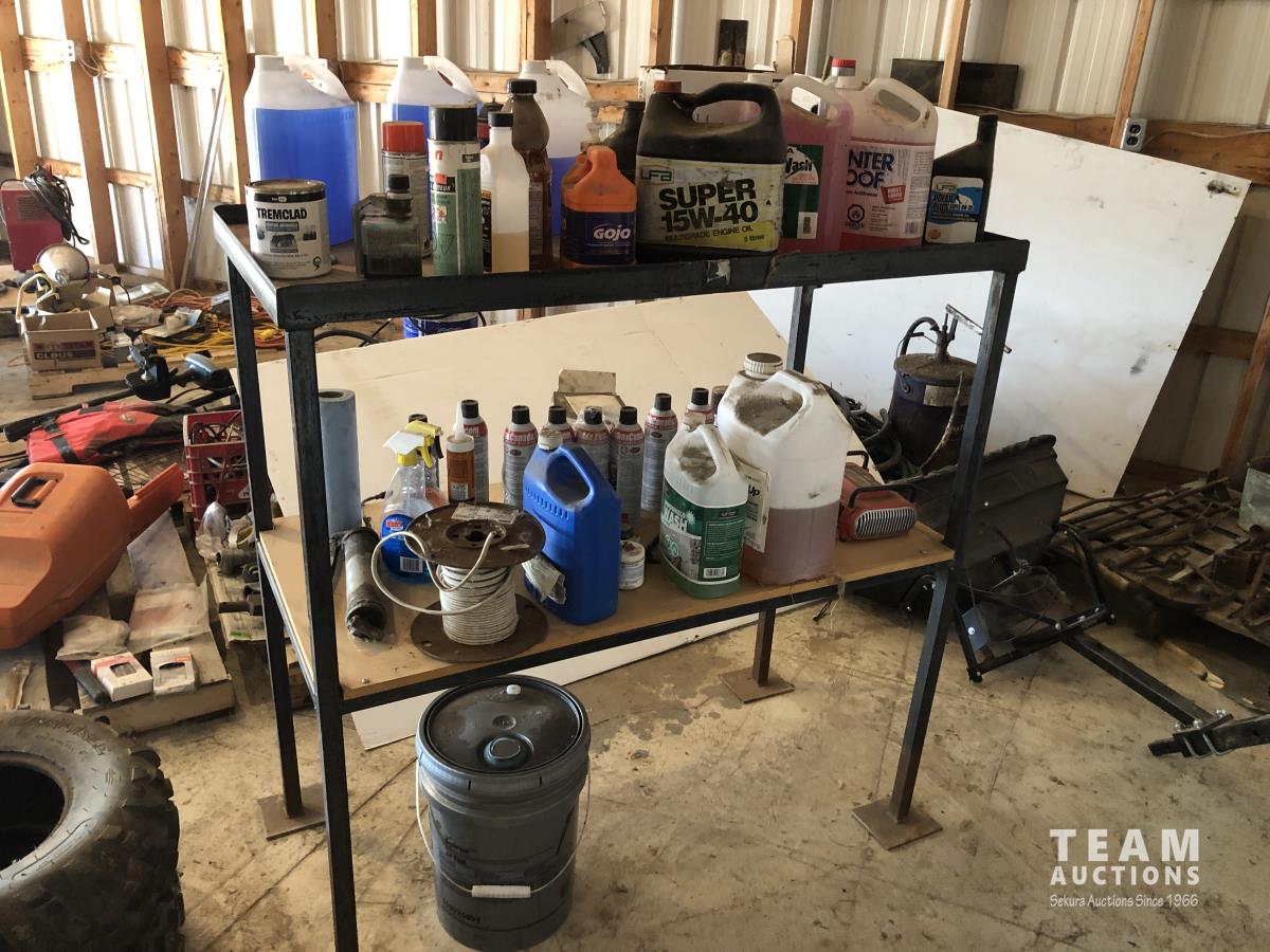 28 Metal and Wood Shelf Unit with Various Shop Fluids