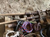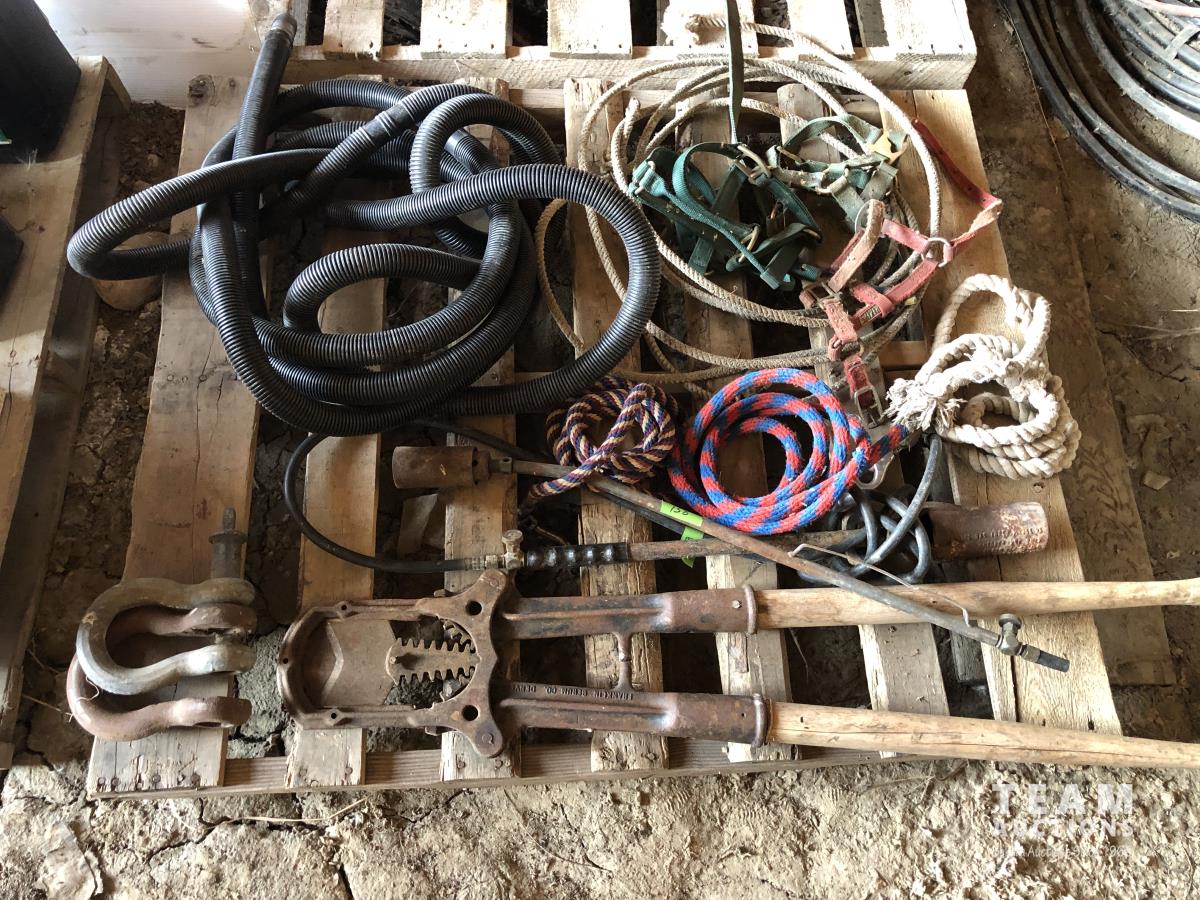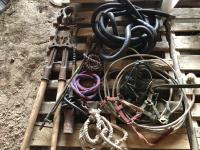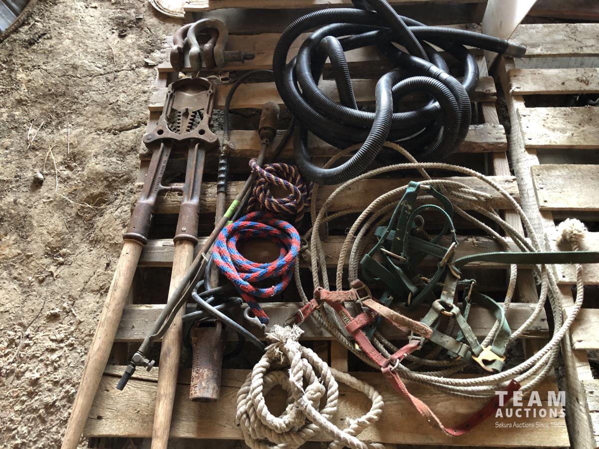 Large dehorners, poly discharge hose, (2) tiger torches, bridles, lead ropes, (2) shackles