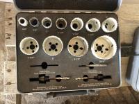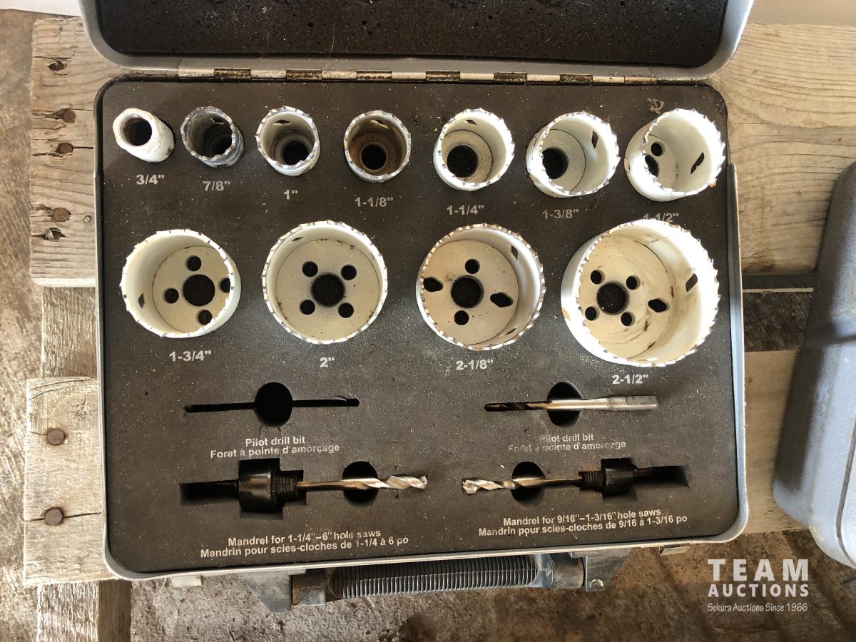 Set of hole saws, socket set, Dremel set, sledge hammer, pry bar and miscellaneous tools