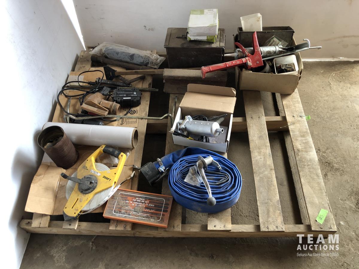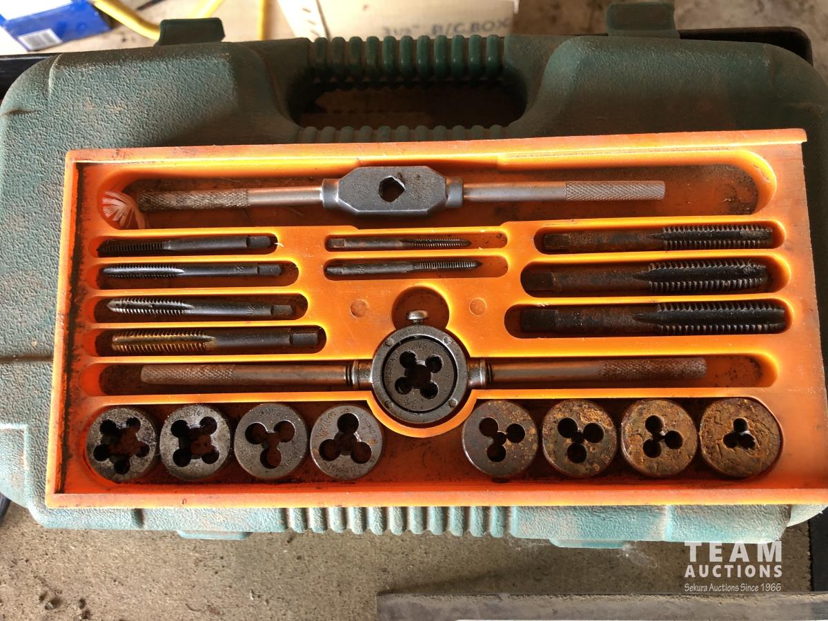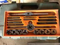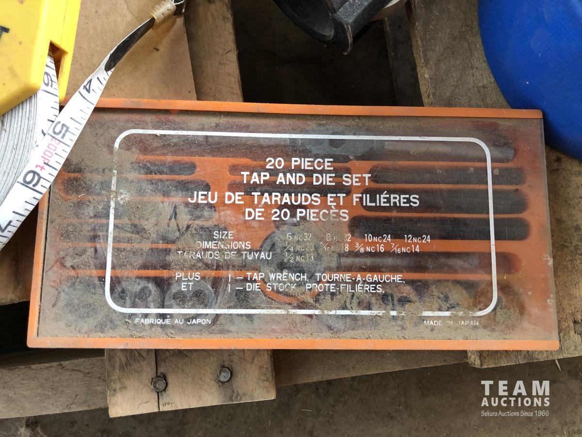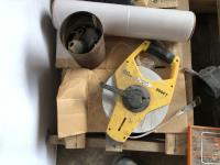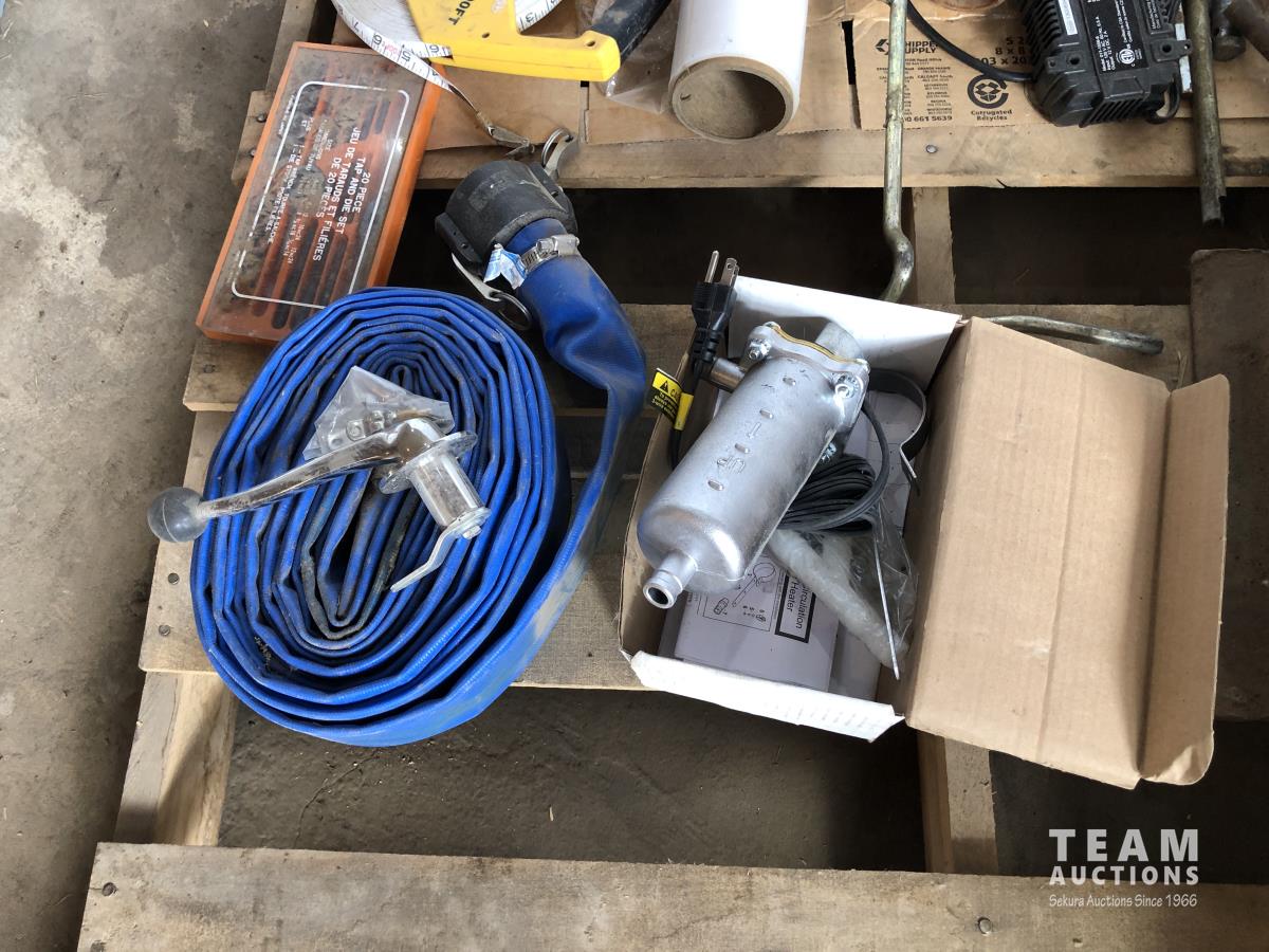 Tap & die set, lay flat hose, 200 ft measuring tape, 1500W engine heater, miscellaneous items