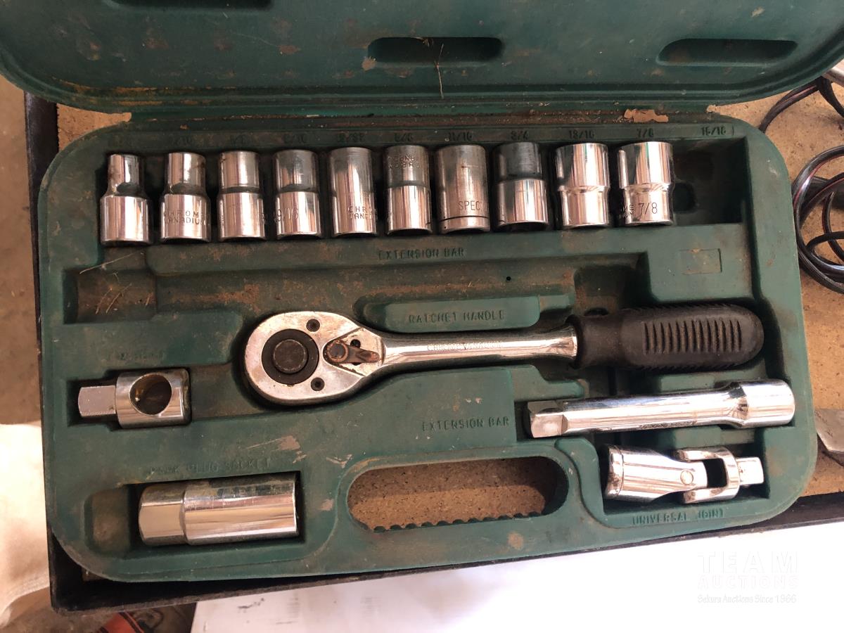 Bench 44 inch L X 14 inch W X 26 inch H, century 10 amp charger, socket set, miscellaneous tools