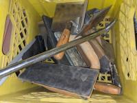 3 inch lay flat hose, work string light, qty of hammer and axe heads, qty of drywall mud tools, air filter, pressure washer wand