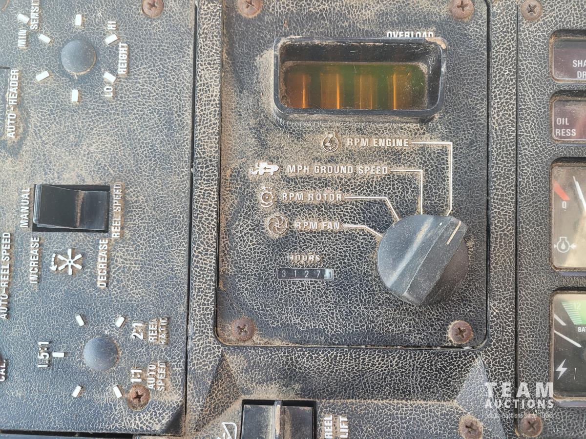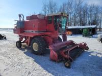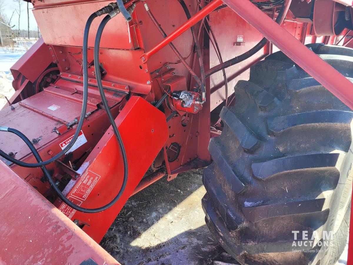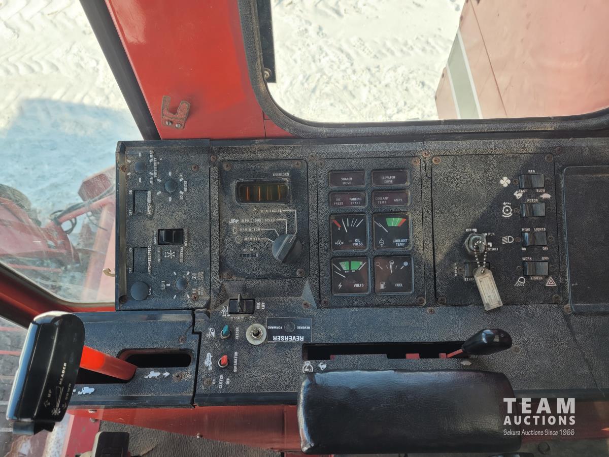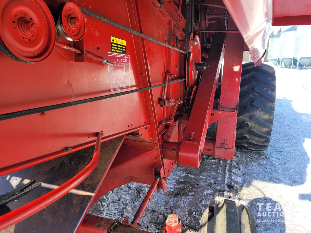 International 810 11 ft pick-up header, chaff spreader, chopper/straw spreader, hydro, 3127 engine hrs, 28L-26 front tires, 10.00-16 rear tires