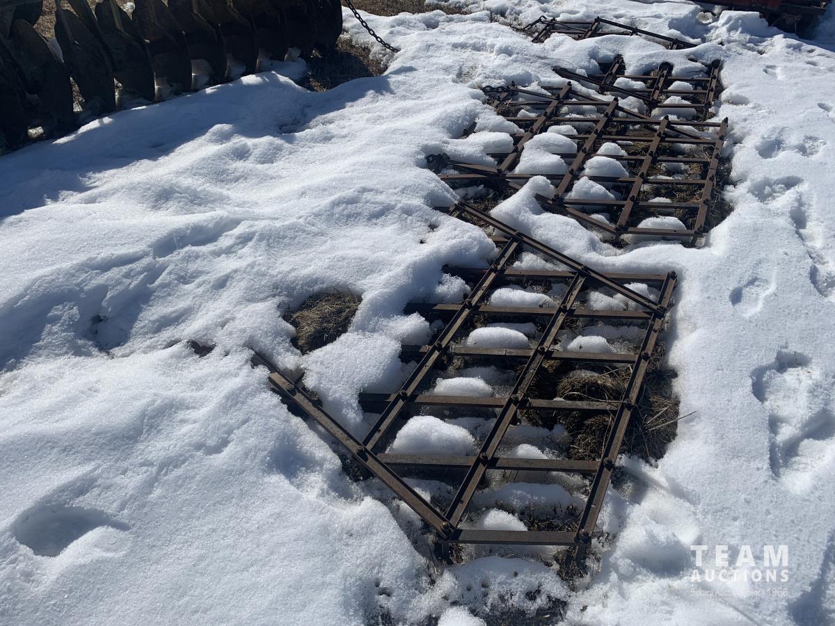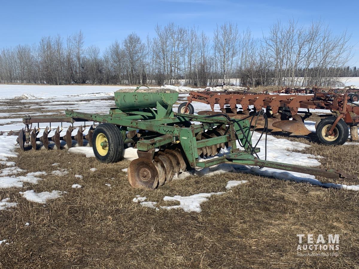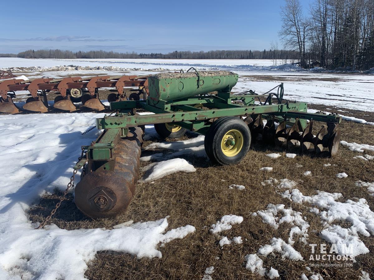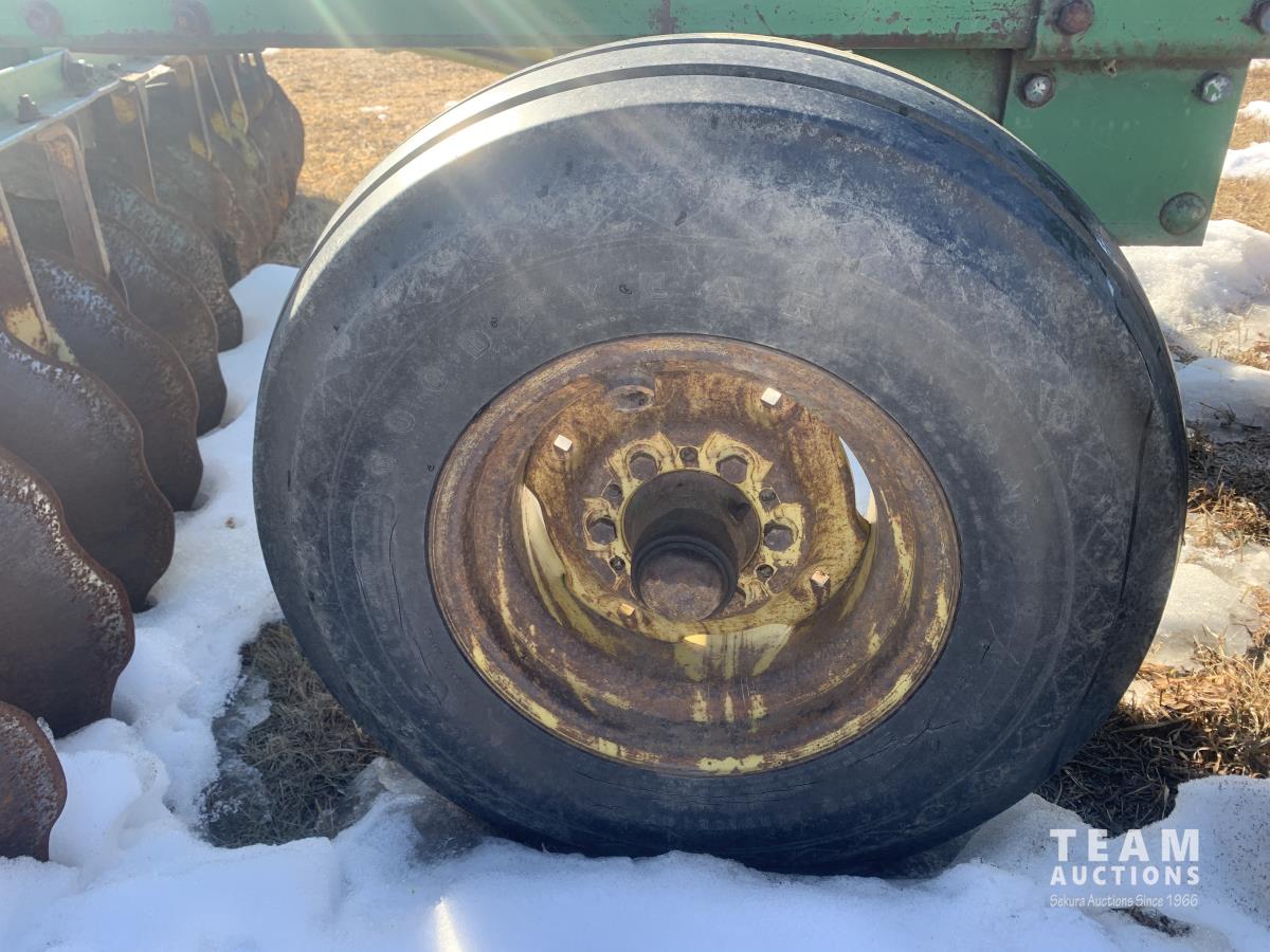 9 inch spacing, 22 inch serrated discs, weights, (3) 5 ft harrow sections 11L-15 tires