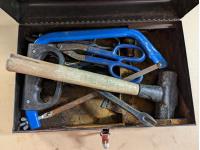 Hammer, hacksaw, tin snips, pry bar