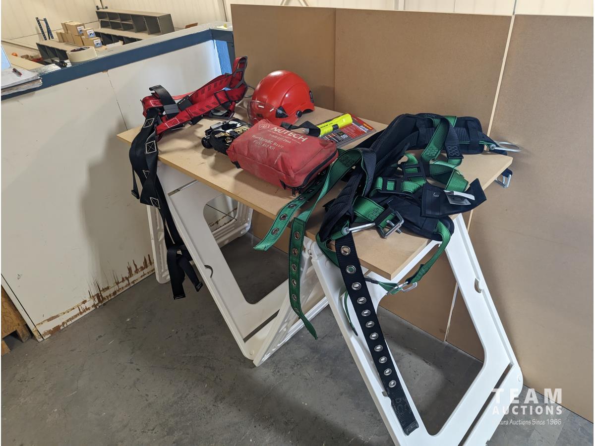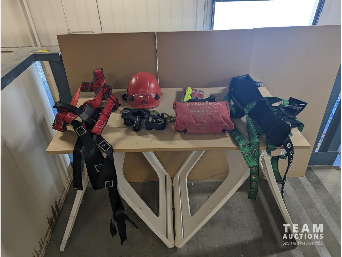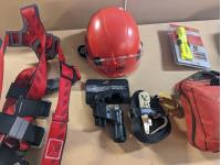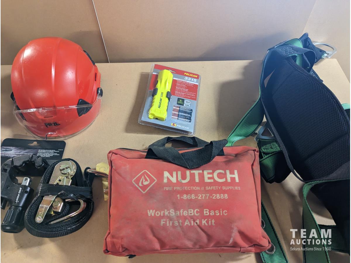 (2) Safety harness, first aid kit, flashlight, pipe cutter, ratchet strap