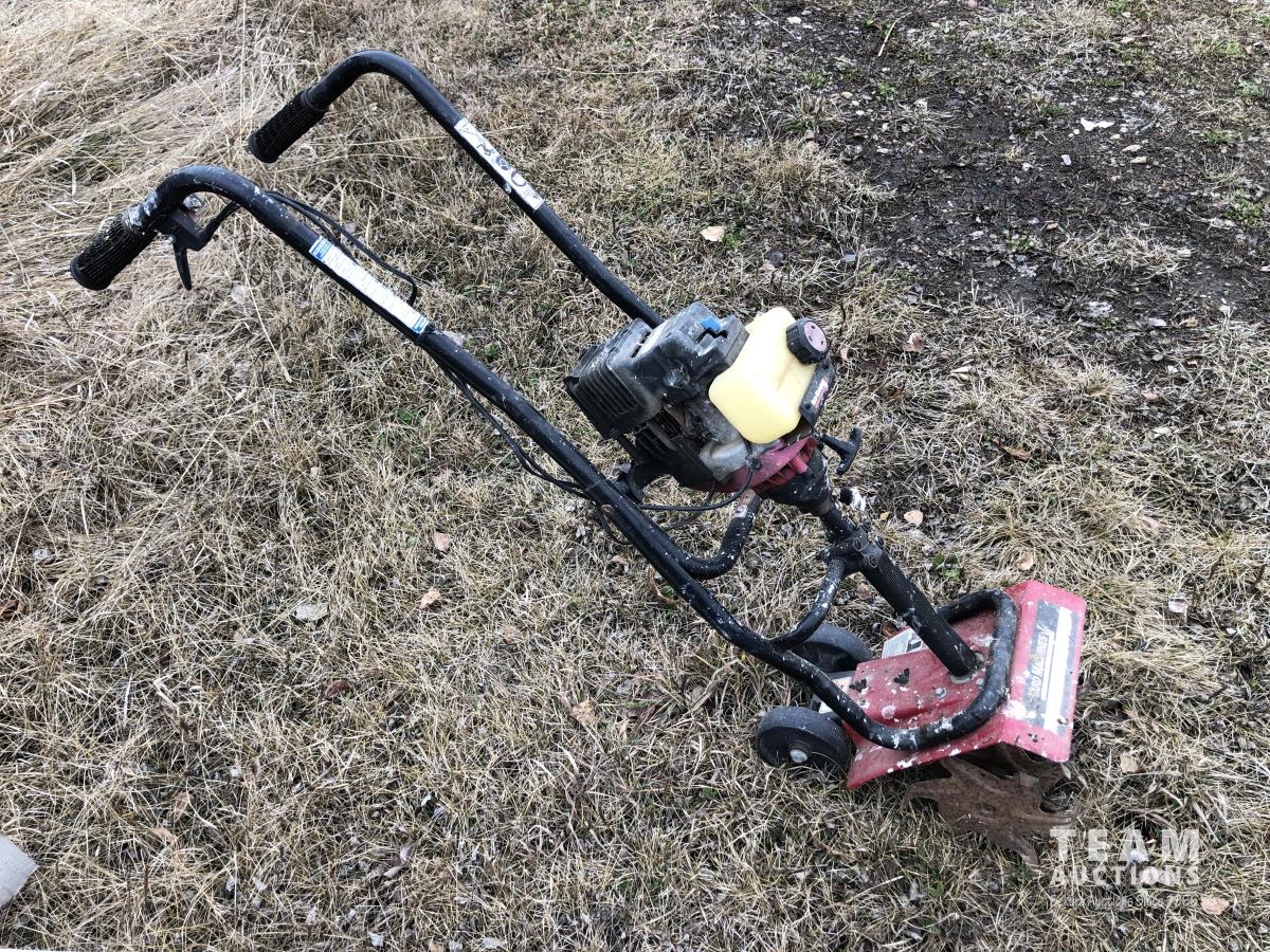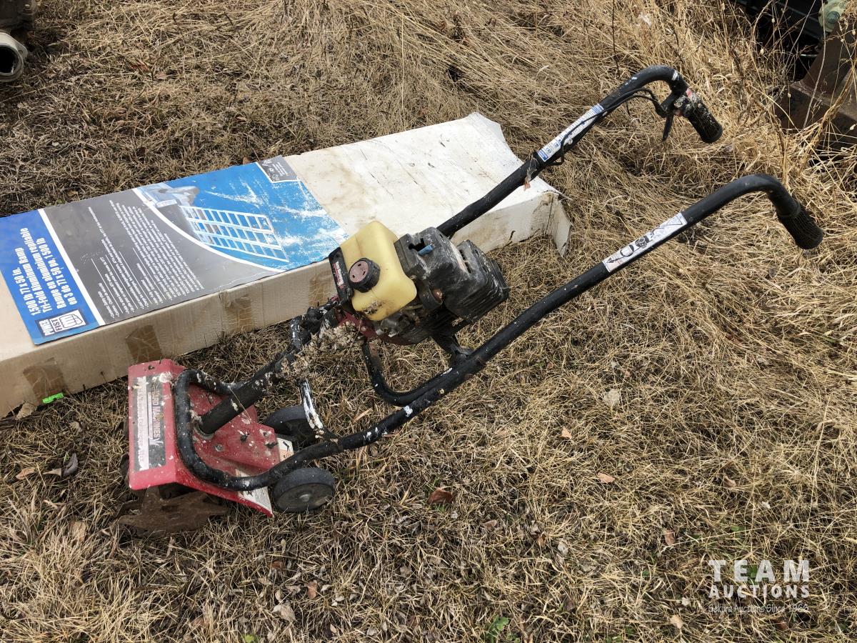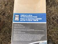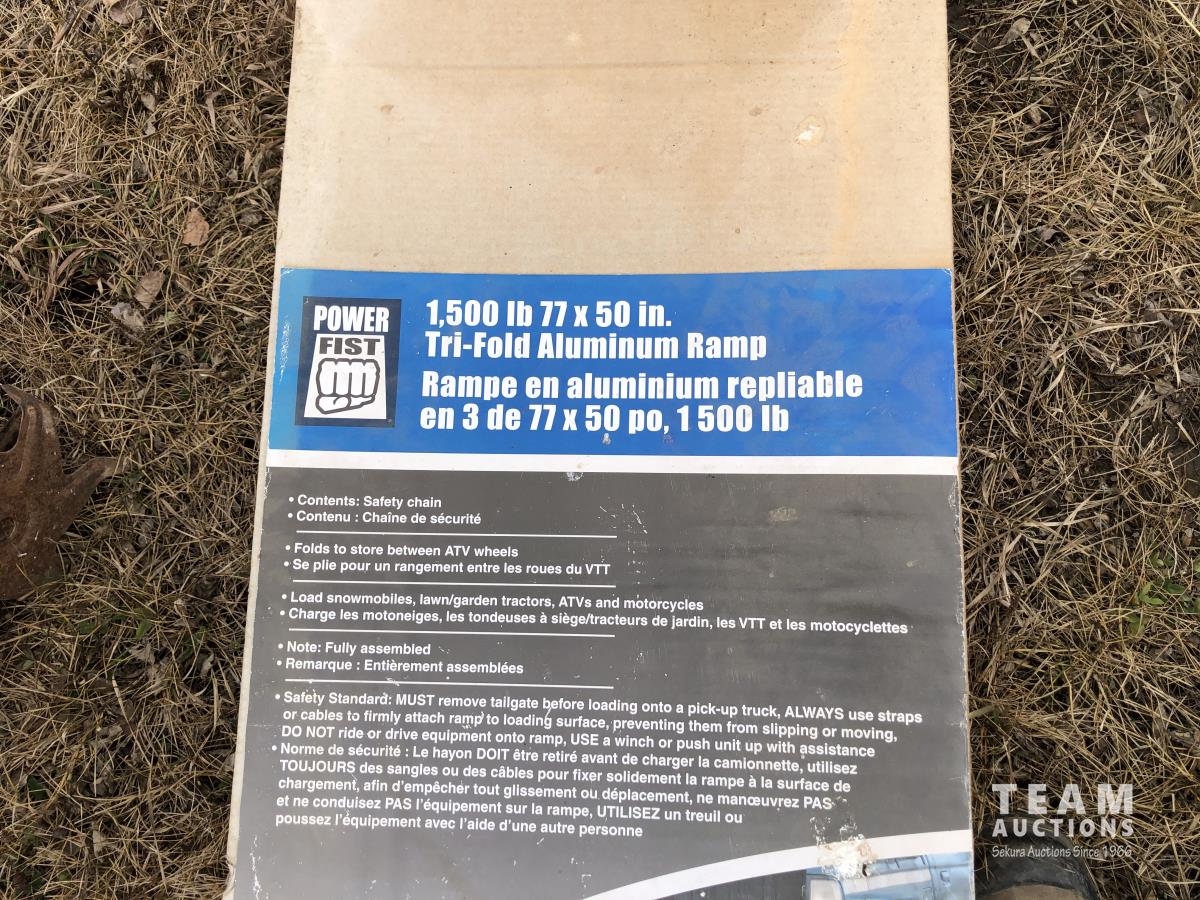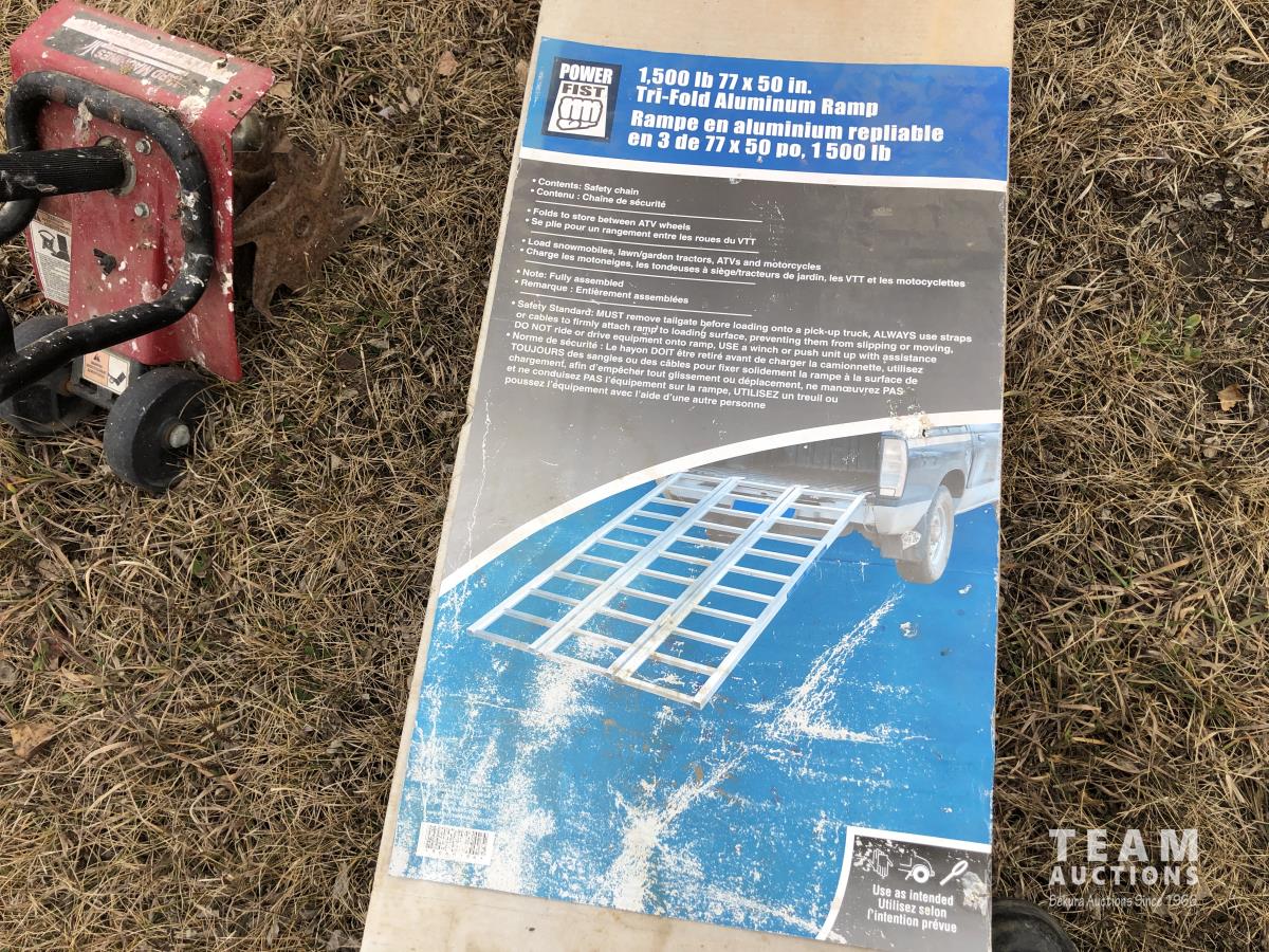 149 1500 lb Tri Fold Aluminum Ramps & Yard Machine Rotary Tiller (Inoperable)