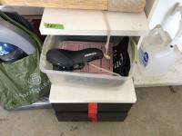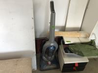 Blanket chest, Dirt Devil vacuum, 24 inch roller blind, shelf