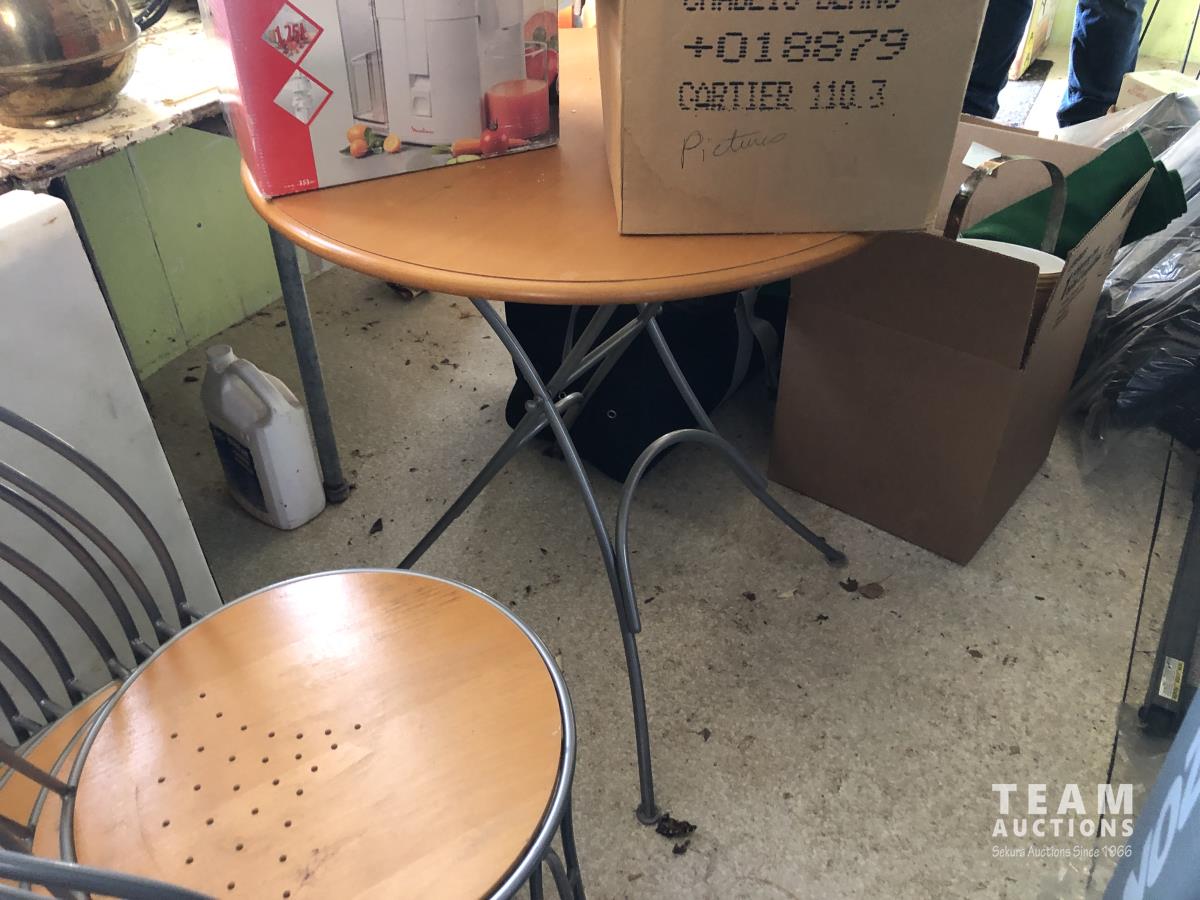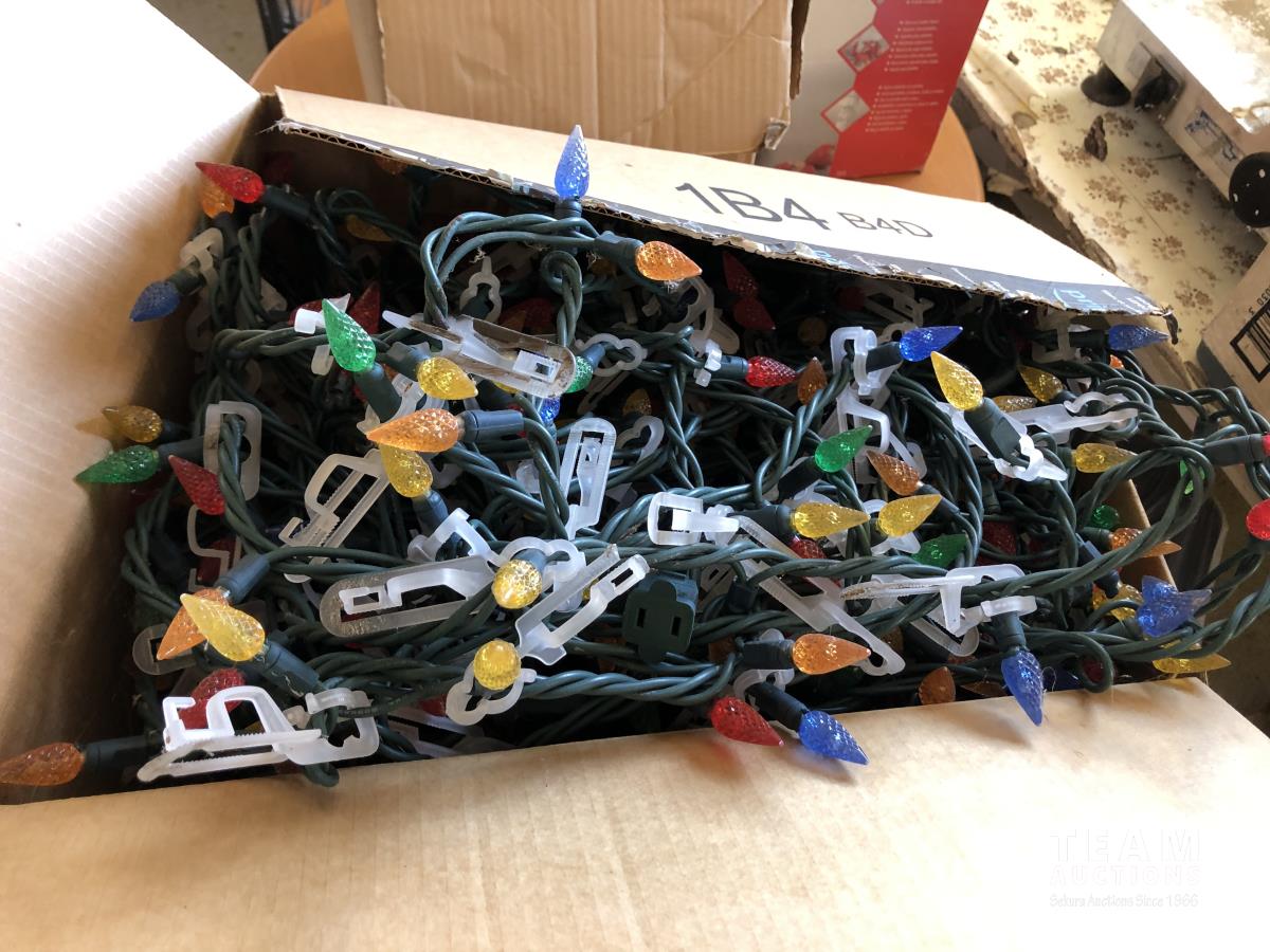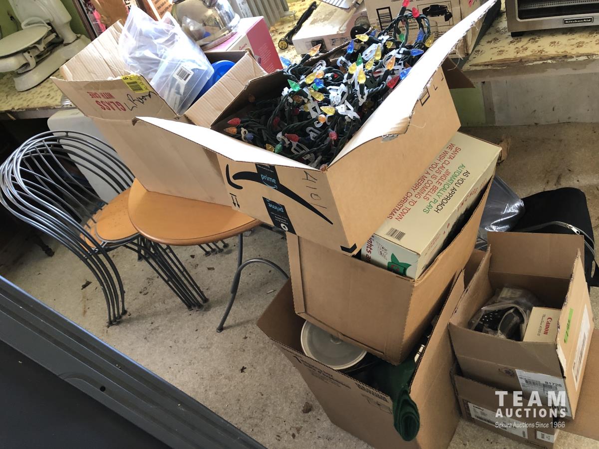Patch cords, Christmas decorations, table, sleeping bag, juicer, barometer, (4) stacking chairs, miscellaneous household items