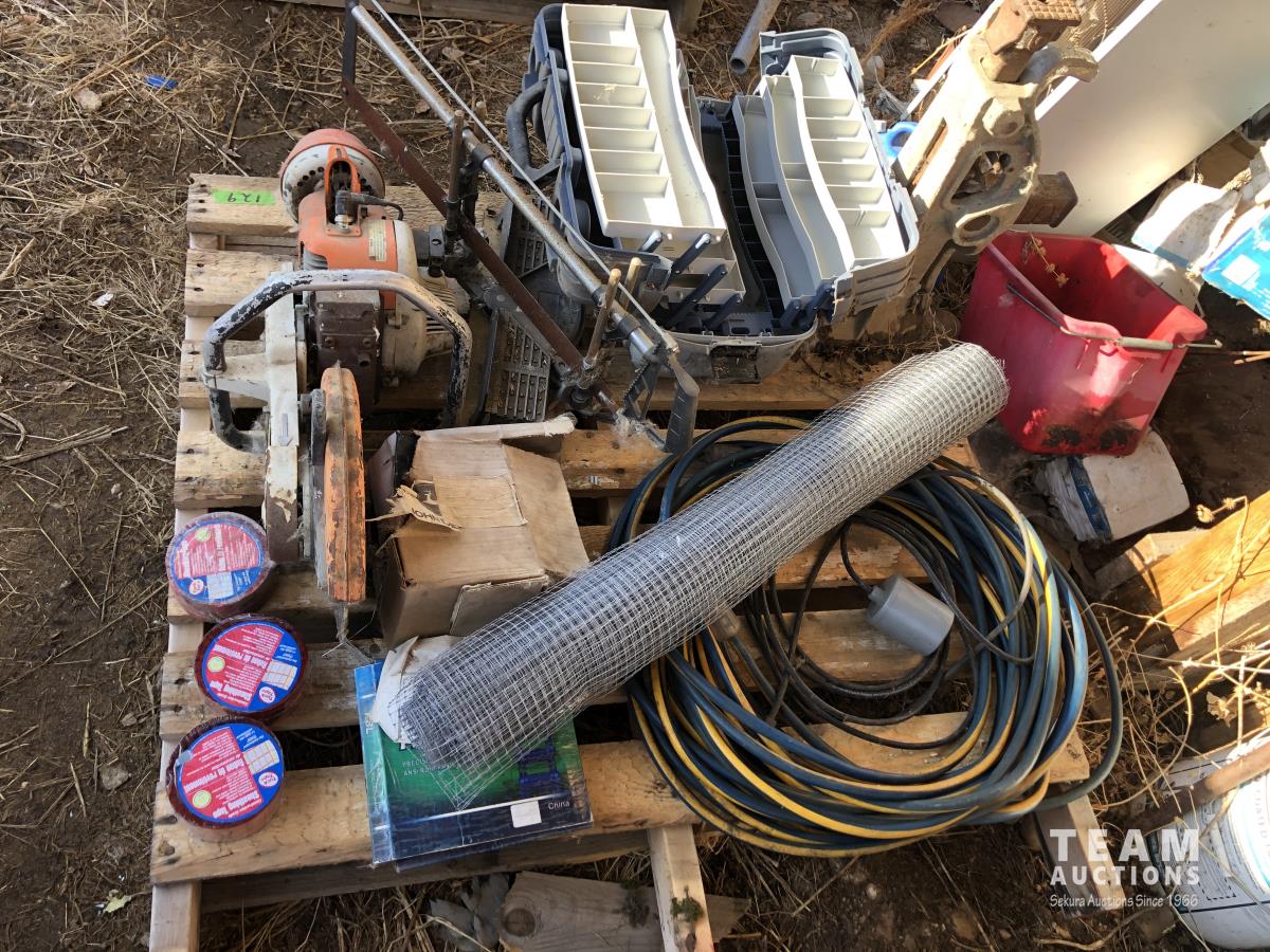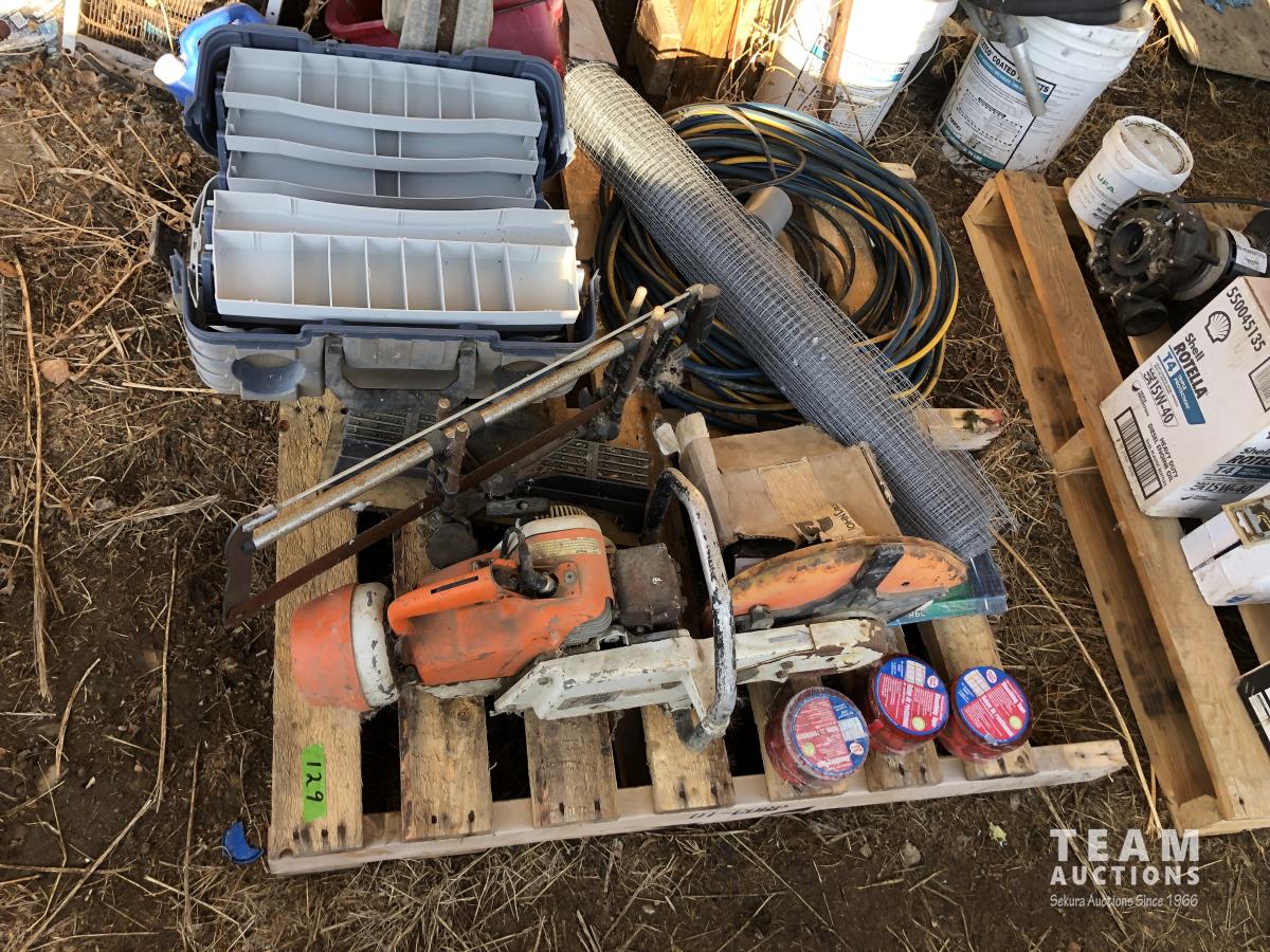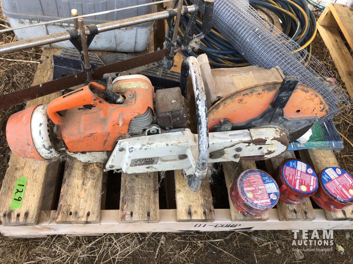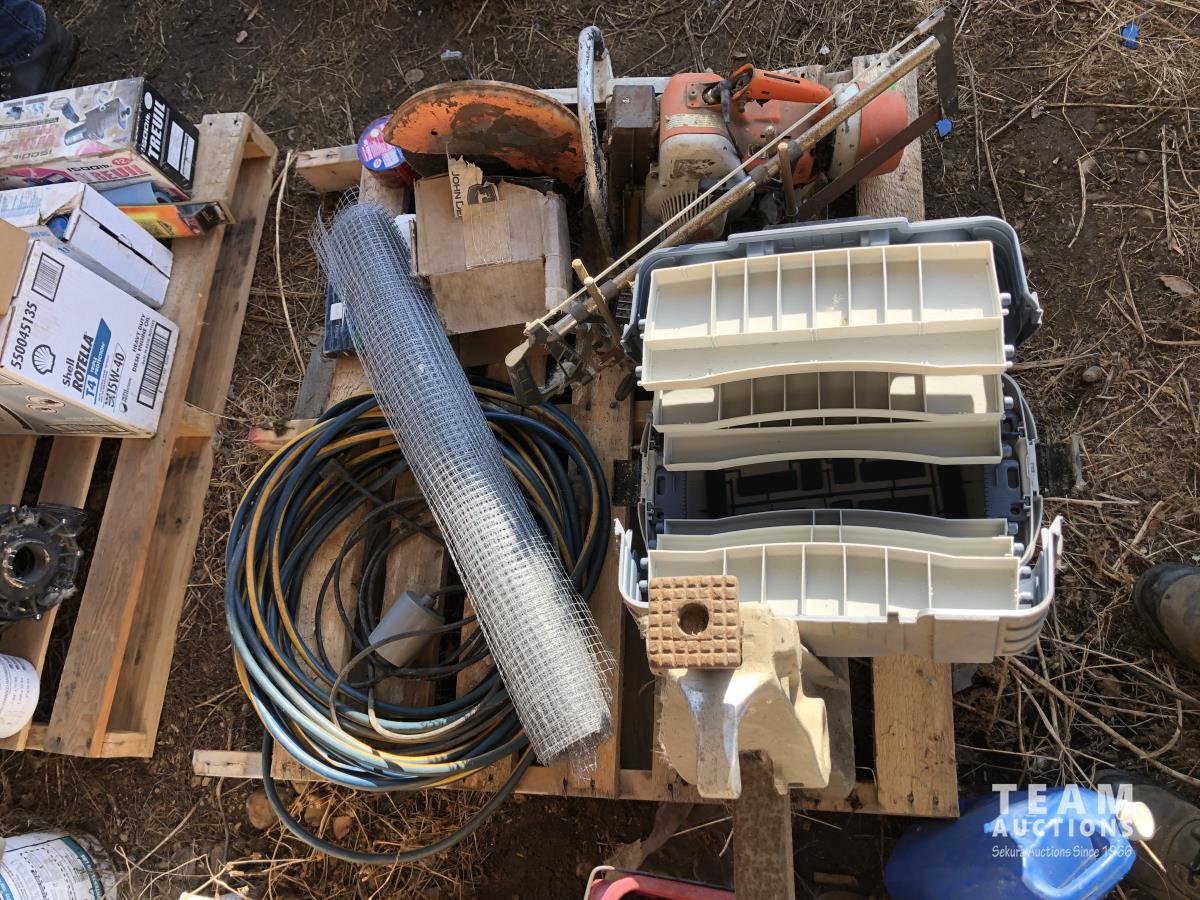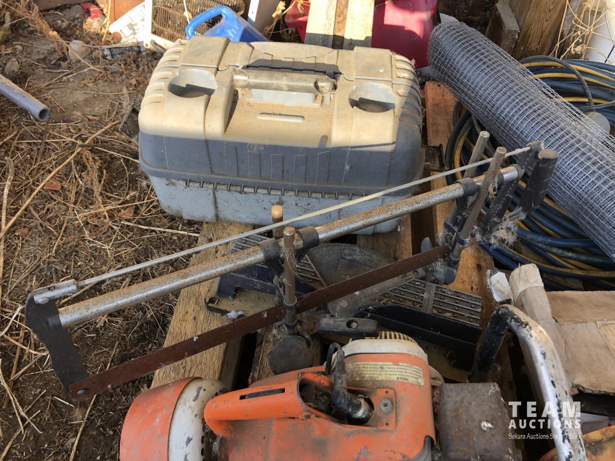 Jack, tackle box, extension cords, Stihl gas chop saw, tuck tape