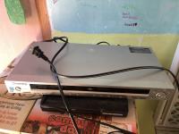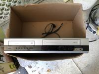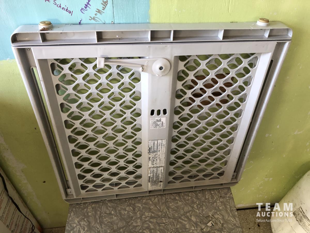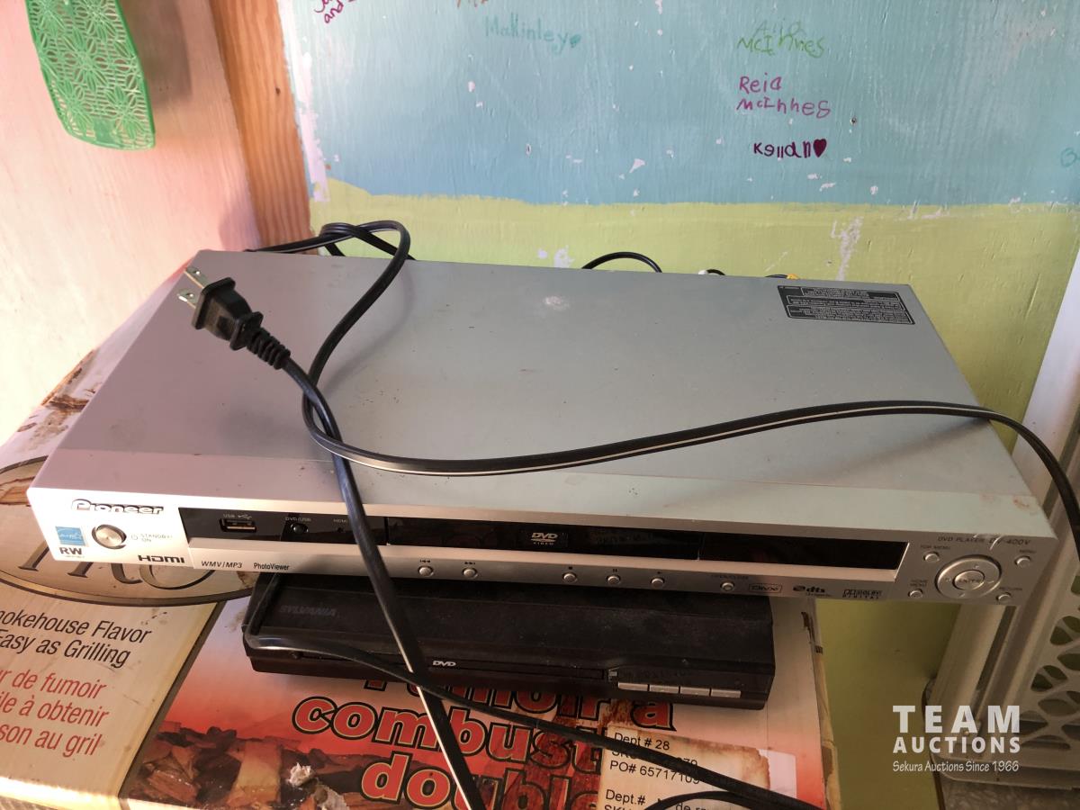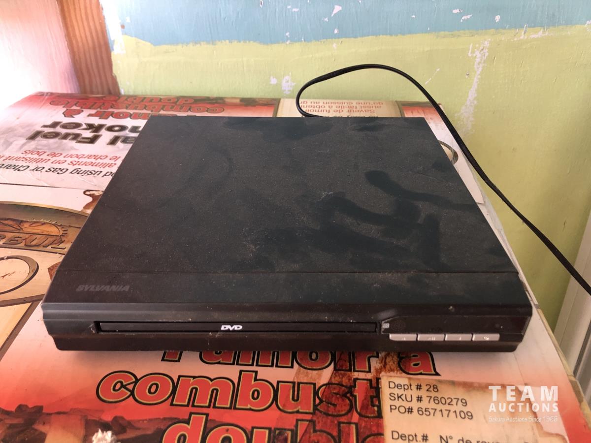 Table, baby gate, (2) DVD players, (1) DVD with VHS