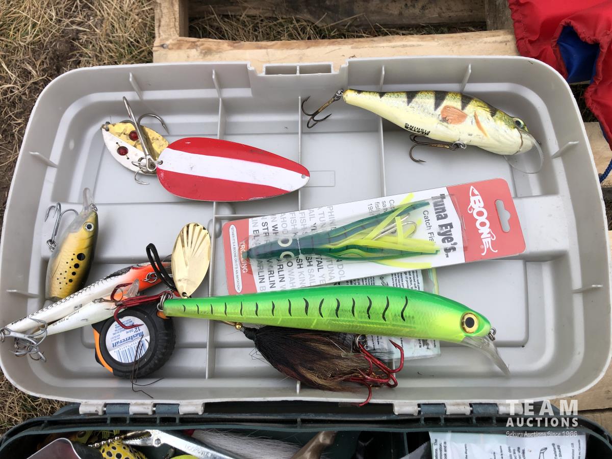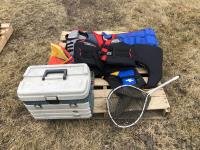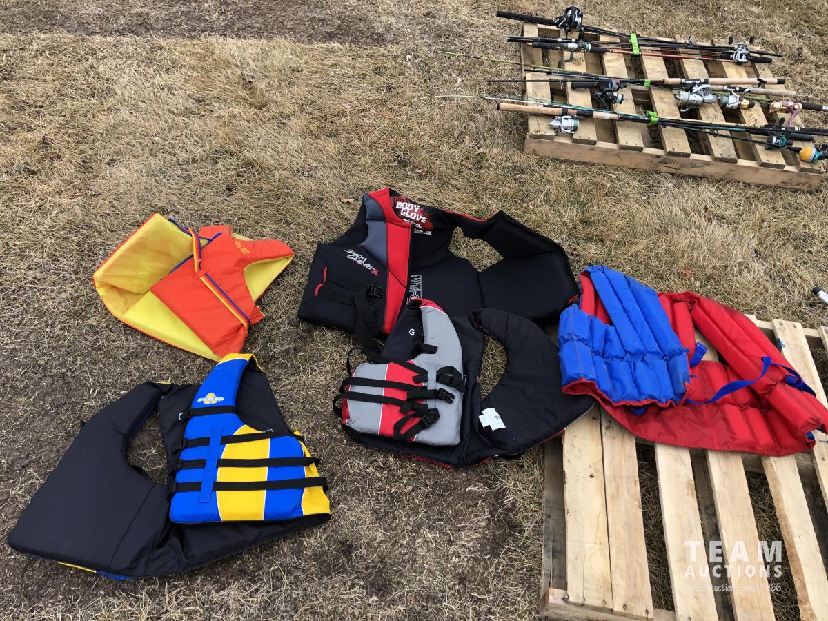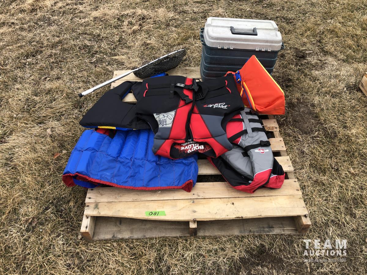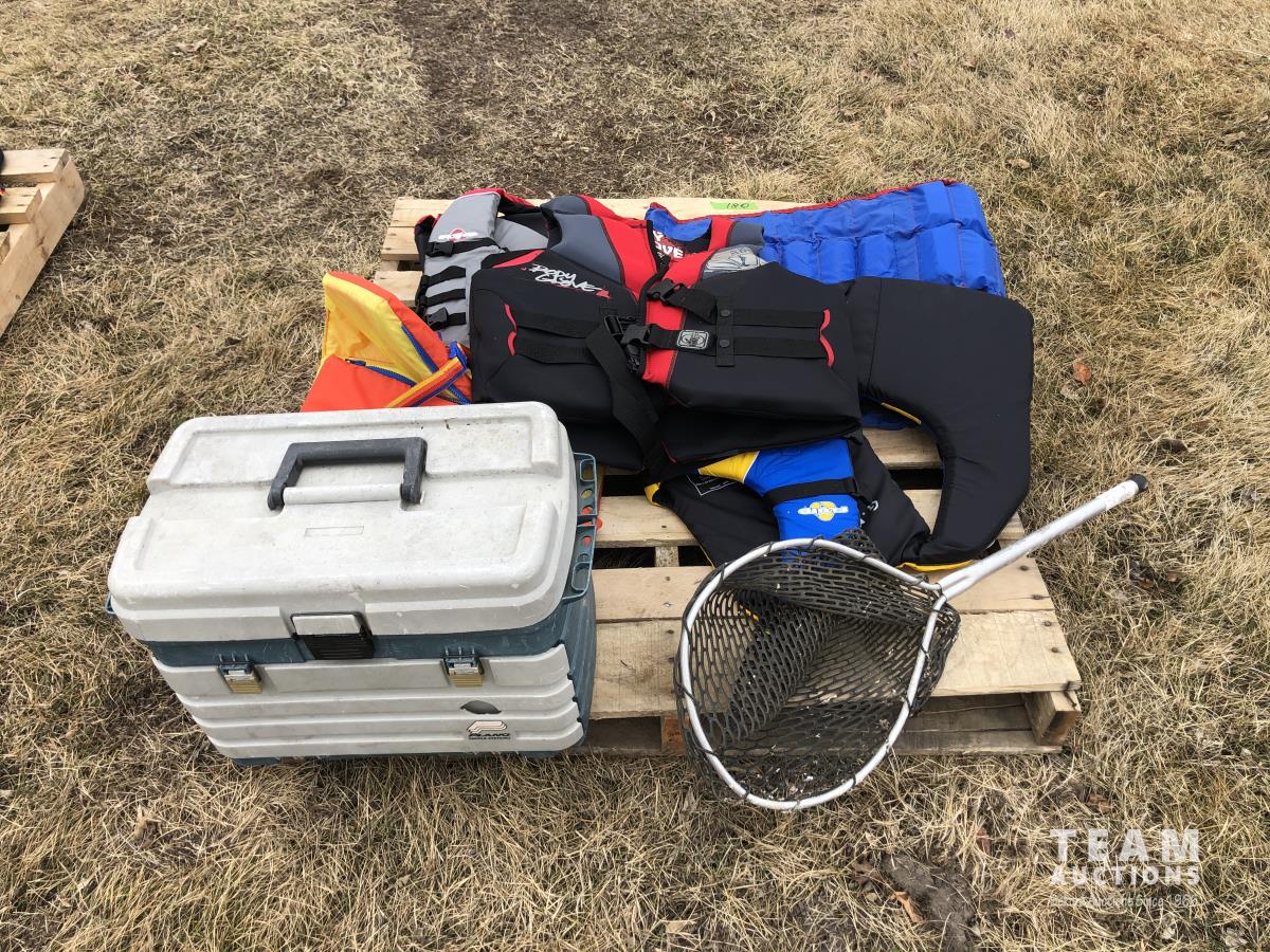 (5) life jackets, fishing net, tackle box with contents