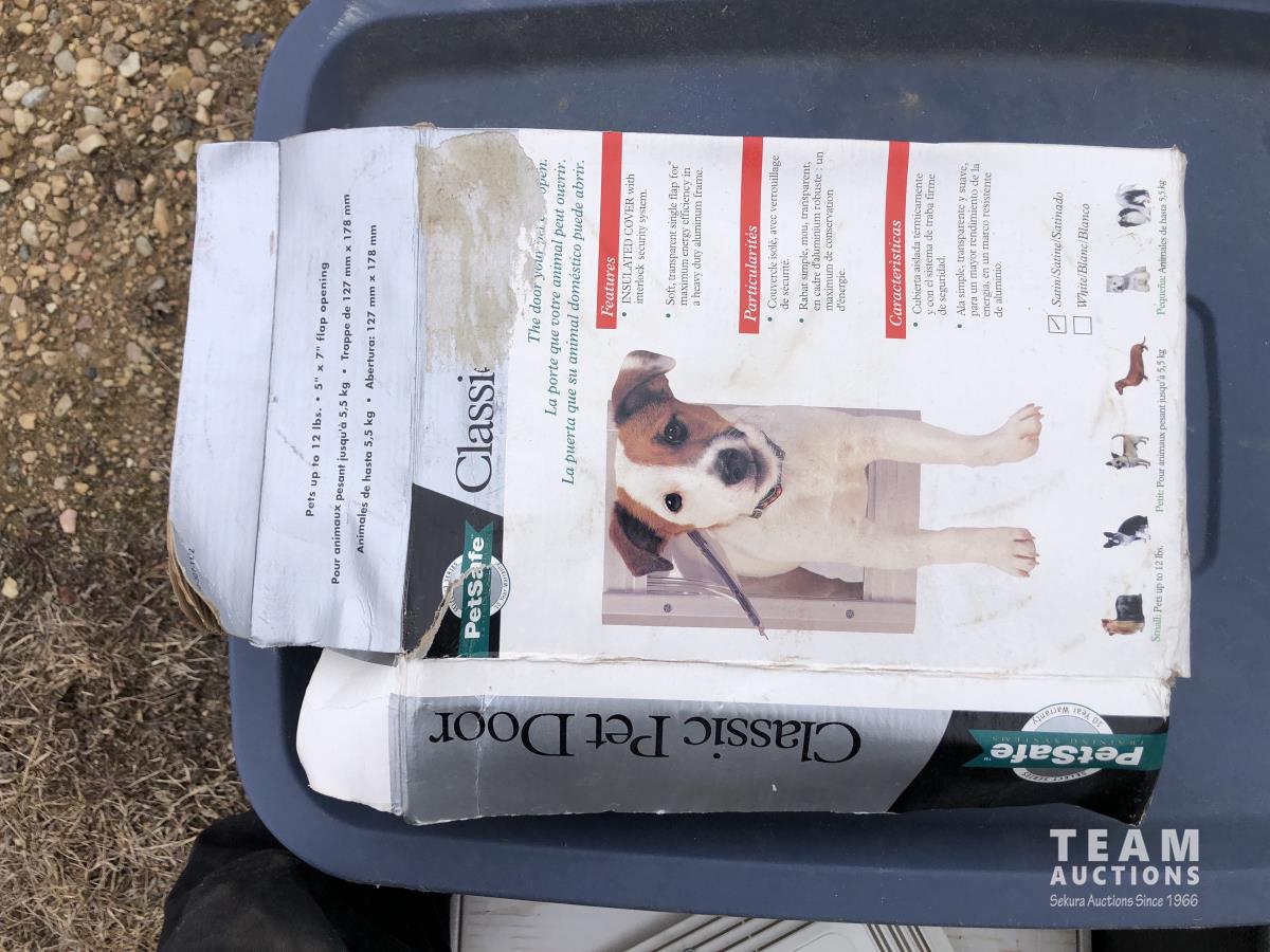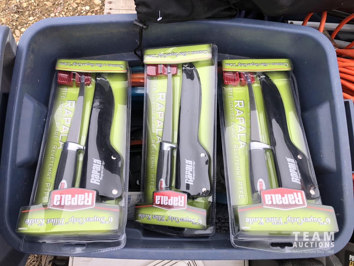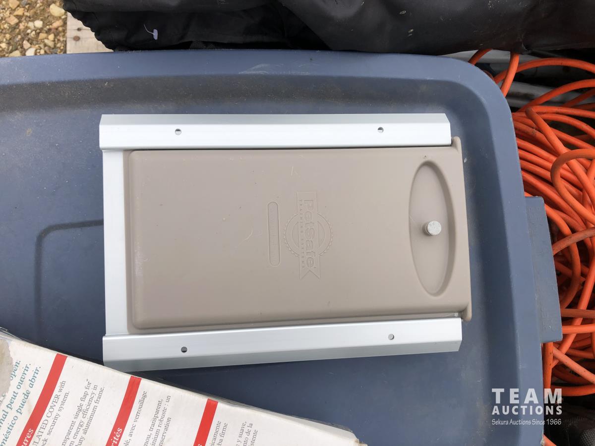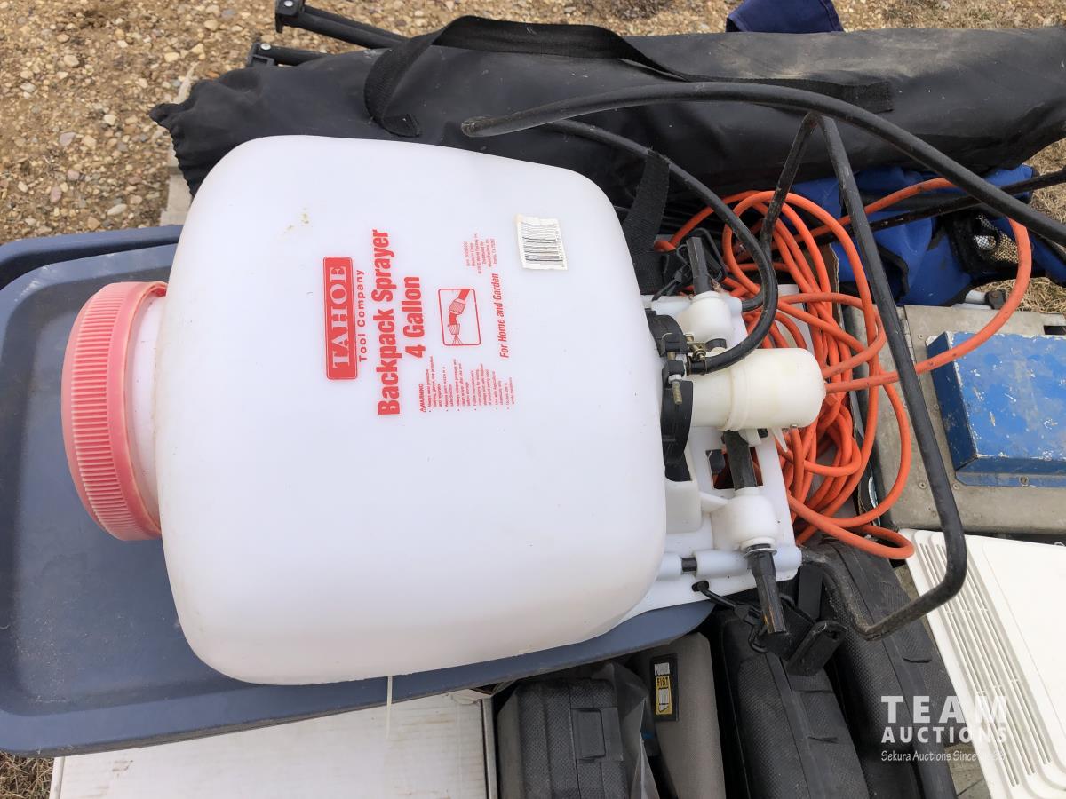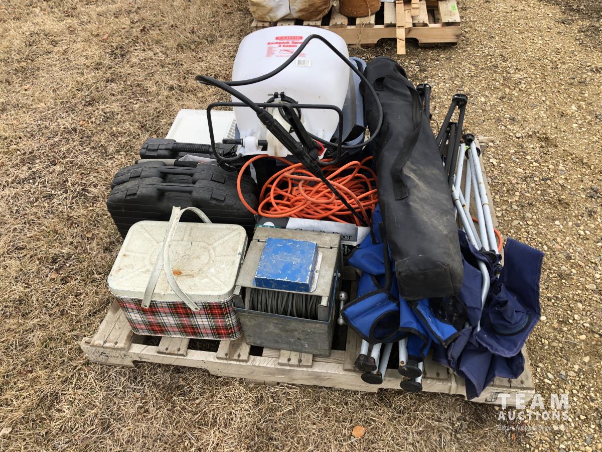 Lock box, 4 gallon sprayer, assortment of lawn chairs, pet door, tool kit (unused), spool wire, filleting knives (unused)