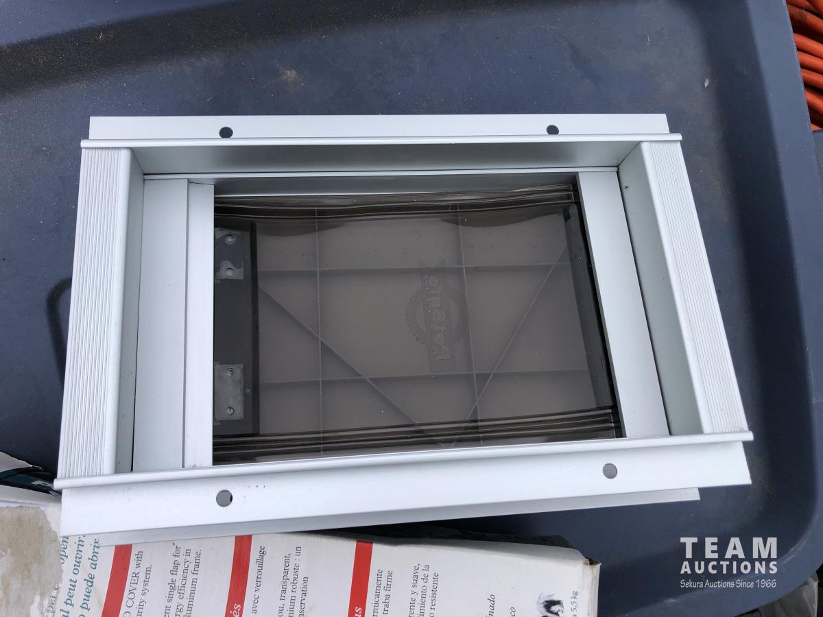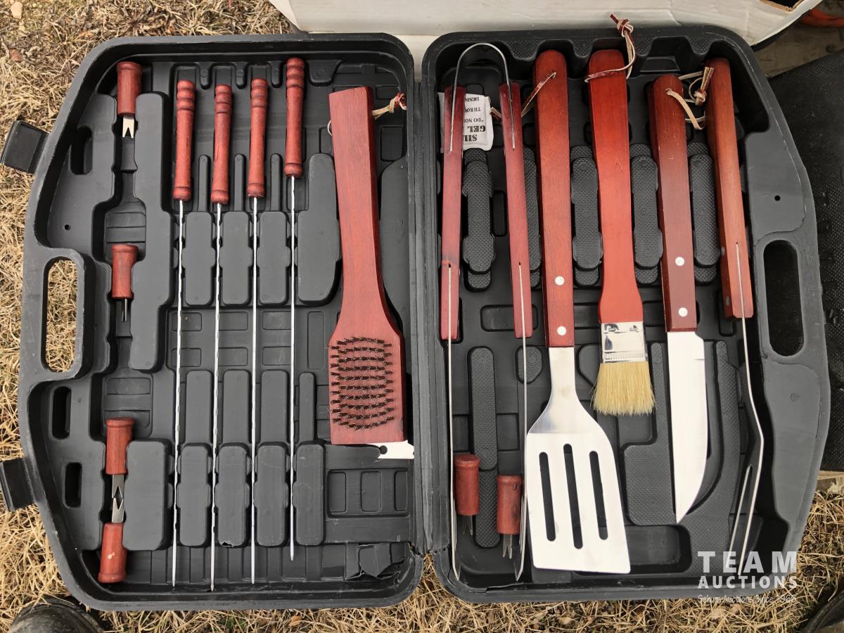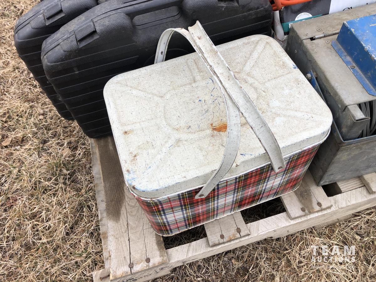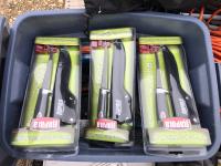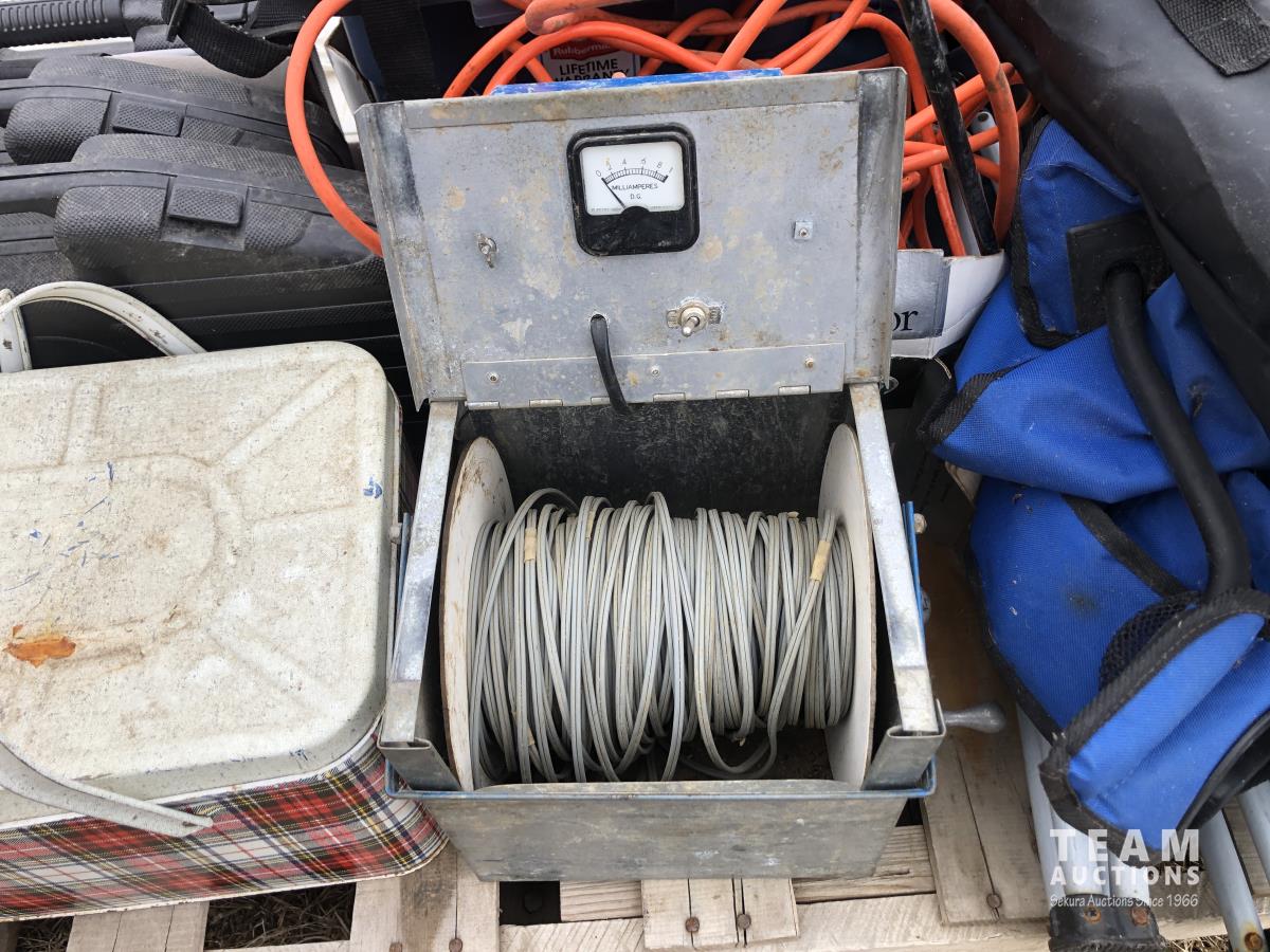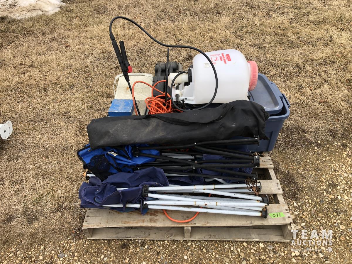 Lock box, 4 gallon sprayer, assortment of lawn chairs, pet door, tool kit (unused), spool wire, filleting knives (unused)