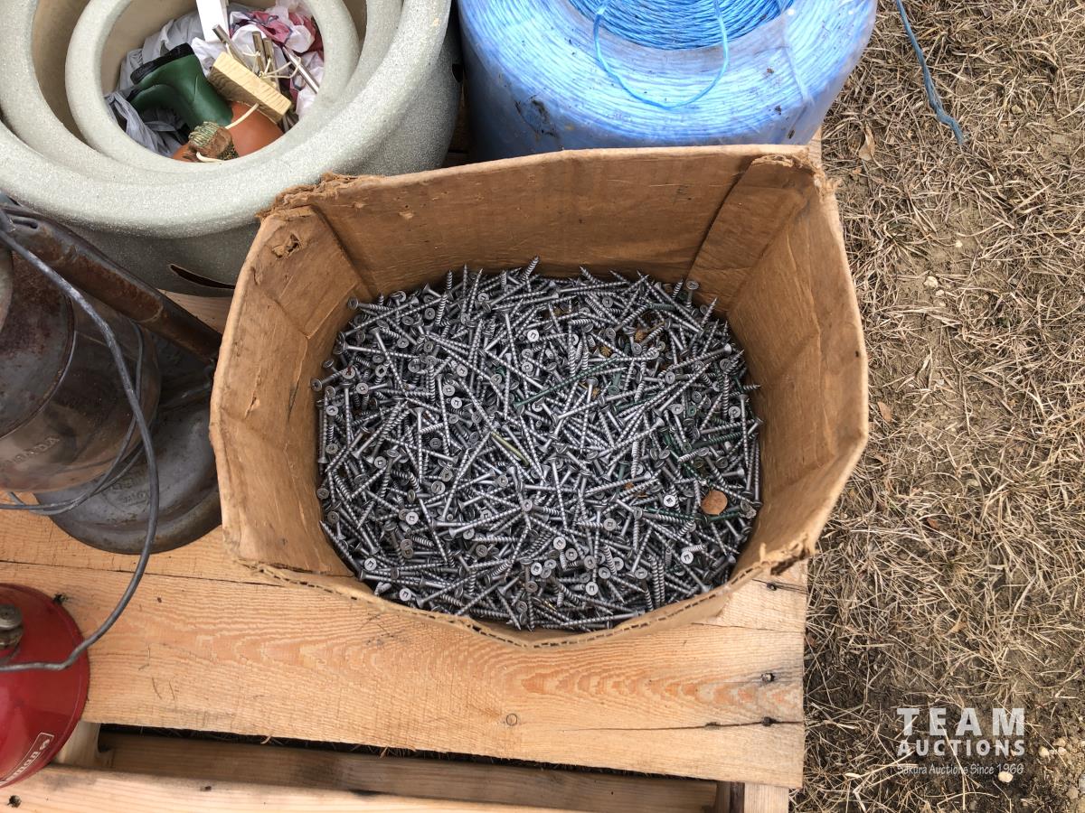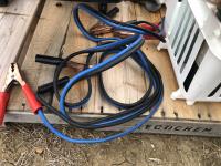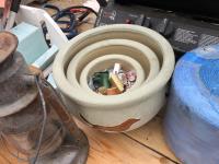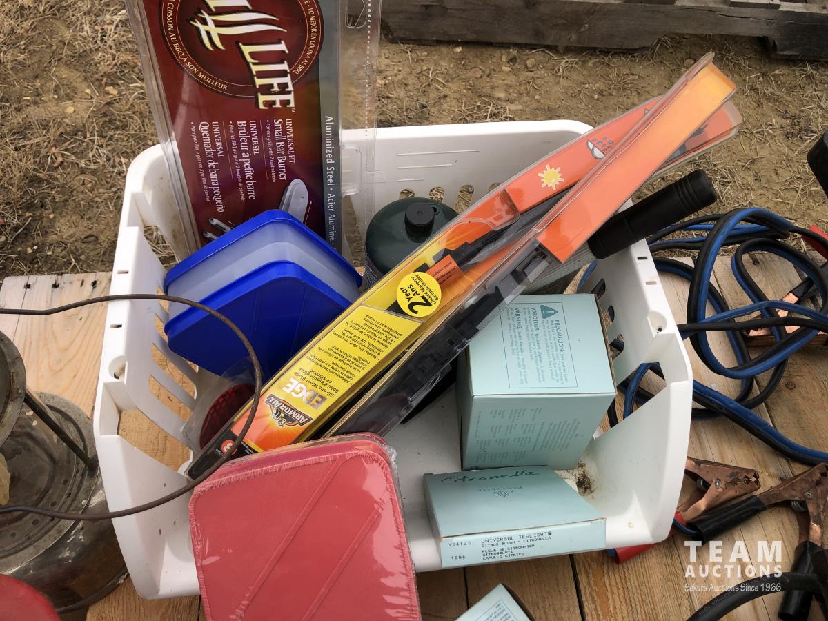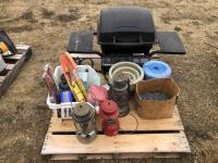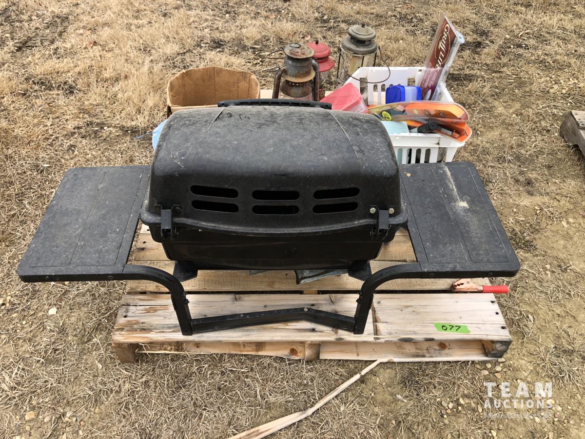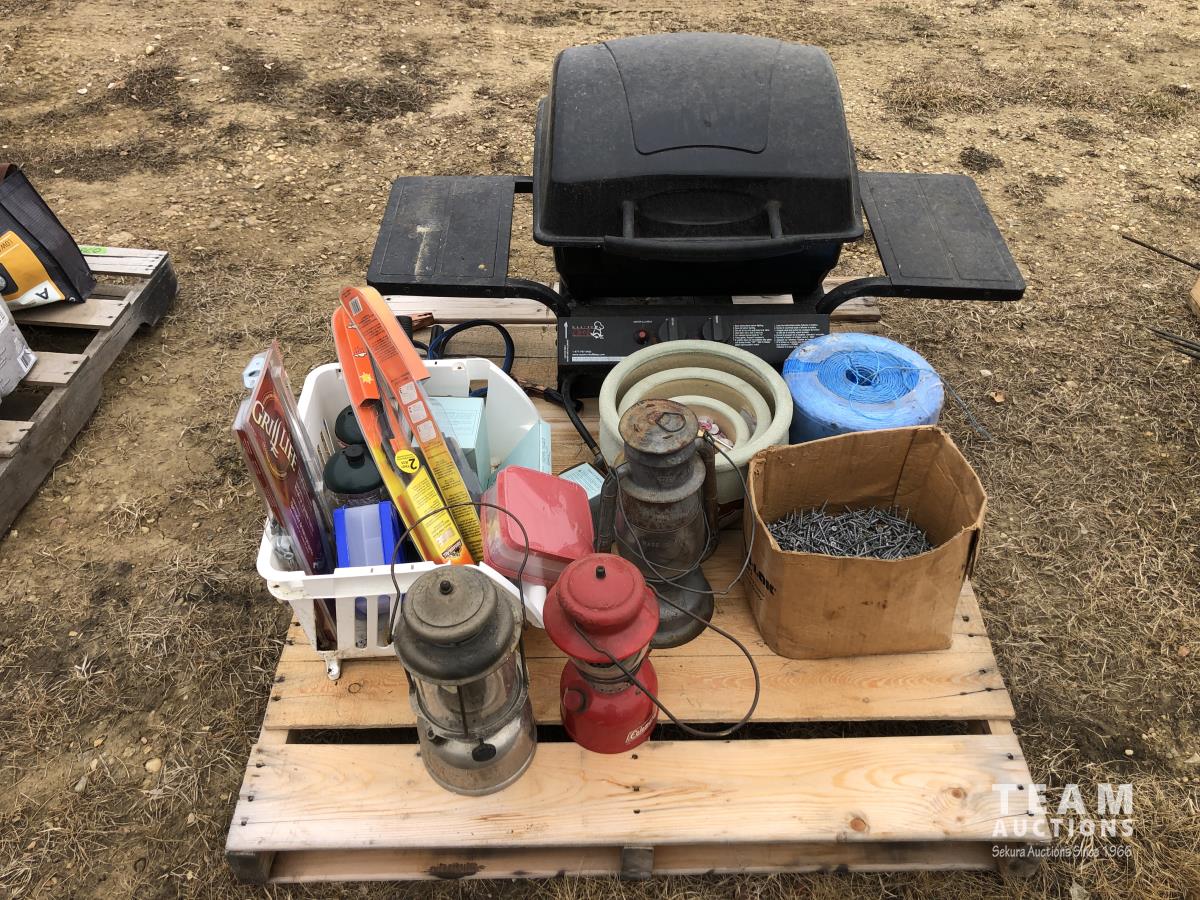 Gas BBQ, flower pot, roll baler twine, part box of screws, assorted party lights, booster cables, miscellaneous