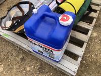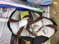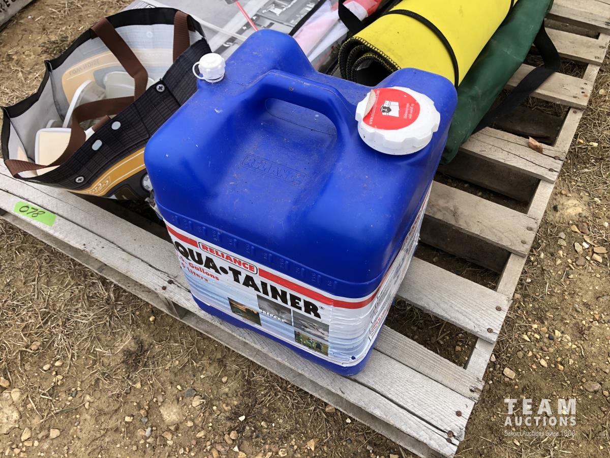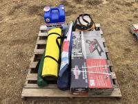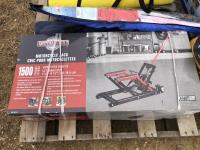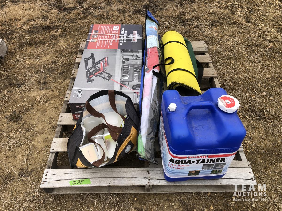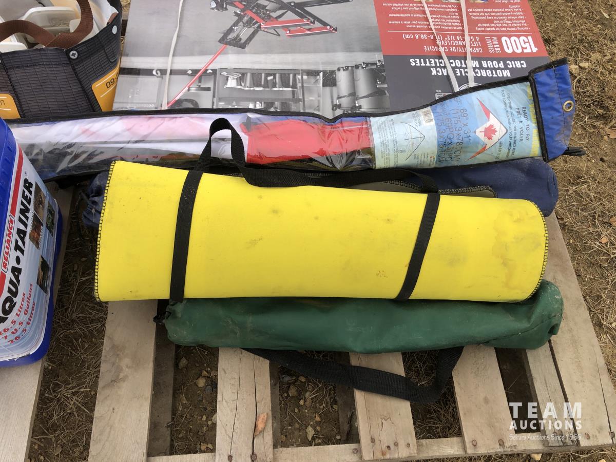 1500 lb motorcycle jack (unused), assorted potpourri, water bottle, lawn chairs, kite