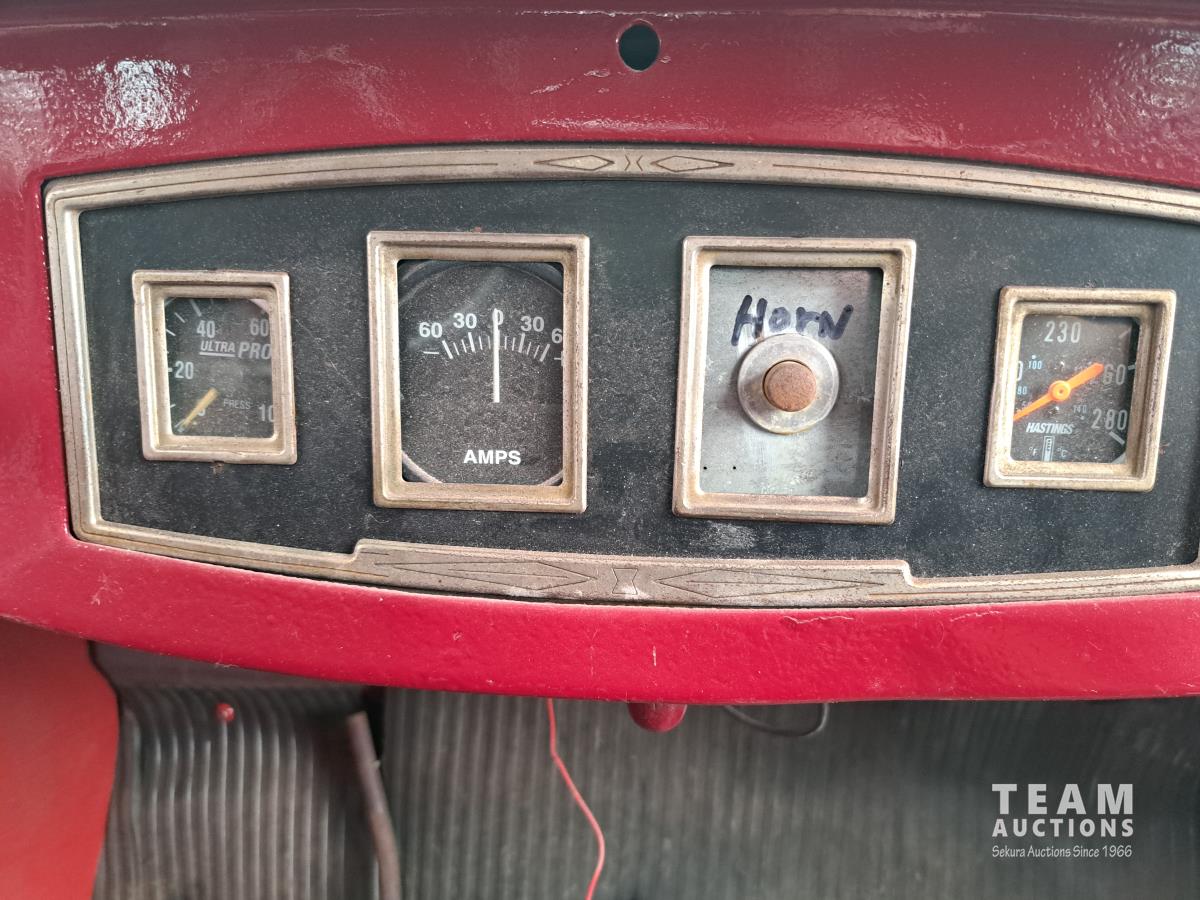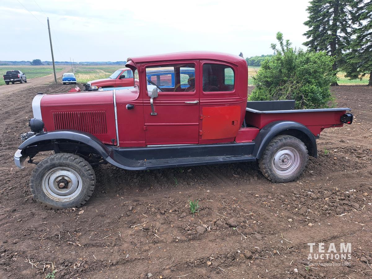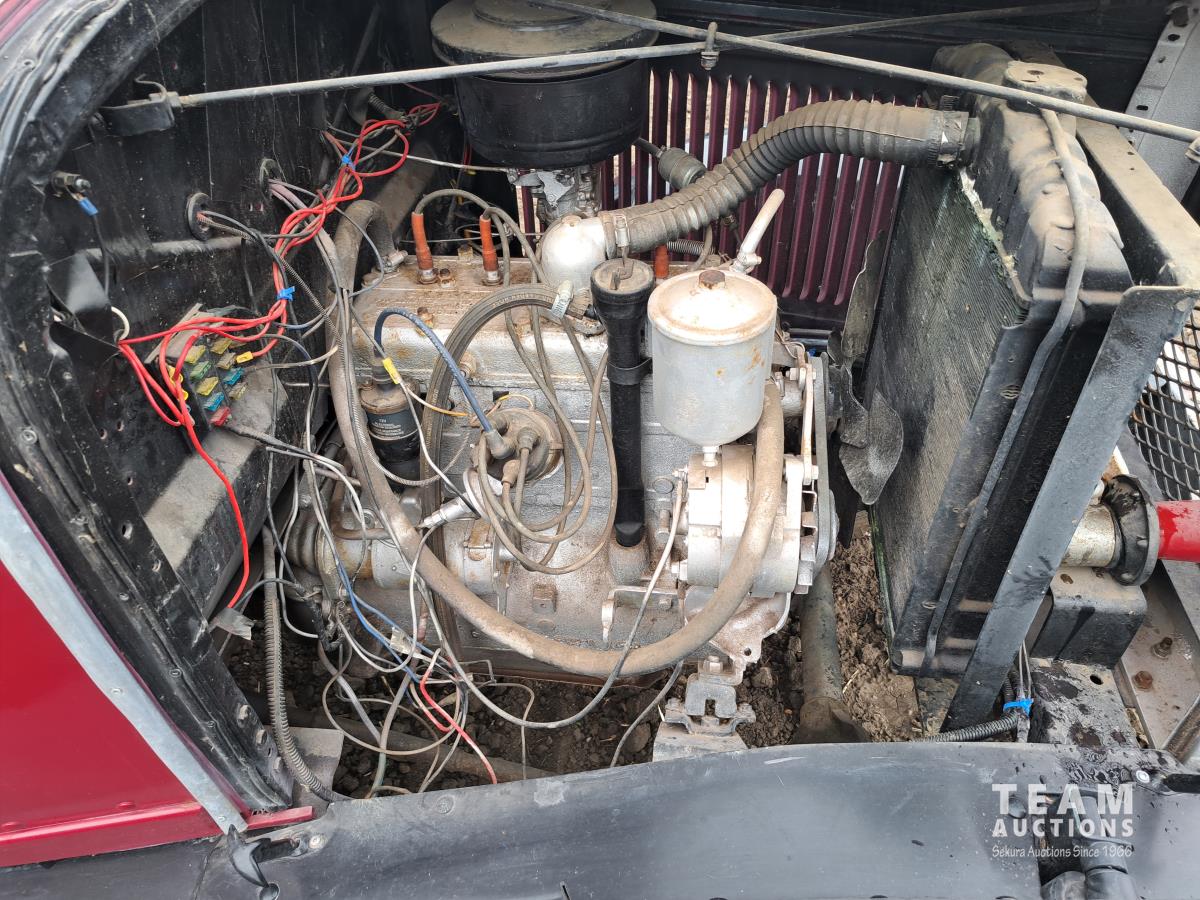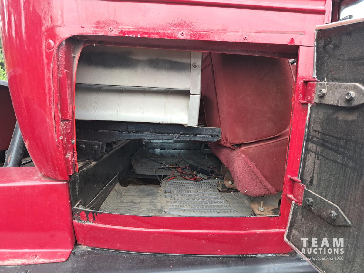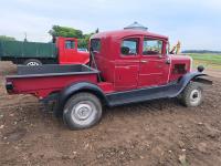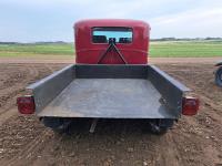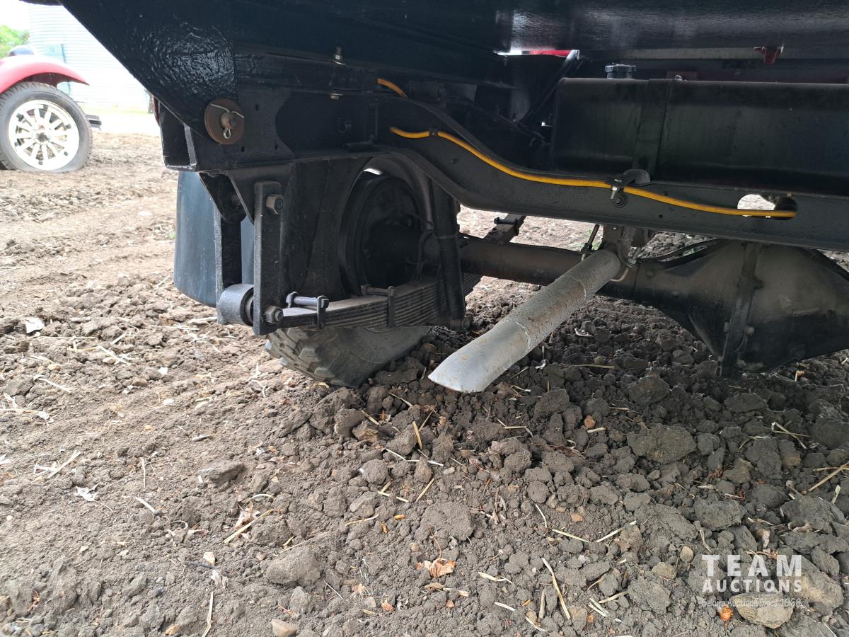 4 cylinder flathead gas engine, 3 speed transmission, high and low range, car body converted into a extended cab, P/L, P/W, power steering, cable winch dump box, 6.00-16ZLT tires