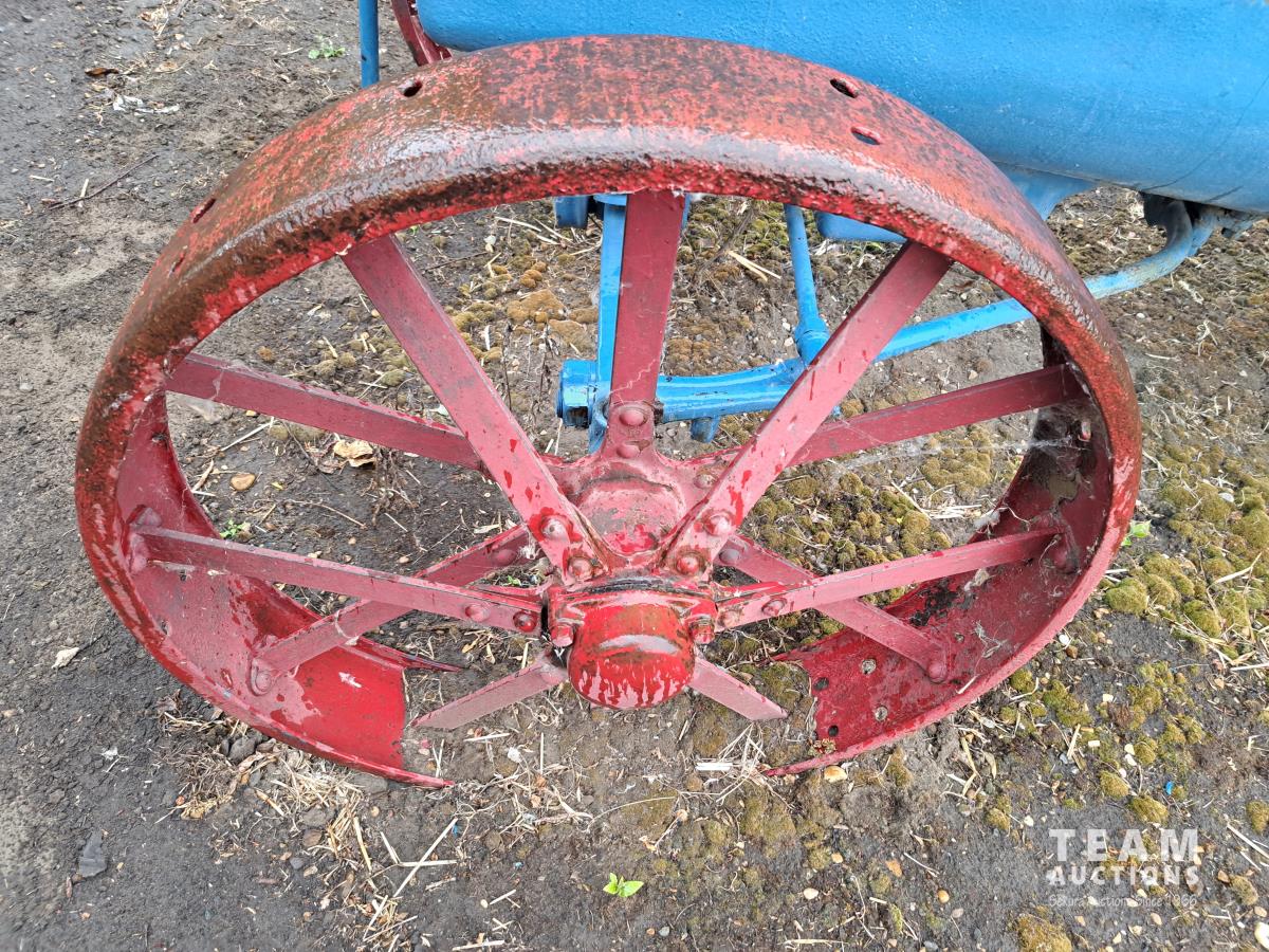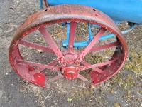 4 cylinder gas engine, 3 speed transmission, belt pulley, hand clutch, steel wheels