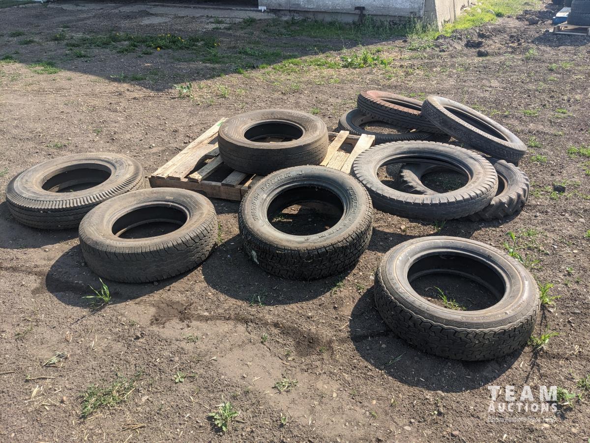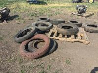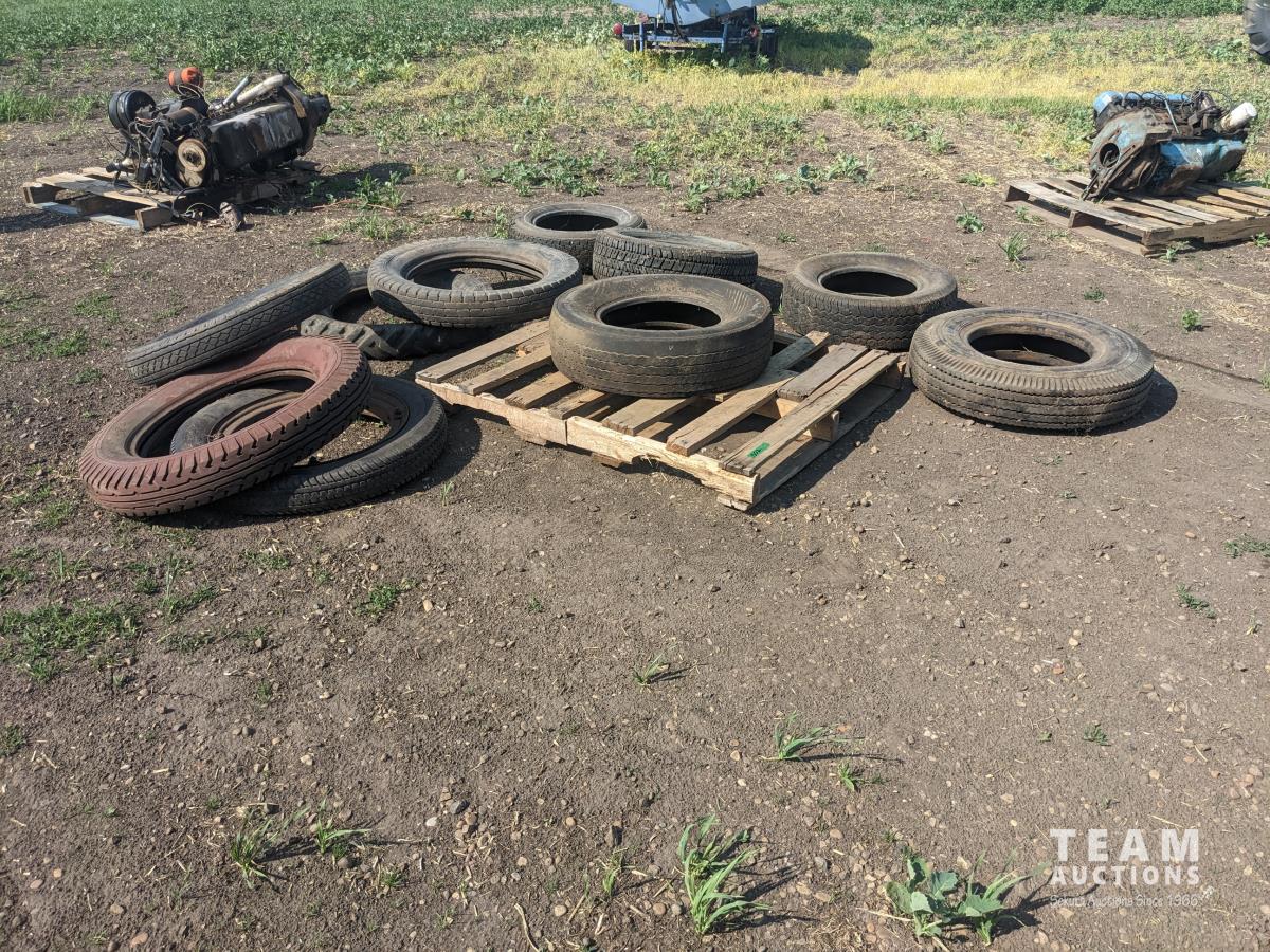 (1) 4.75-19, (1) 4.75/5.00-20 with rim, (1) 47//500-20 tire, (2) 5.25/5.50-20, (1) 215/65R15, (1) 175SR15, (1) 215/70R14, (1) H78-15