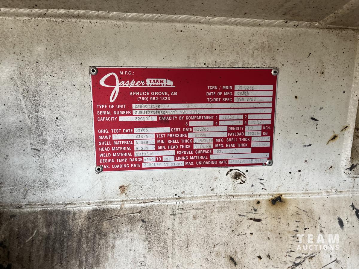 Caterpillar C15 14.6 L L6 500 HP diesel engine, Eaton Fuller 18 speed manual transmission, air ride driver seat, 2003 Jasper Cargo tank, air ride suspension, 20,000 lb front axle, 52,000 lb rear axles, 260 inch WB, all aluminum wheels, 445/65R22.5 front tires, 11R24.5 rear tires