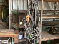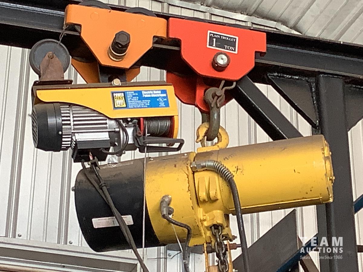 (2) electric hoists, (2) trolleys, 110 volt, cables and control switches, 12 ft high and 11 ft wide