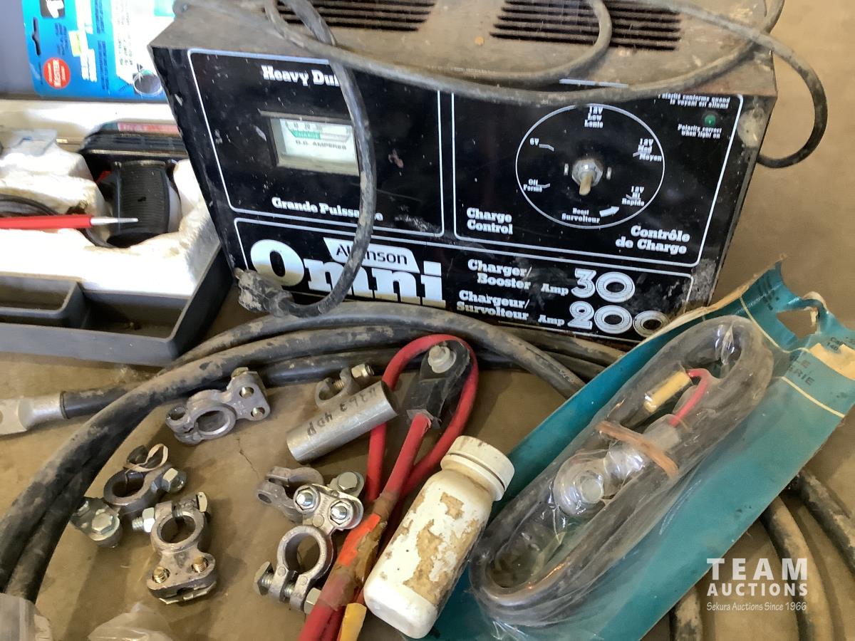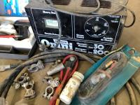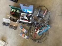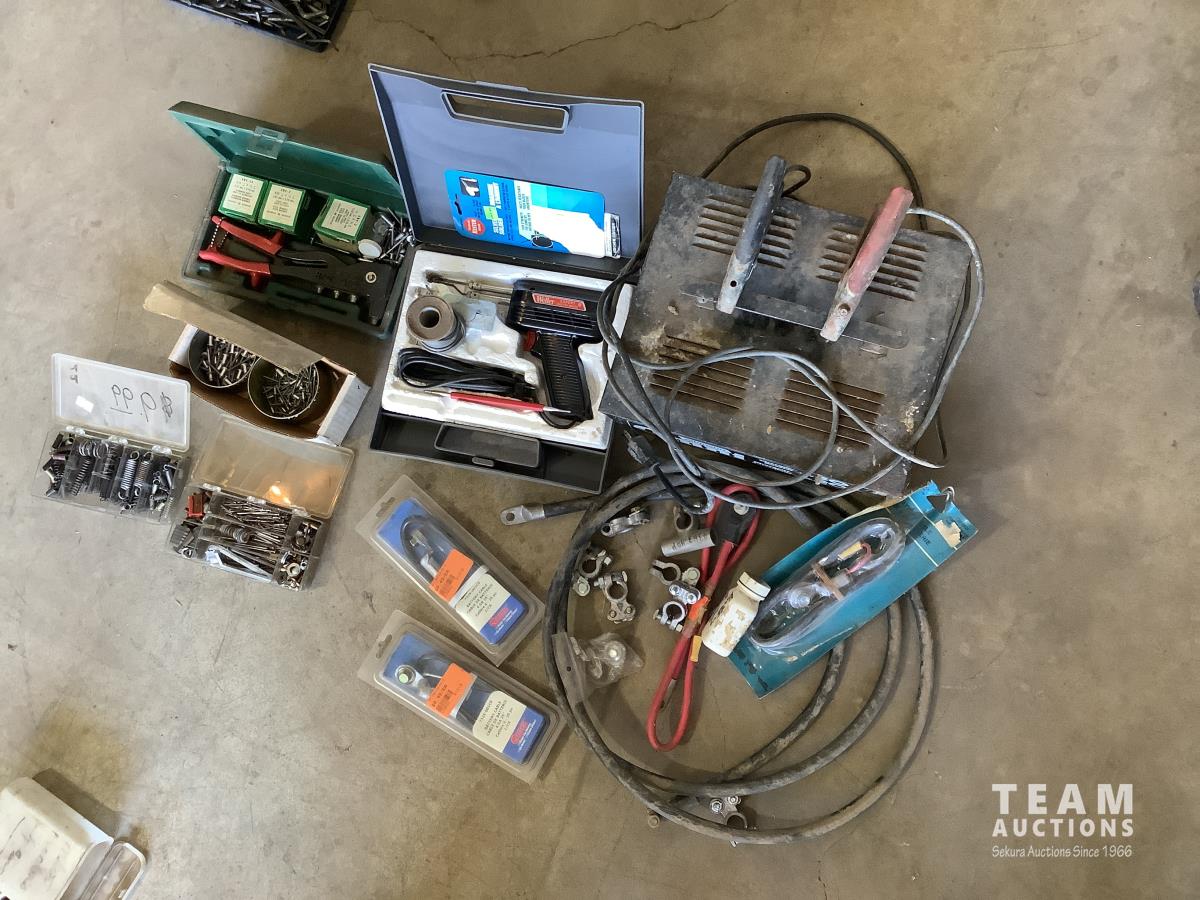 Battery charger, cables, ends, rivet gun