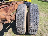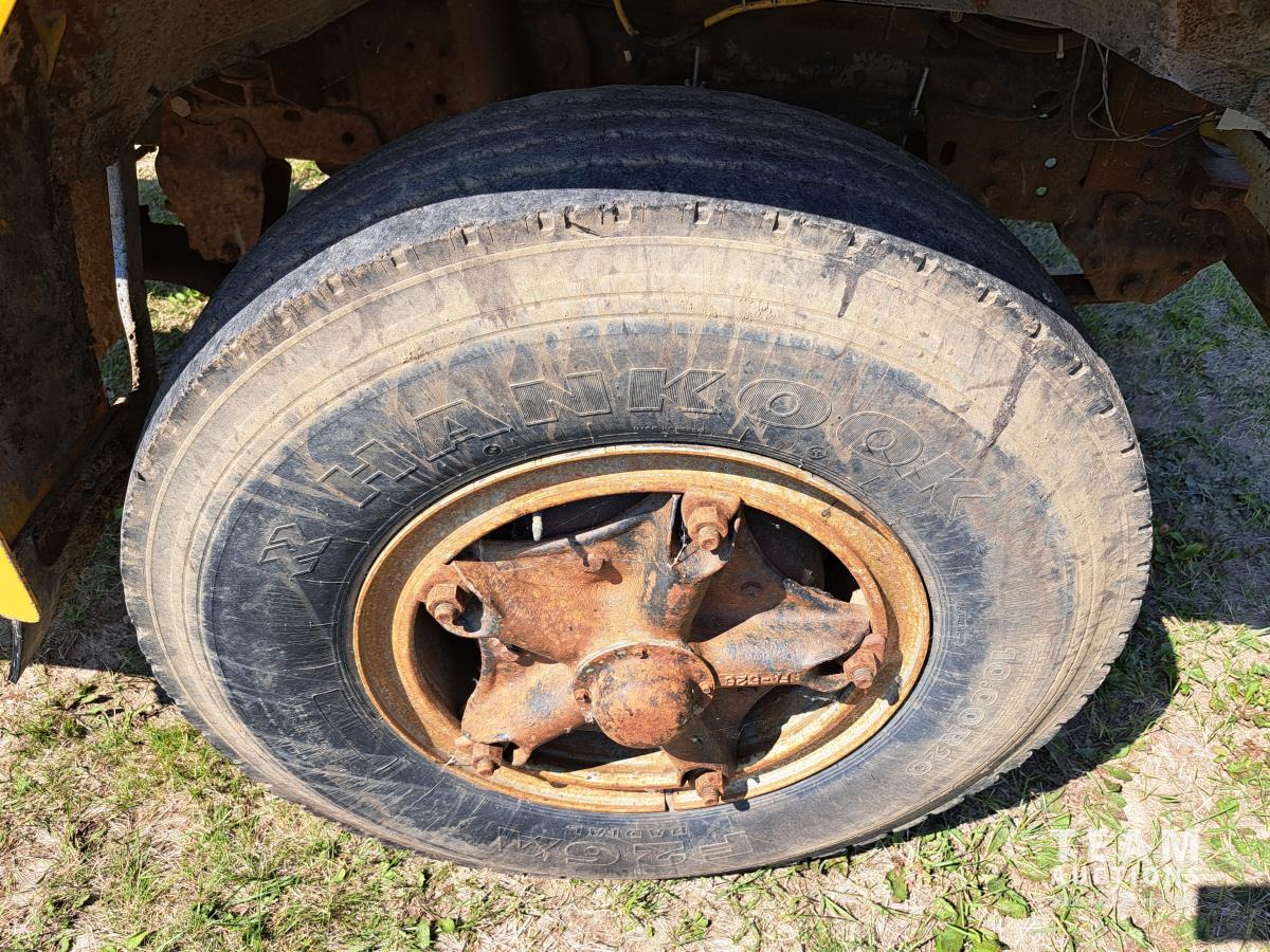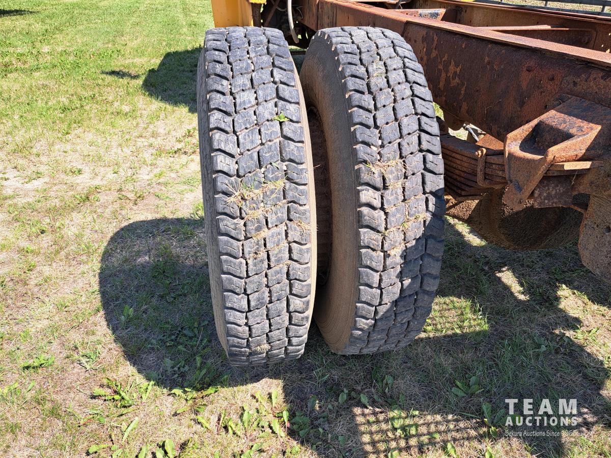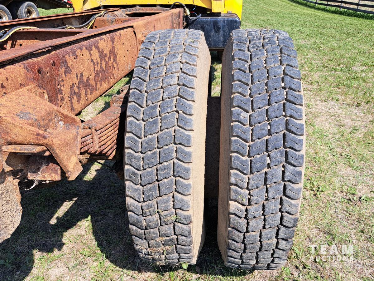 Ford V8 gas engine, 5 speed manual transmission, spring suspension, 10,000 lb front axle, 17,500 lb rear axles, 171 inch WB, 2 speed axle, 10.00R20 tires