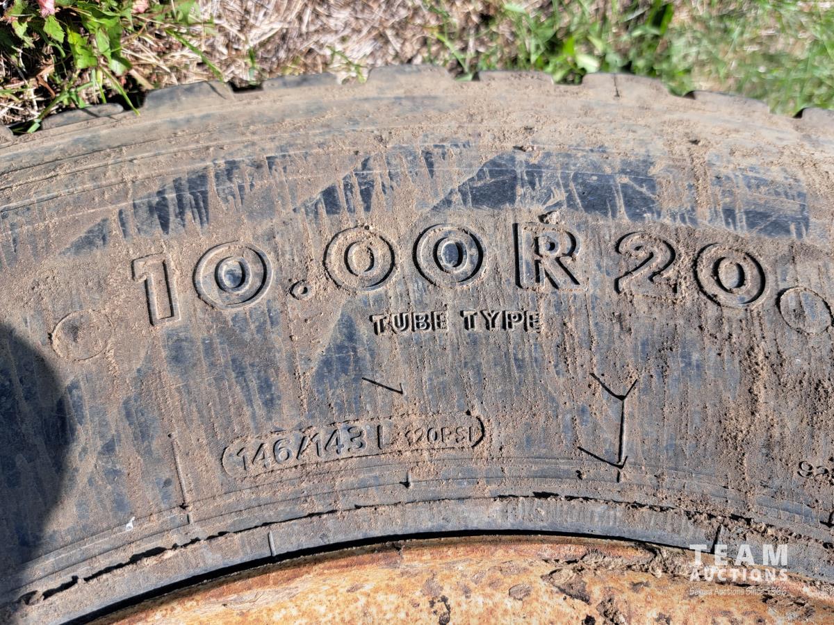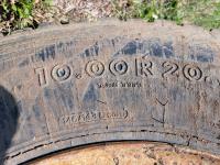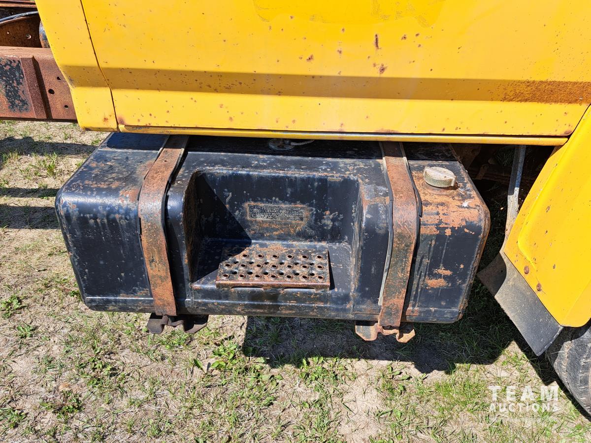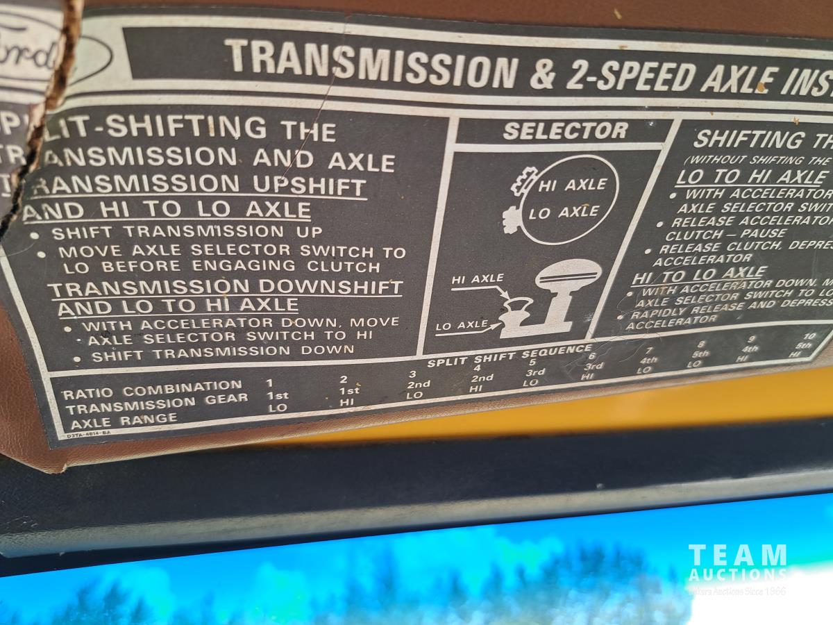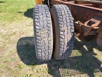 Ford V8 gas engine, 5 speed manual transmission, spring suspension, 10,000 lb front axle, 17,500 lb rear axles, 171 inch WB, 2 speed axle, 10.00R20 tires
