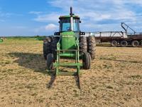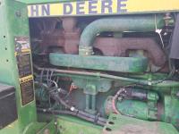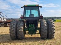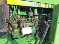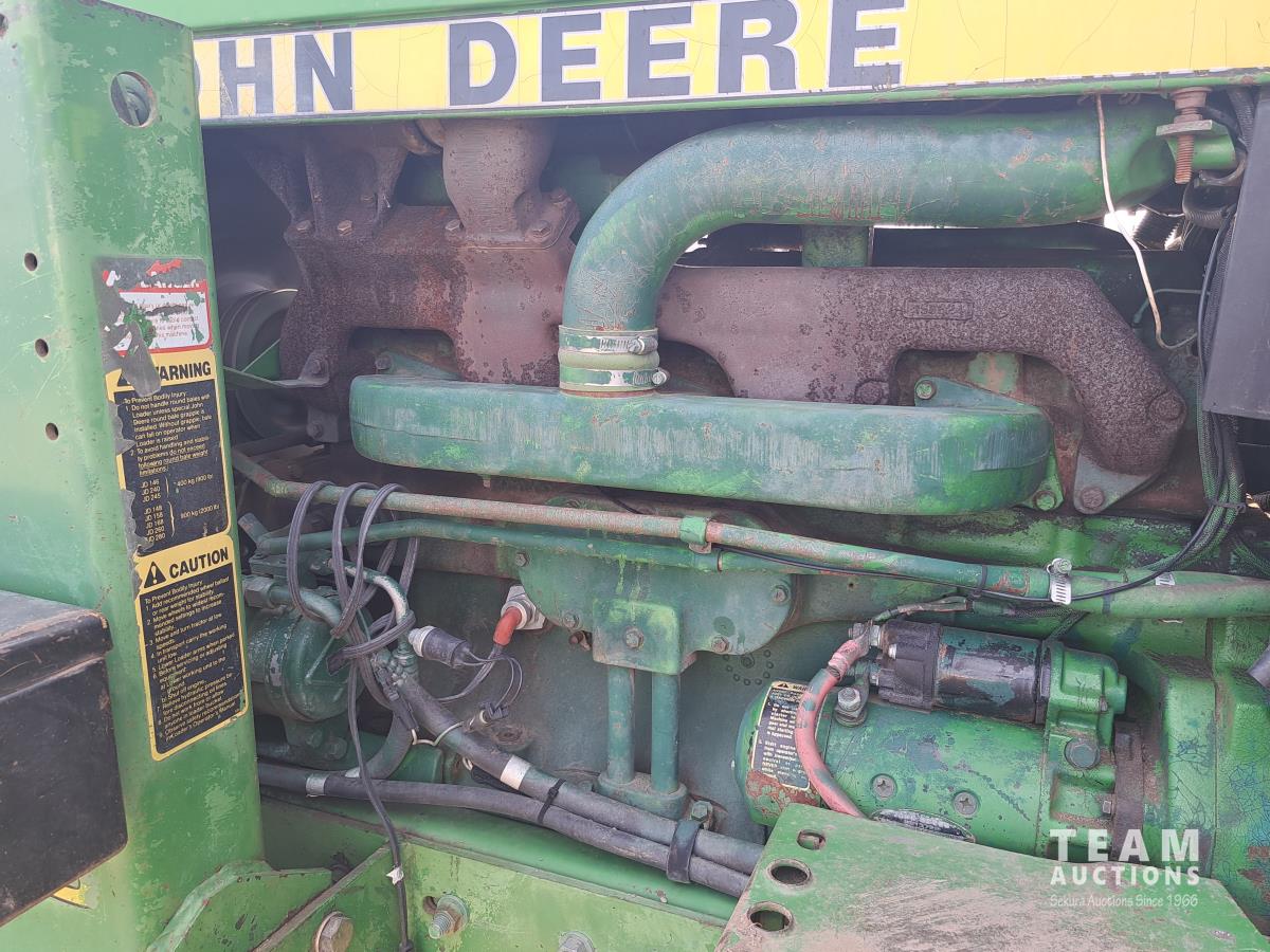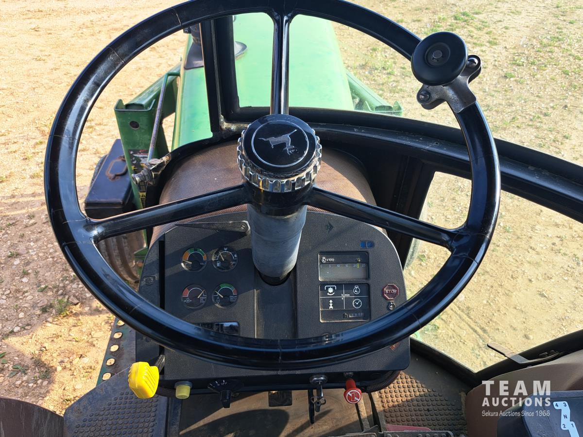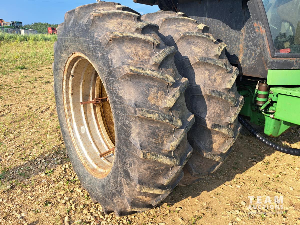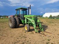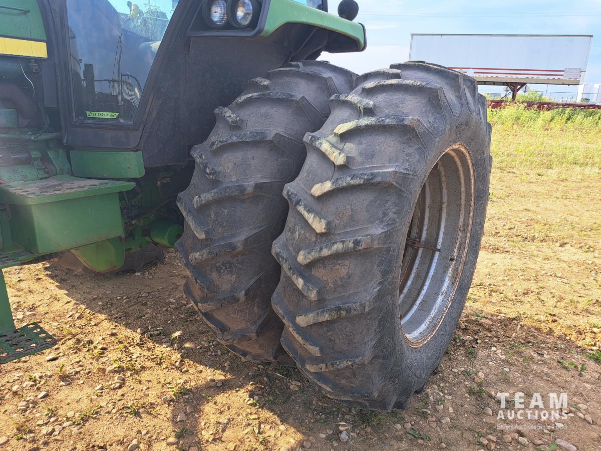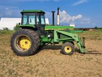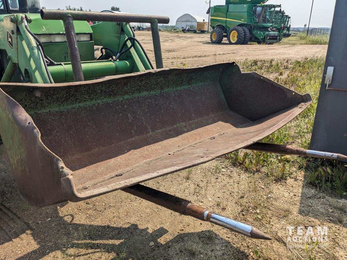 John Deere 148 loader, 84 inch bucket, bale forks, John Deere 7.6 L 6 cylinder 130 HP, diesel engine, 100 PTO HP, 16 speed Quad Range partial power shift transmission, cab, rear differential lock, A/C, 540/1000 PTO, 2 rear hydraulic outlets, 10.00-16 front tires, 18.4-38 rear tires, clamp on duals