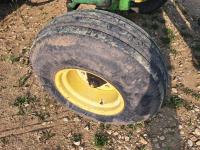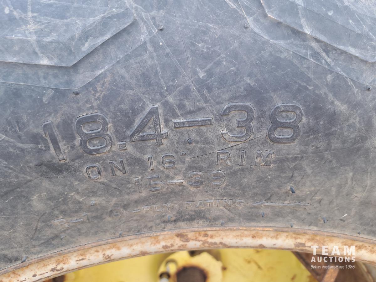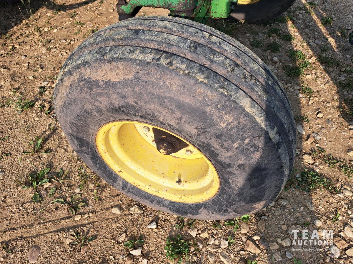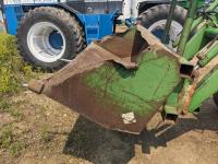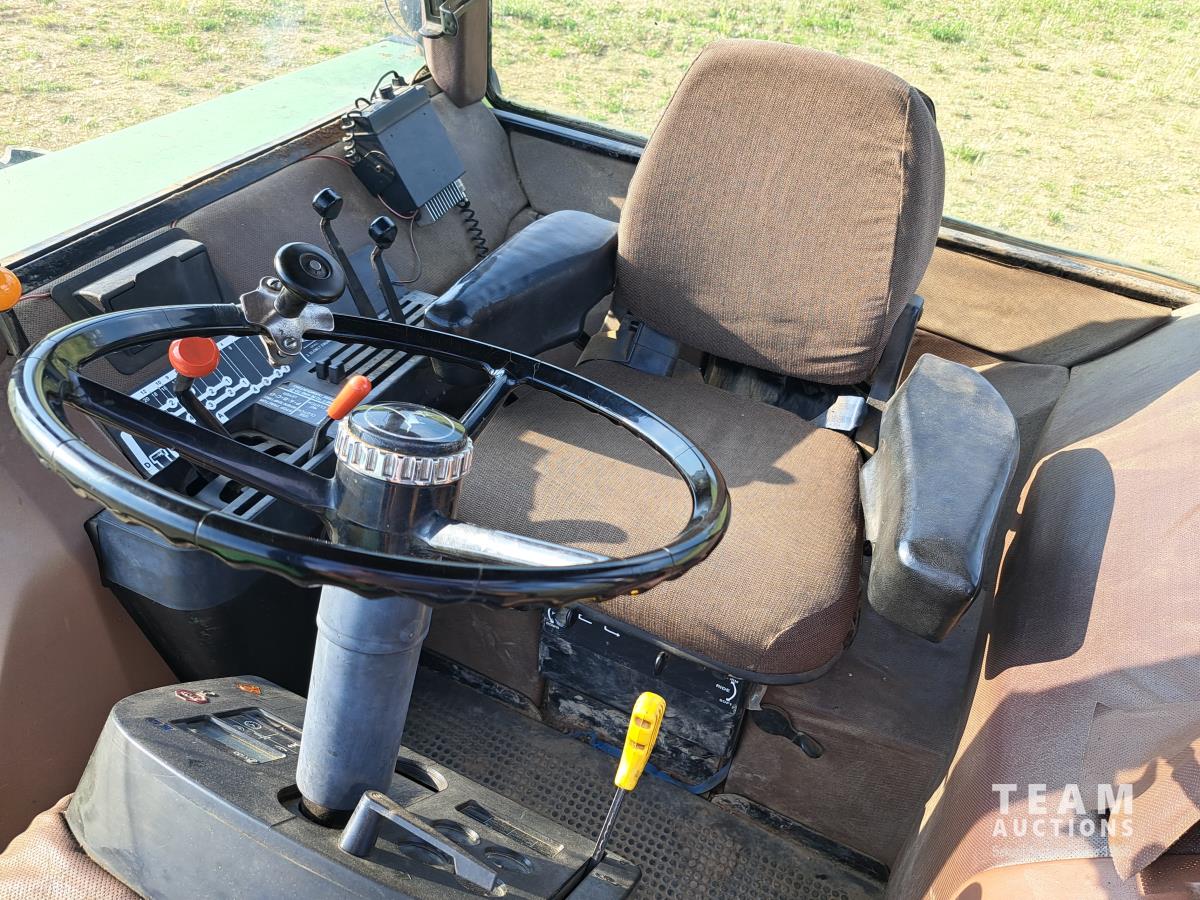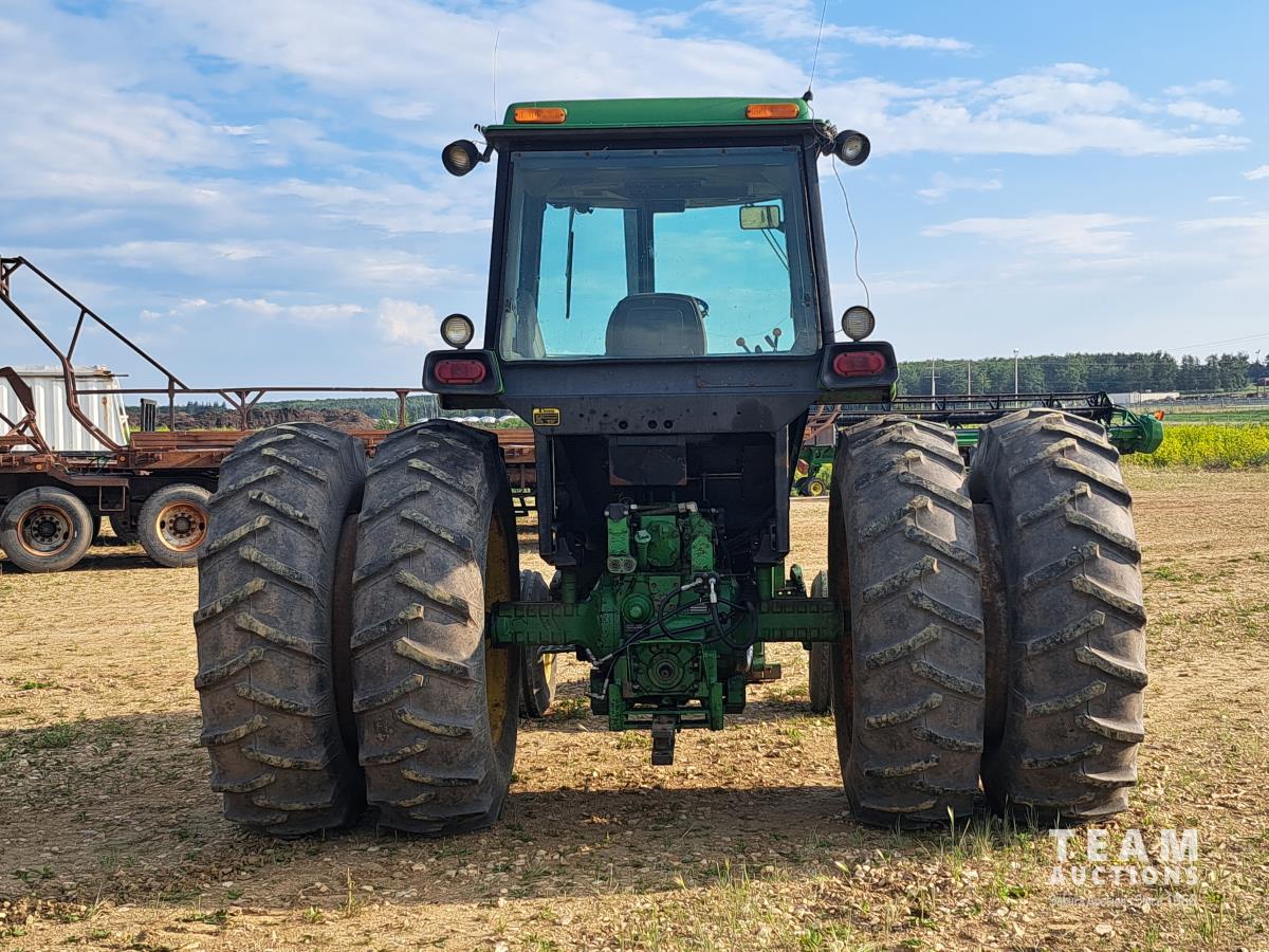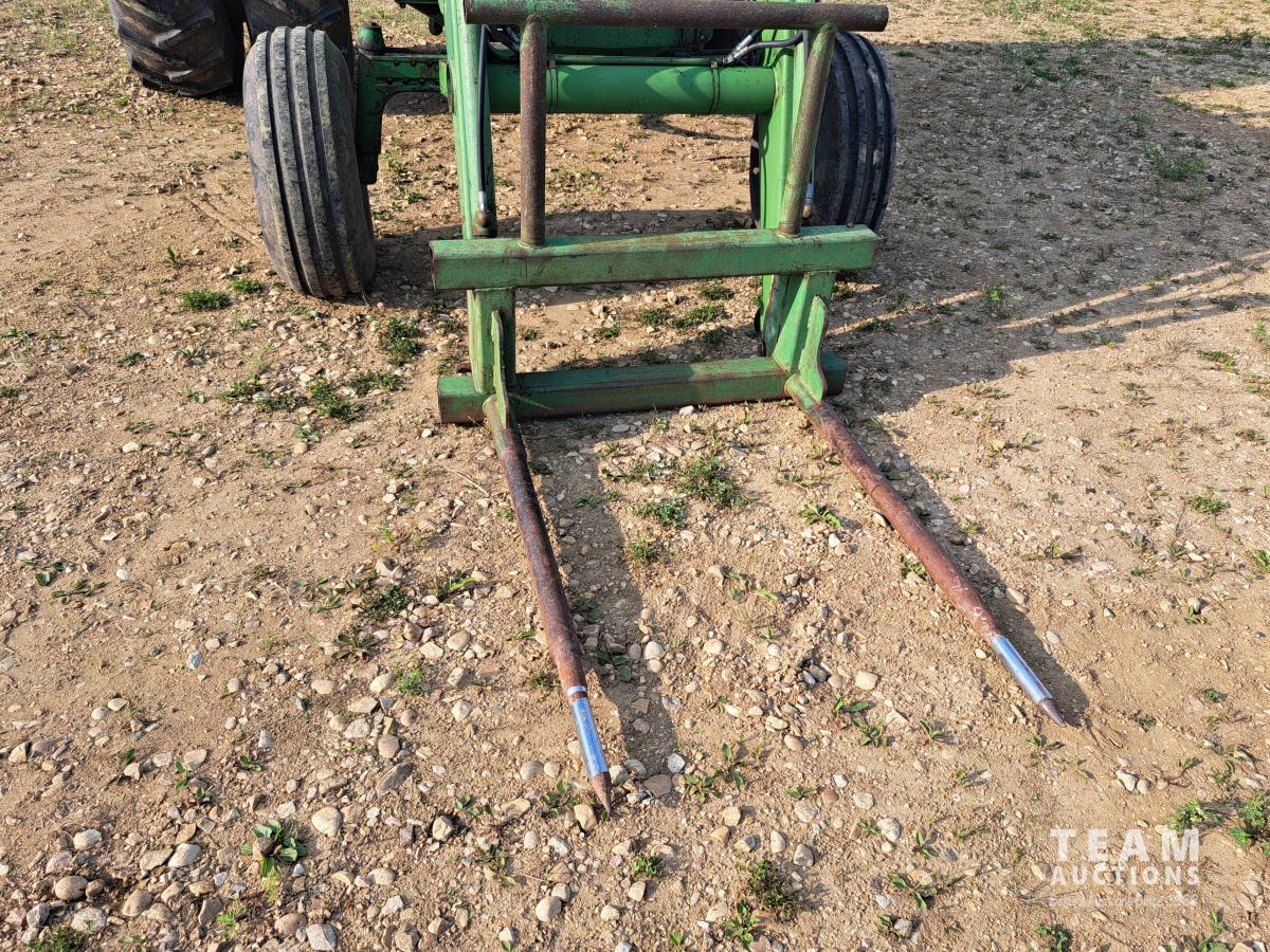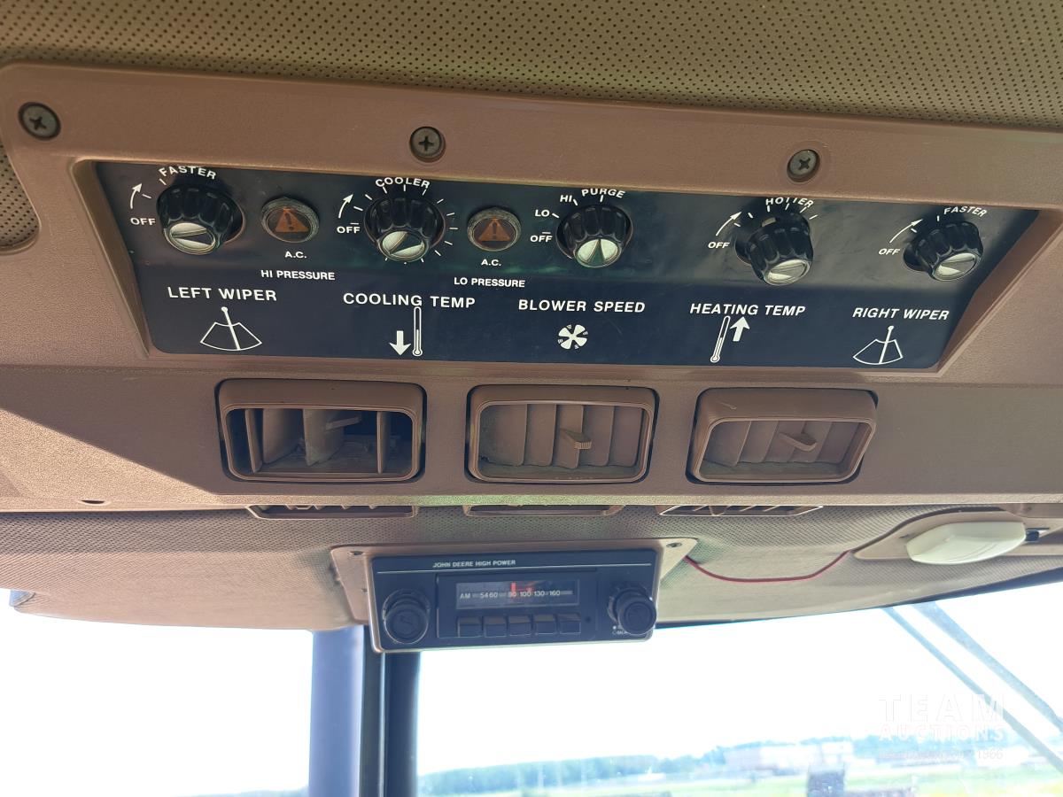 John Deere 148 loader, 84 inch bucket, bale forks, John Deere 7.6 L 6 cylinder 130 HP, diesel engine, 100 PTO HP, 16 speed Quad Range partial power shift transmission, cab, rear differential lock, A/C, 540/1000 PTO, 2 rear hydraulic outlets, 10.00-16 front tires, 18.4-38 rear tires, clamp on duals