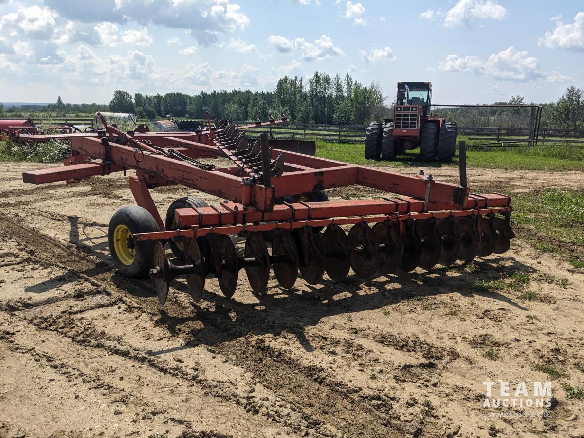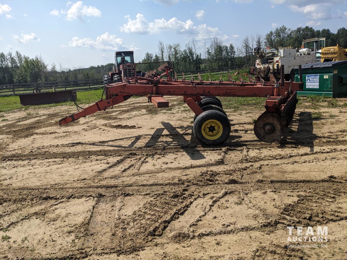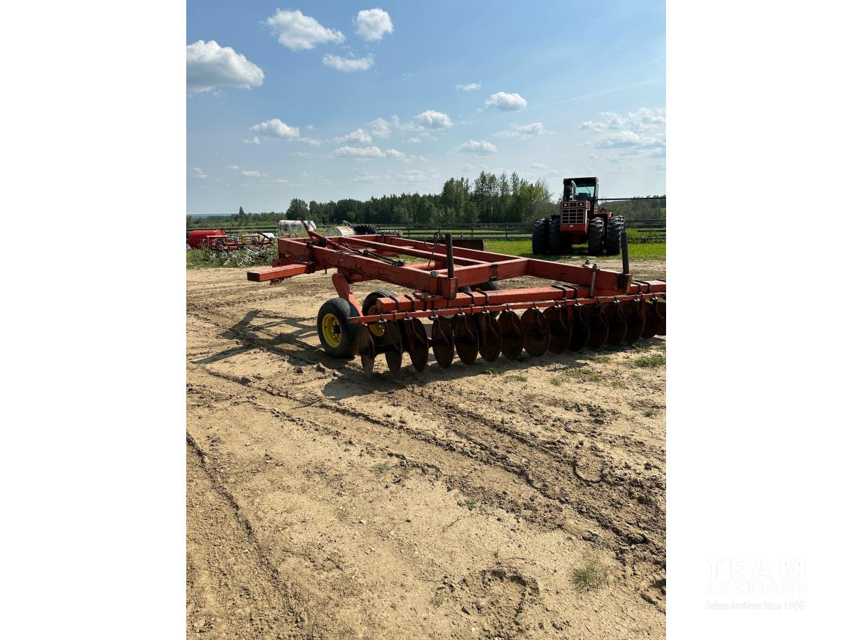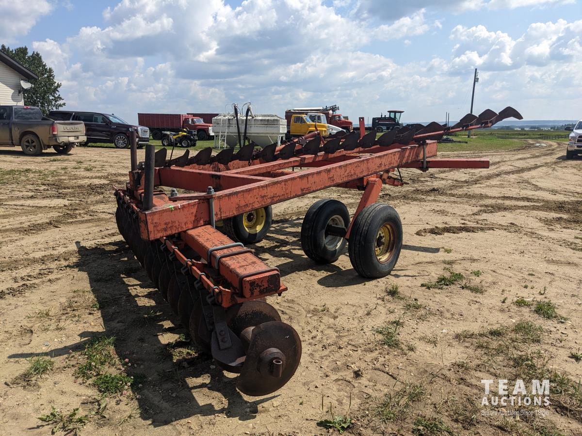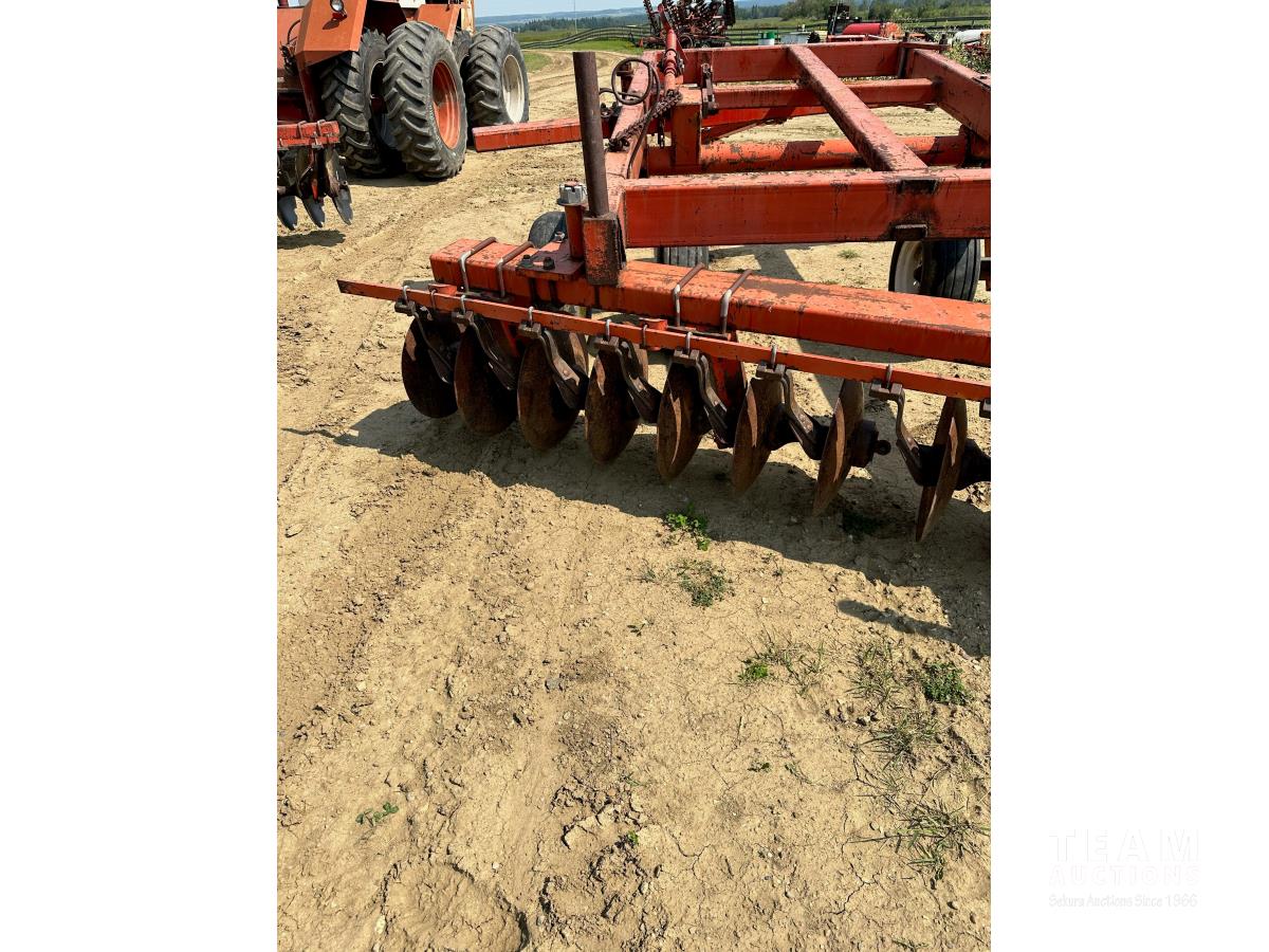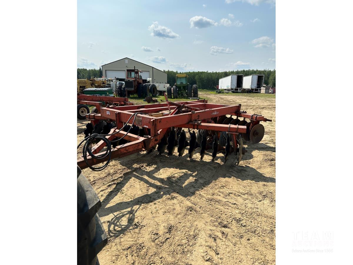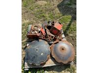 9 inch front spacing, 22 inch new front discs, 11 inch rear spacing, 23 inch discs, 11L-15 duals, plus (1) Hutch Master 12 ft offset disc for parts
