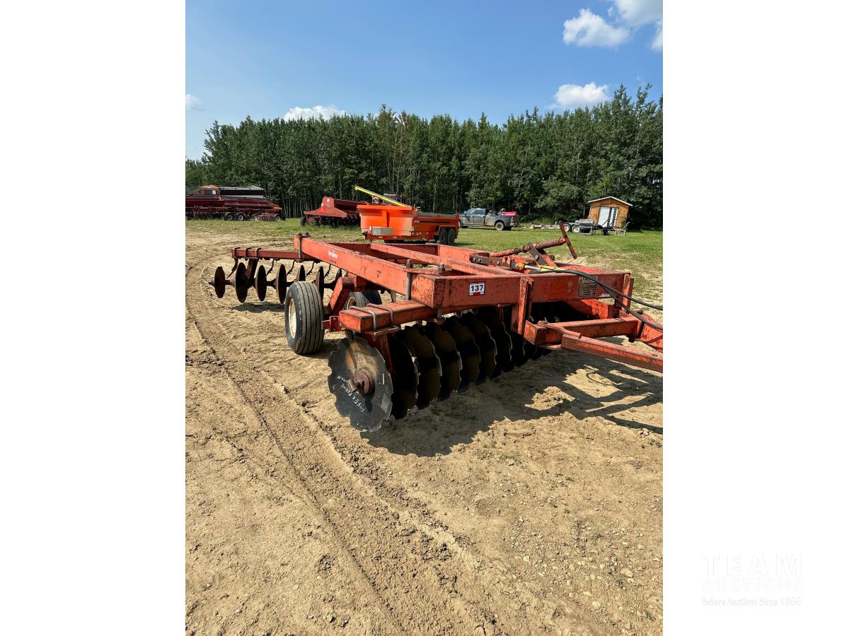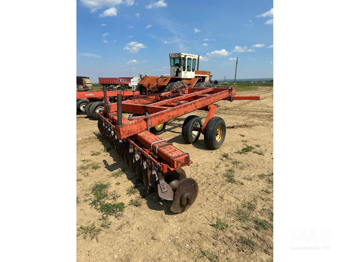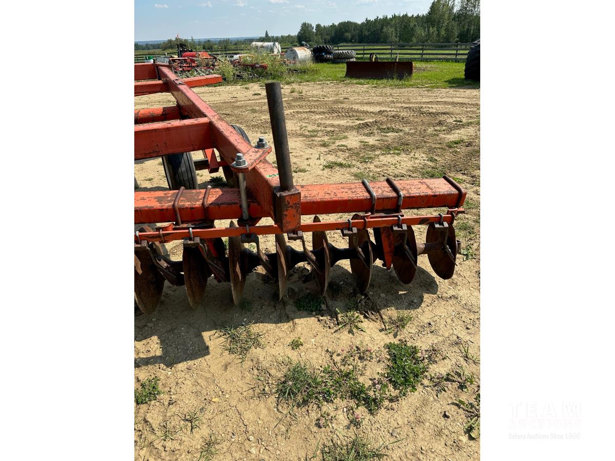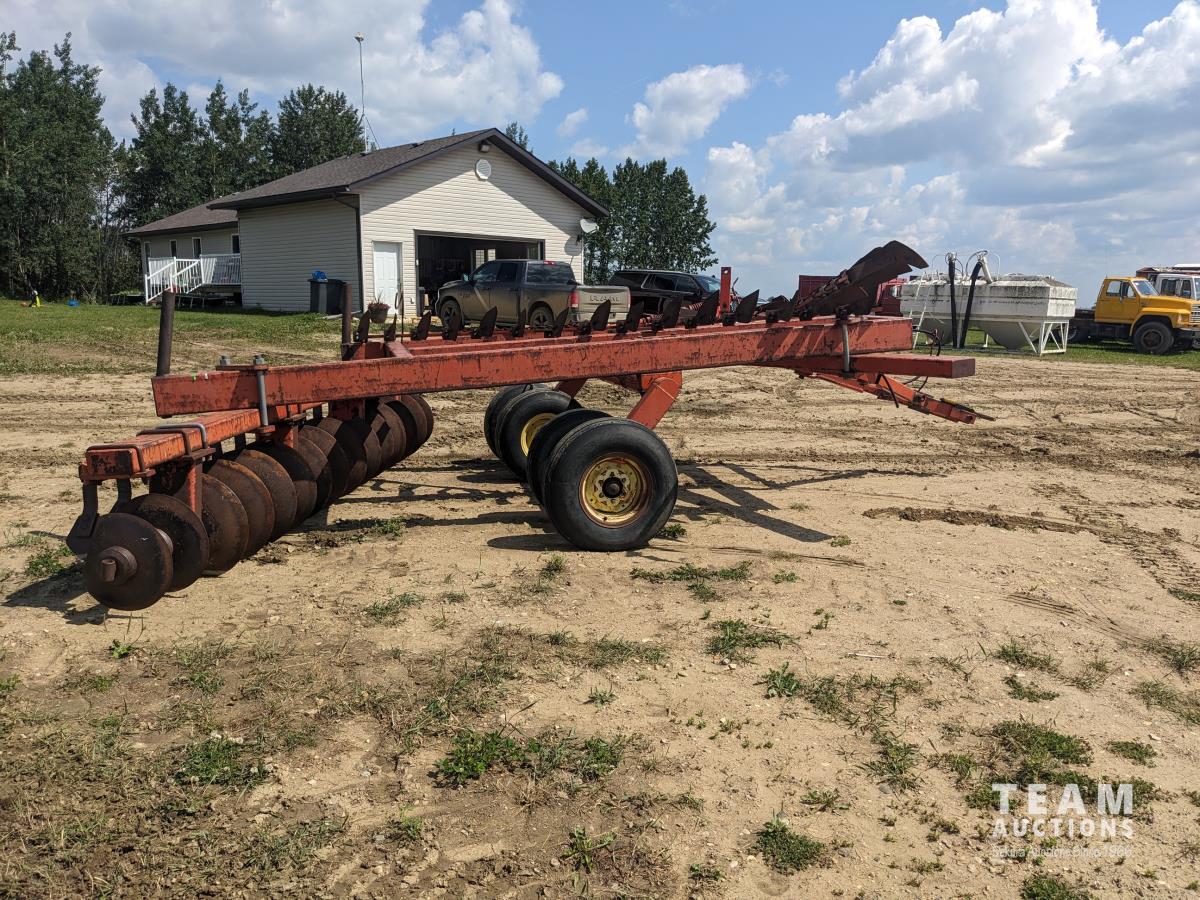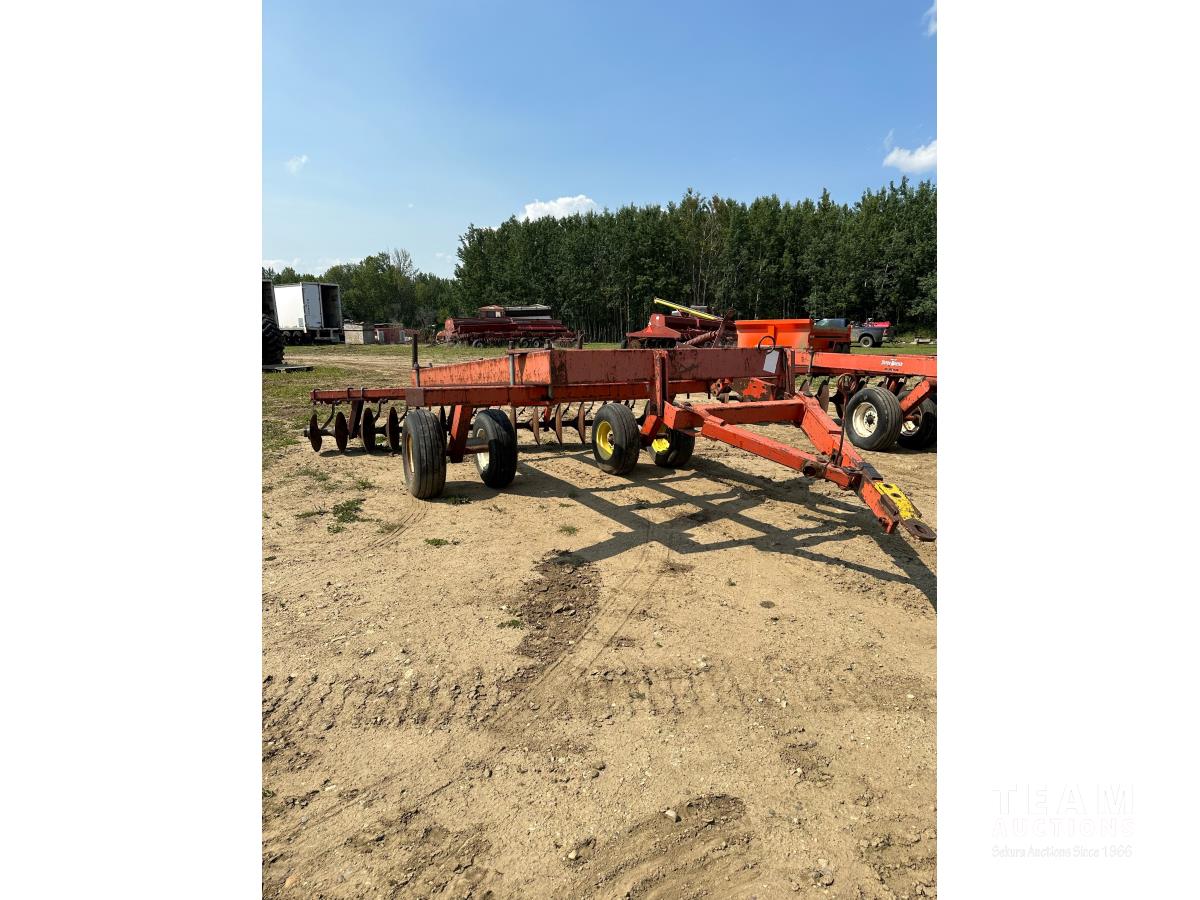 9 inch front spacing, 22 inch new front discs, 11 inch rear spacing, 23 inch discs, 11L-15 duals, plus (1) Hutch Master 12 ft offset disc for parts
