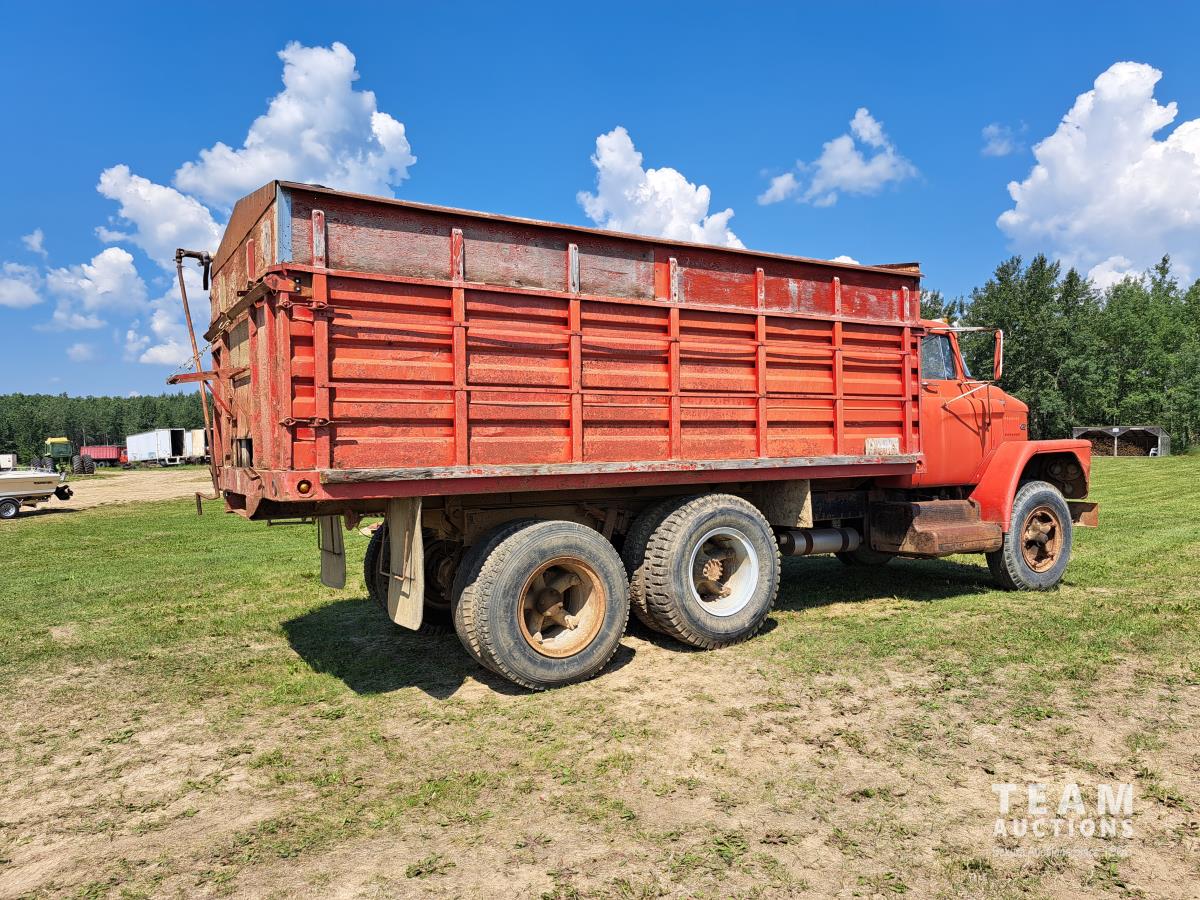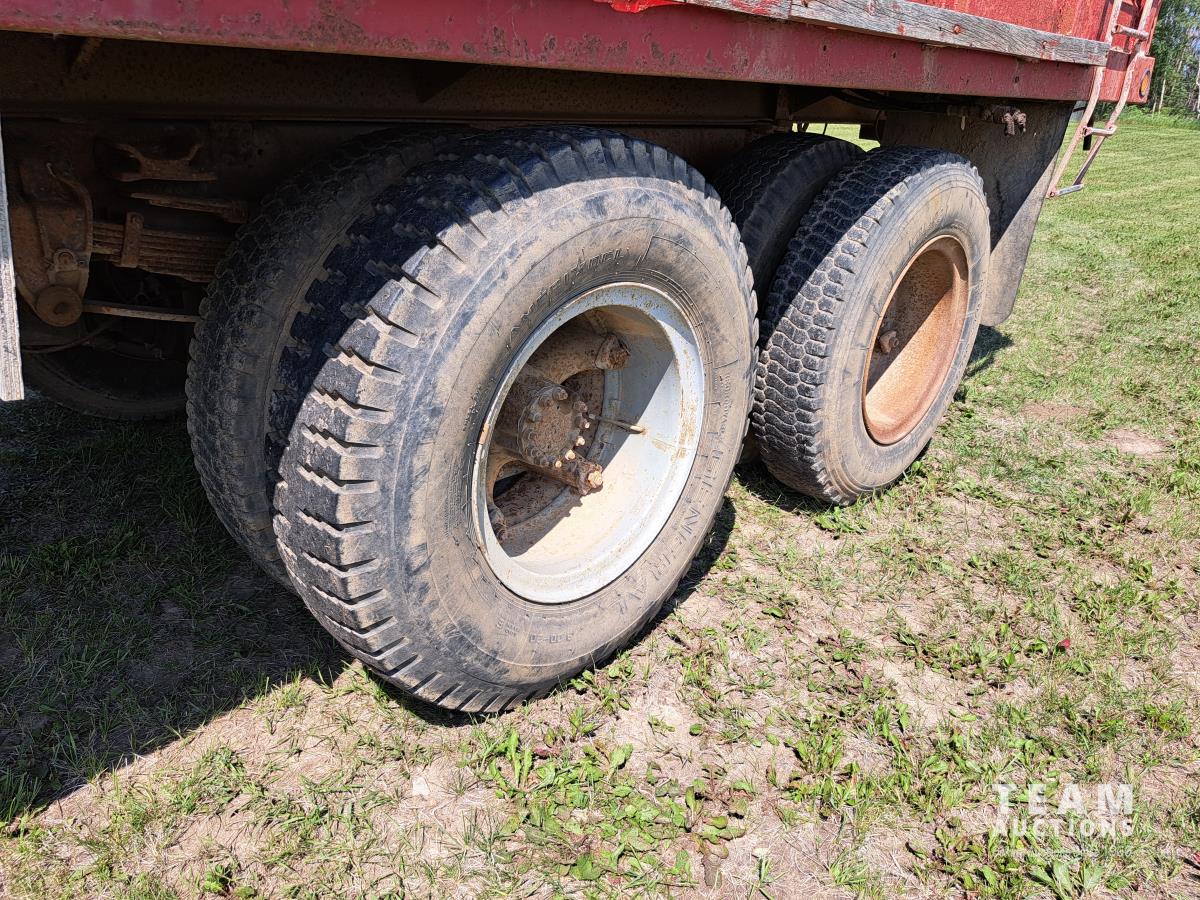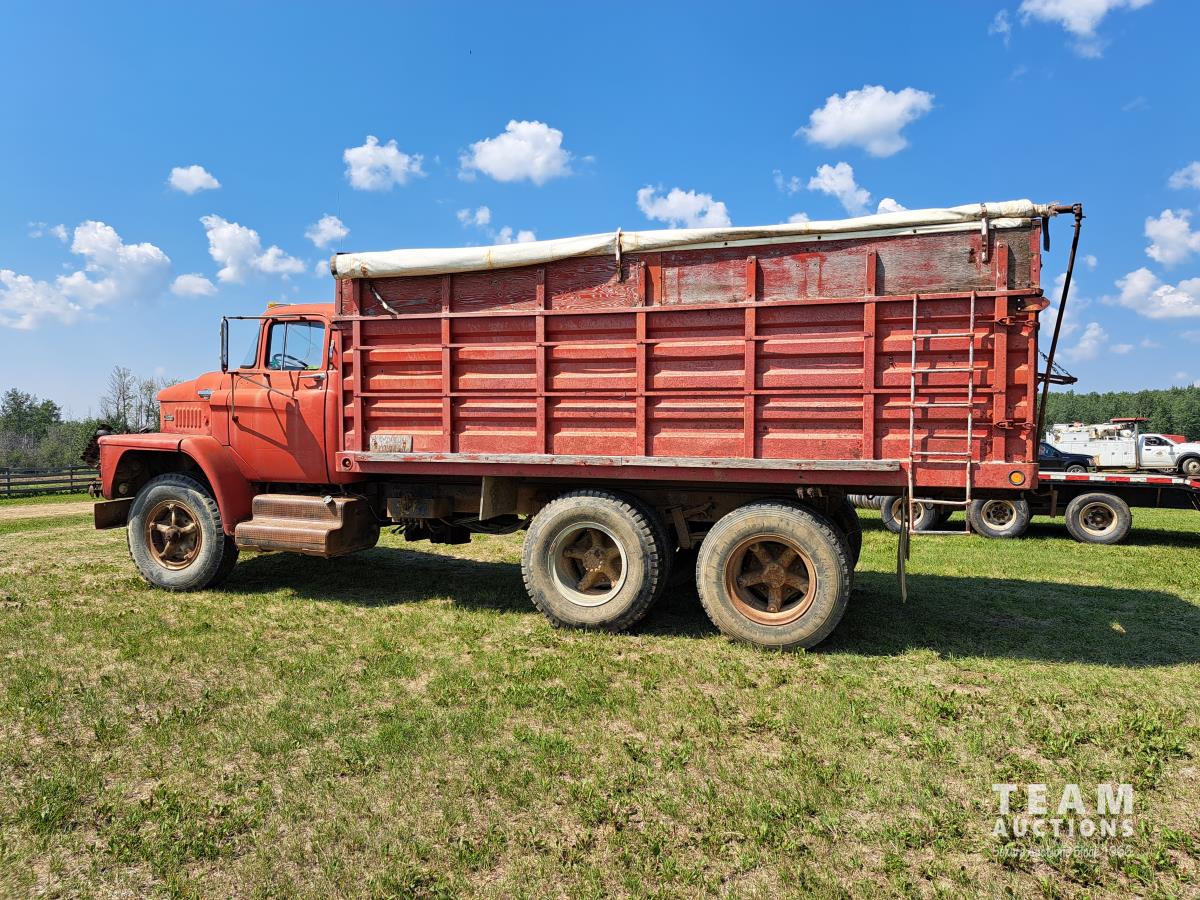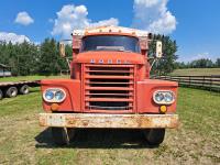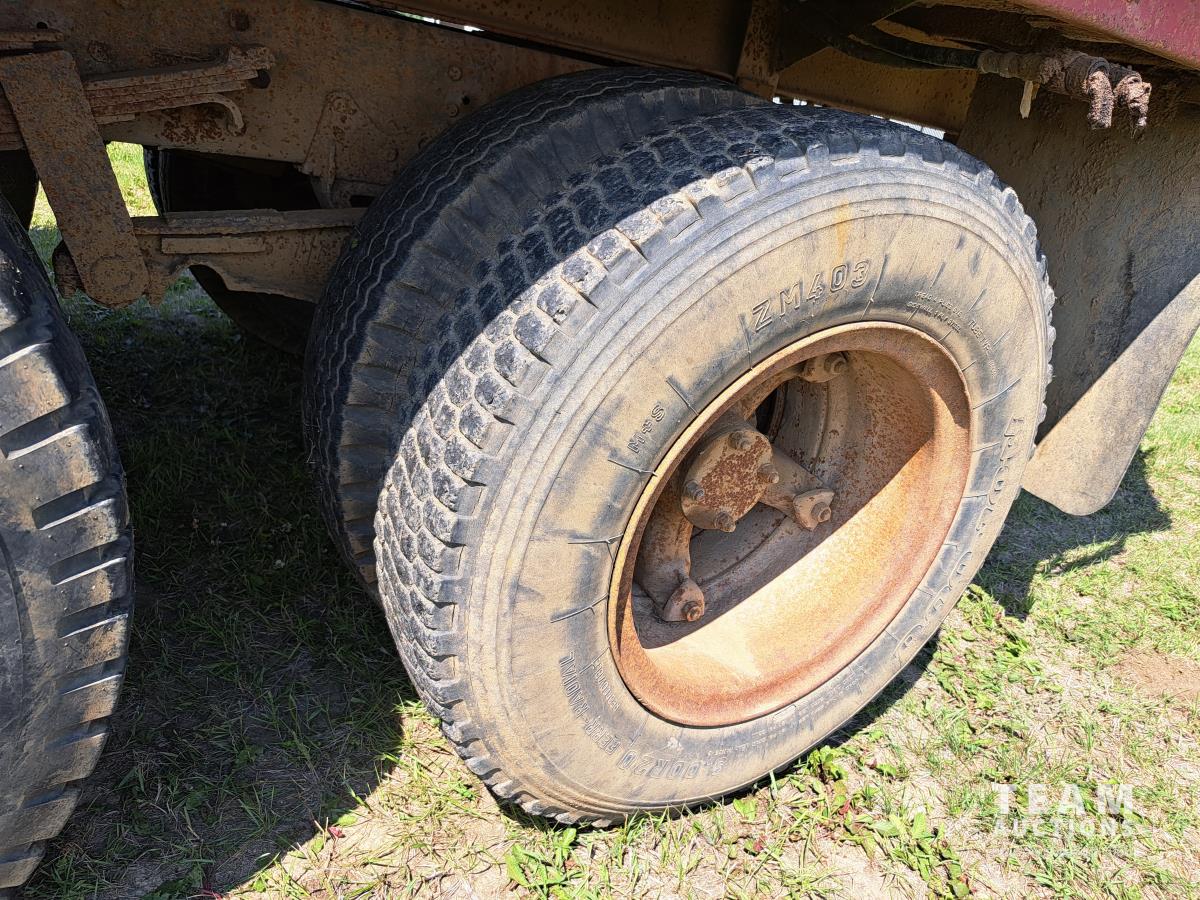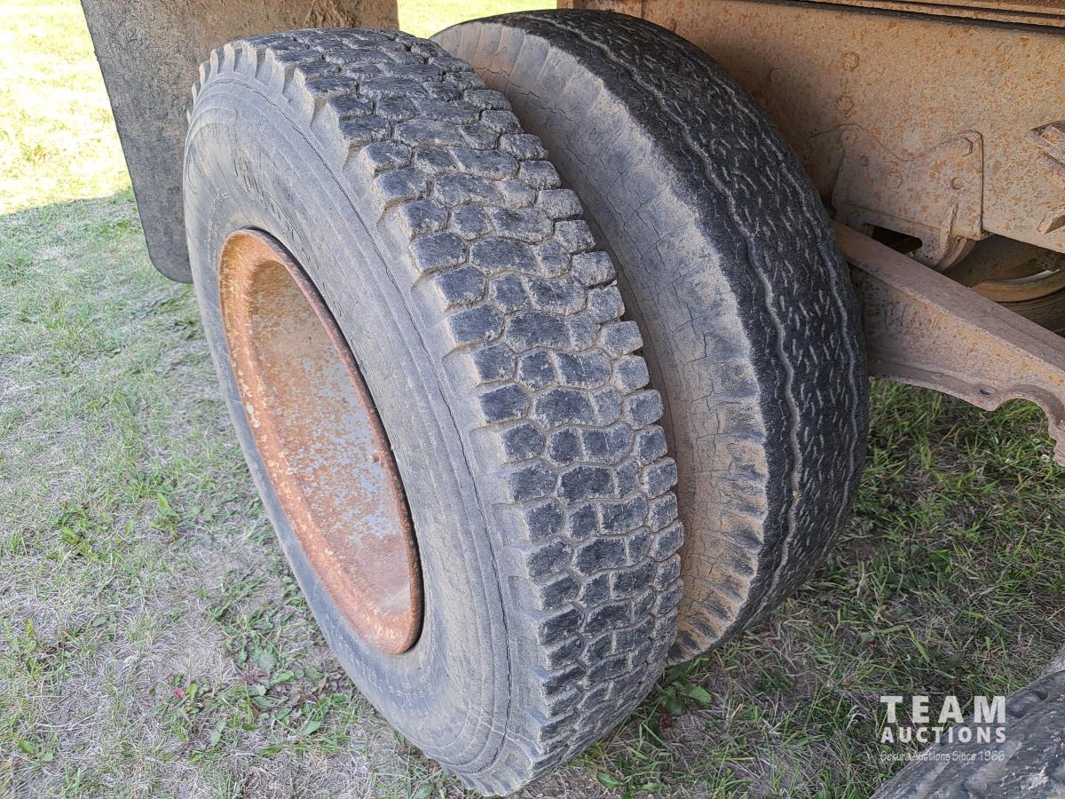 Chrsyler 361 cu in V8 gas engine, engine brake, 5 speed manual transmission, 2 speed axle, 15 ft box, hoist, roll tarp, 2 cylinder hoist, drill fill hydraulic outlets, spring suspension, 7,000 lb front axle, 20,000 lb rear axles, 146 inch WB, 10.00-20 front tires, 9.00-20 rear tires