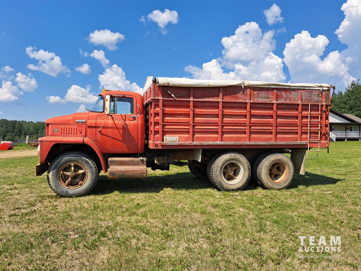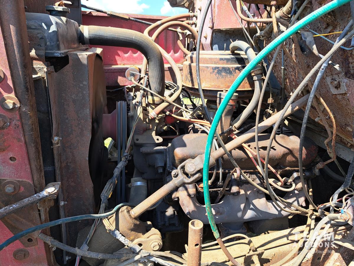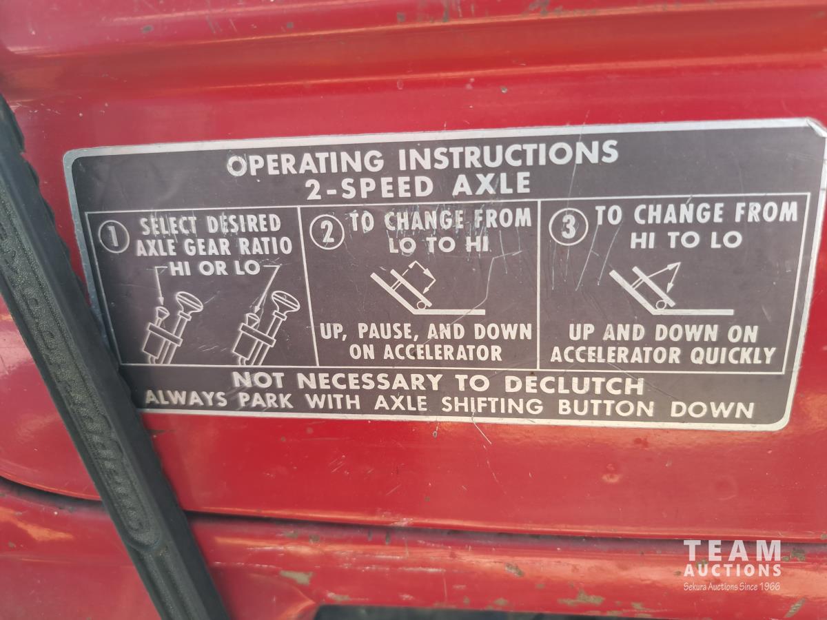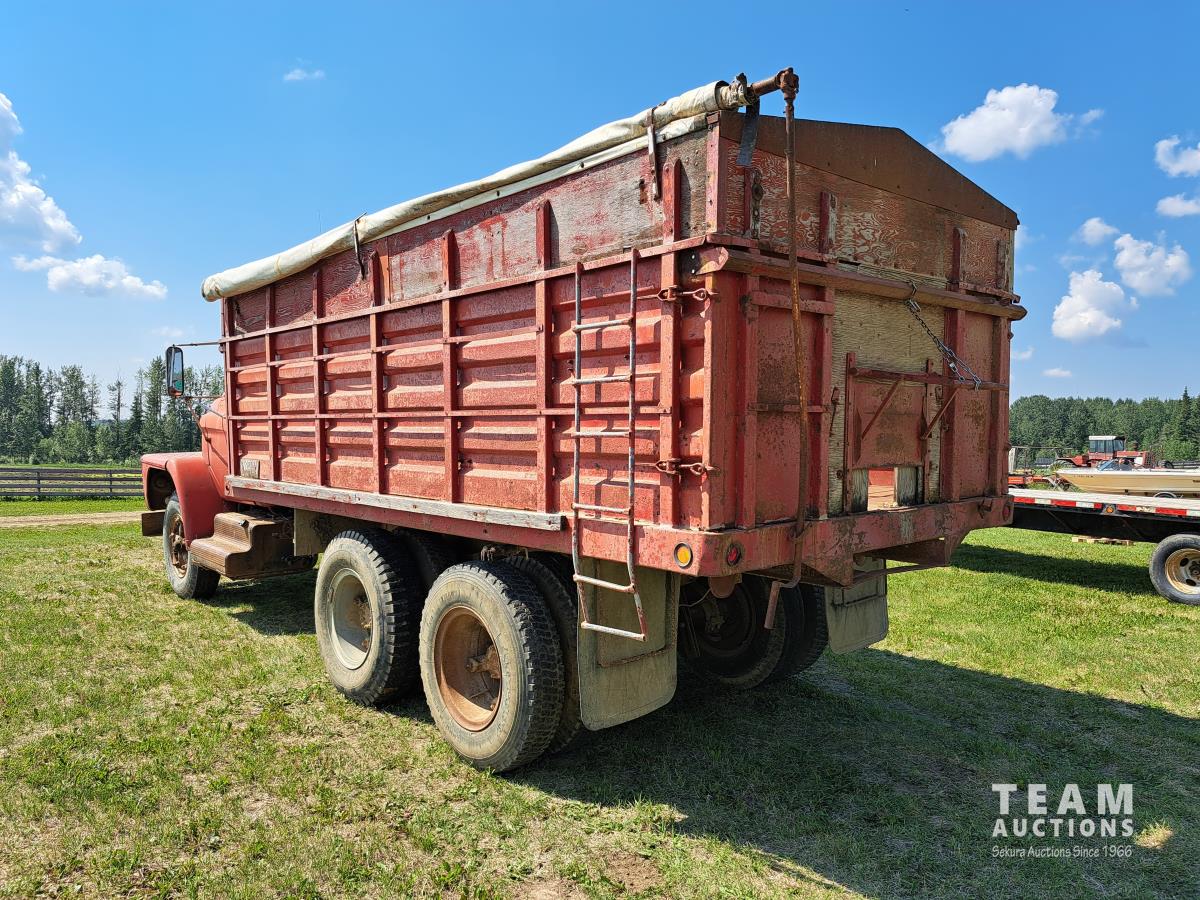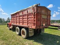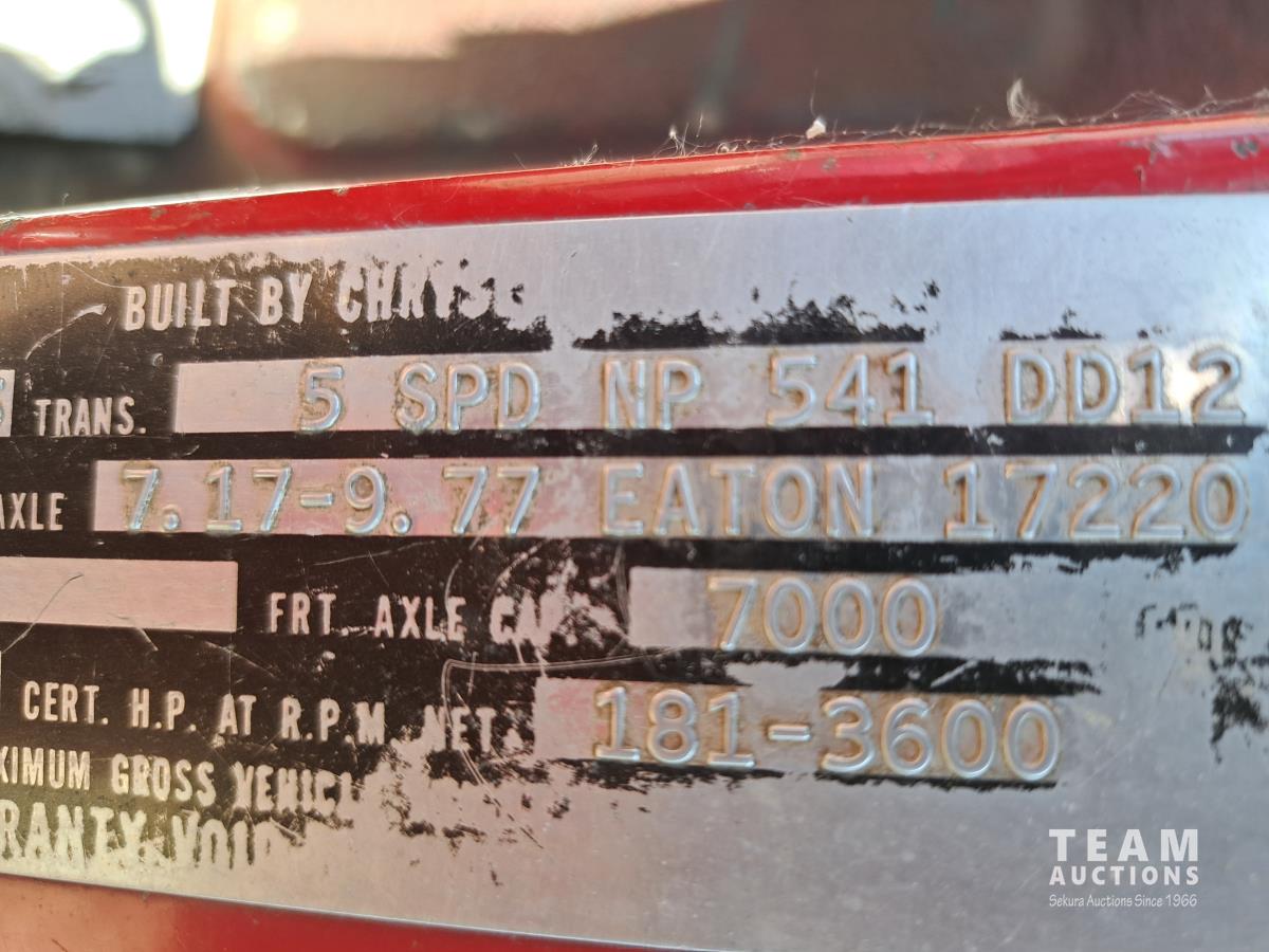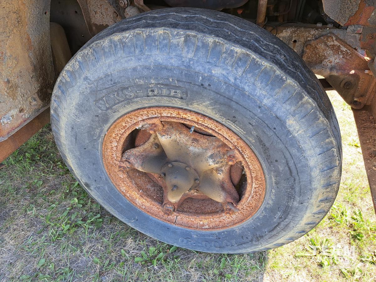 Chrsyler 361 cu in V8 gas engine, engine brake, 5 speed manual transmission, 2 speed axle, 15 ft box, hoist, roll tarp, 2 cylinder hoist, drill fill hydraulic outlets, spring suspension, 7,000 lb front axle, 20,000 lb rear axles, 146 inch WB, 10.00-20 front tires, 9.00-20 rear tires