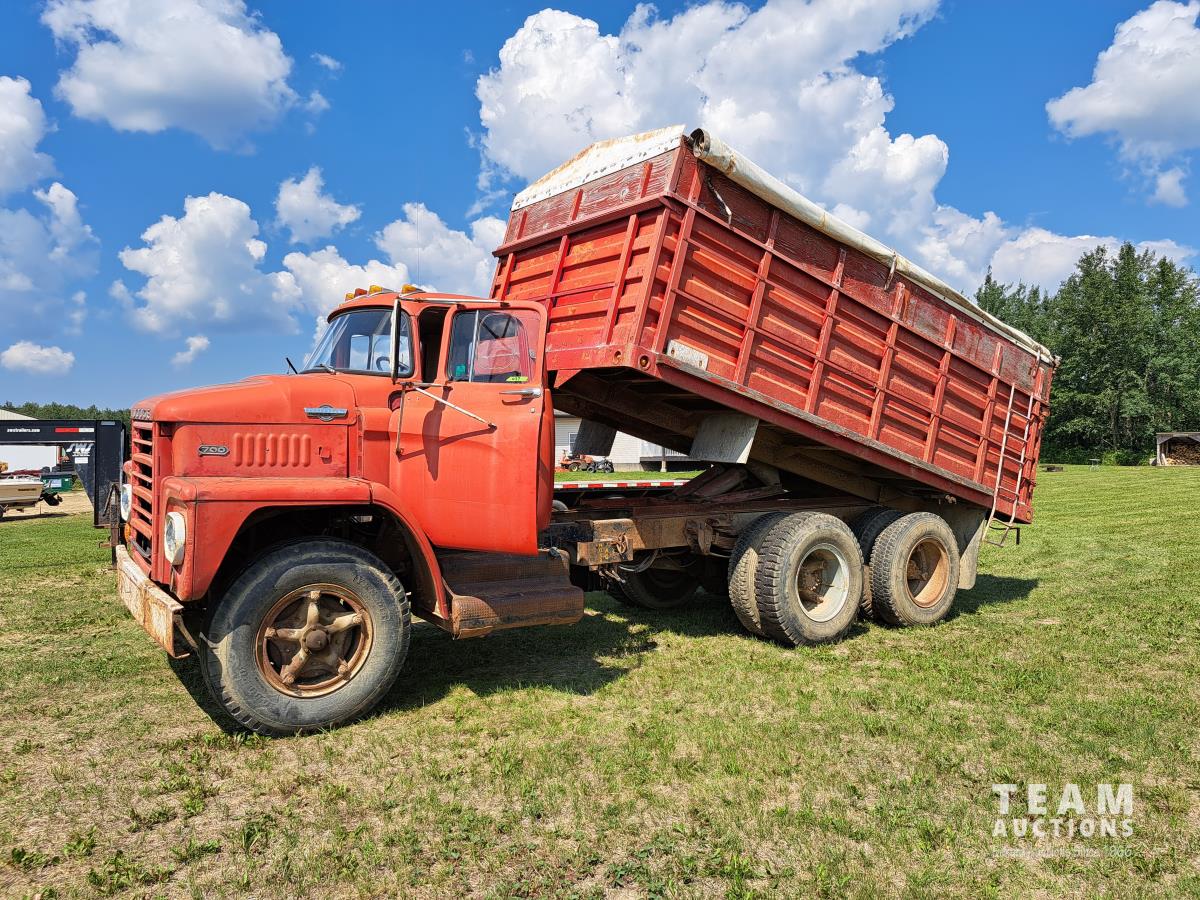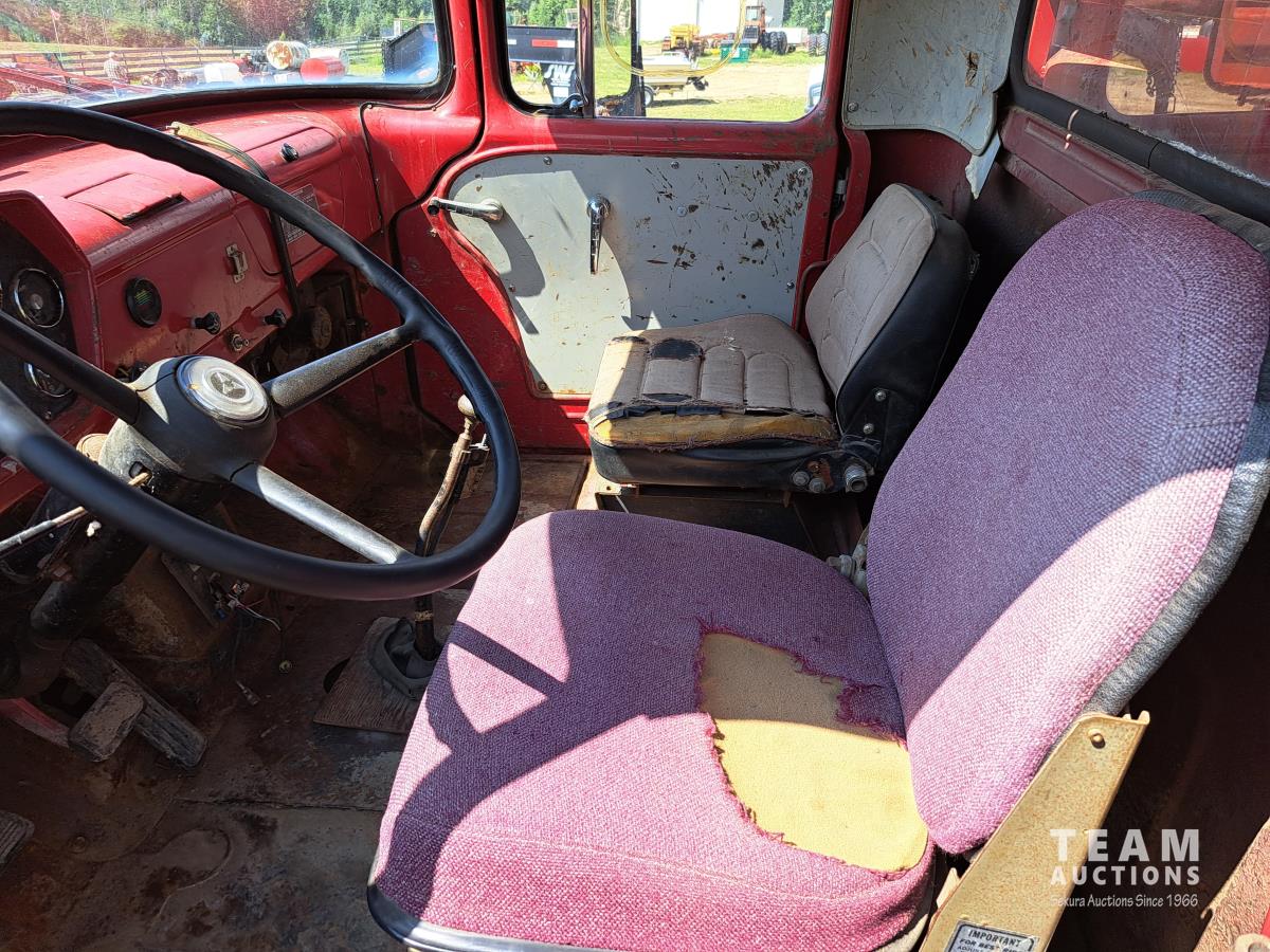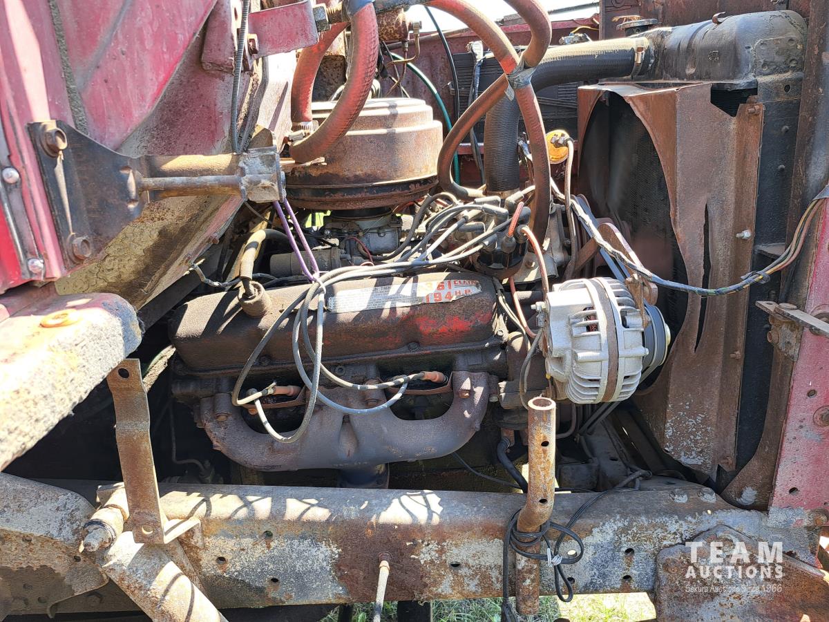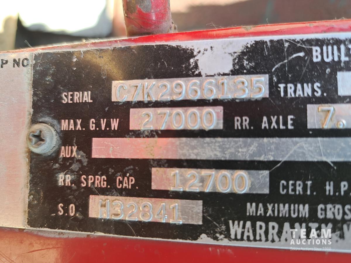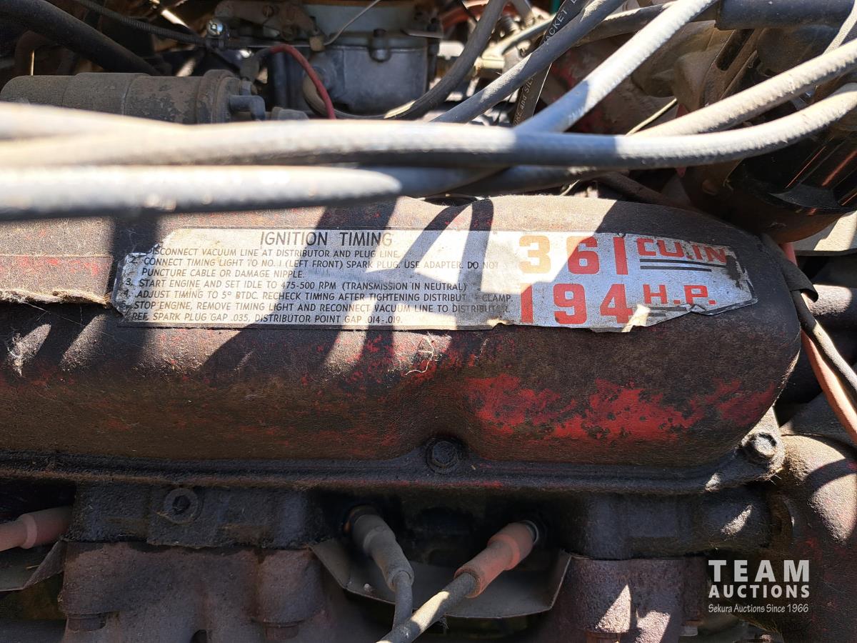 Chrsyler 361 cu in V8 gas engine, engine brake, 5 speed manual transmission, 2 speed axle, 15 ft box, hoist, roll tarp, 2 cylinder hoist, drill fill hydraulic outlets, spring suspension, 7,000 lb front axle, 20,000 lb rear axles, 146 inch WB, 10.00-20 front tires, 9.00-20 rear tires