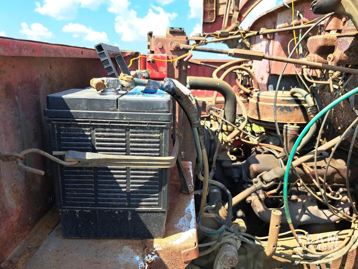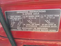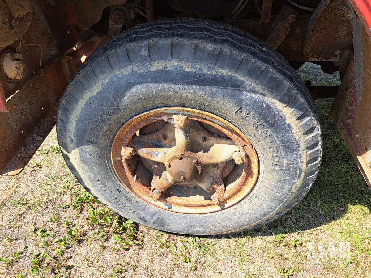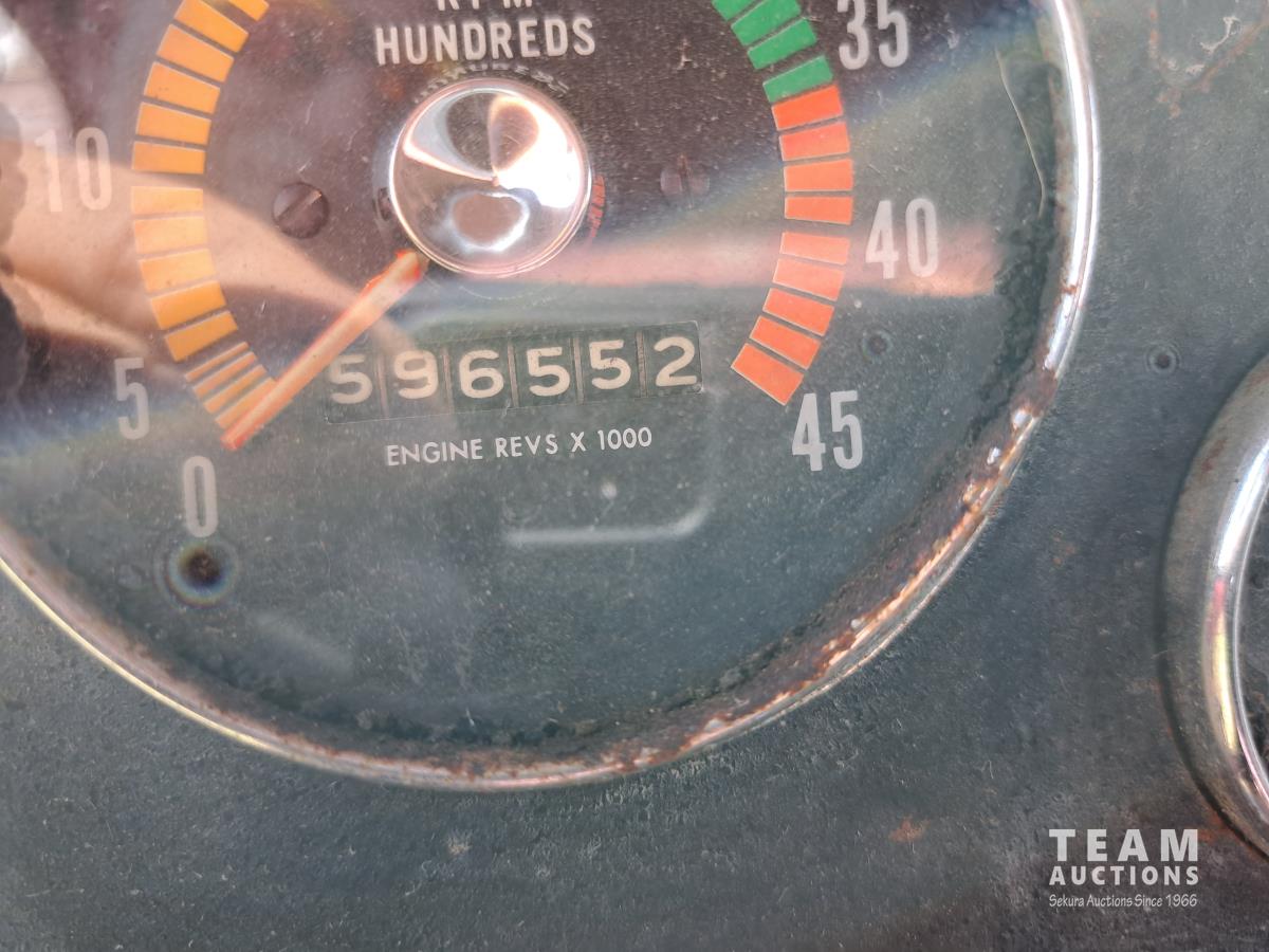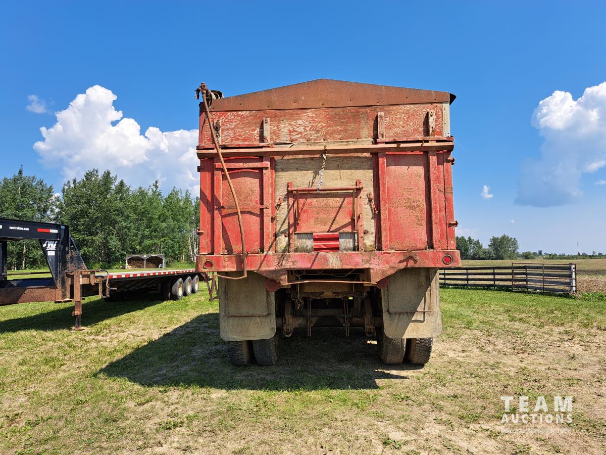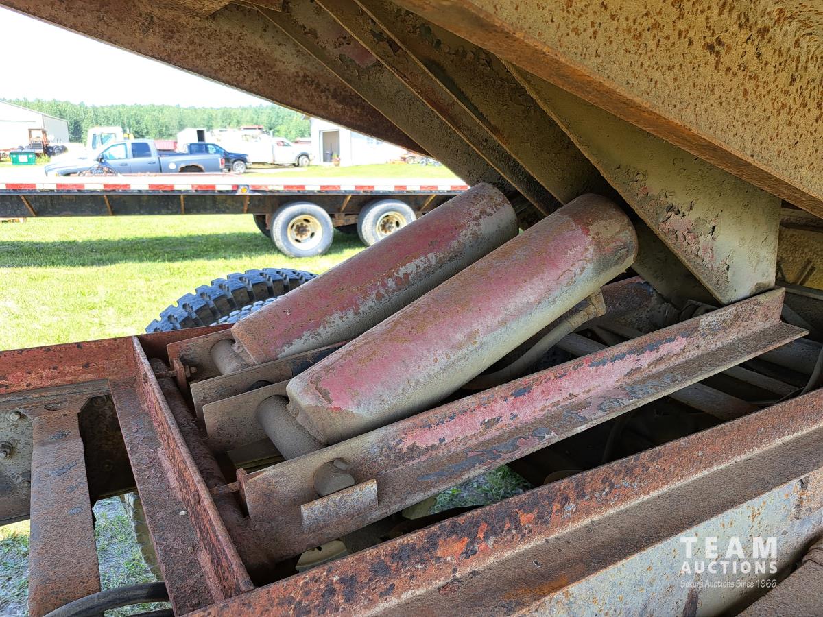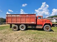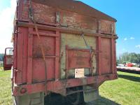 Chrsyler 361 cu in V8 gas engine, engine brake, 5 speed manual transmission, 2 speed axle, 15 ft box, hoist, roll tarp, 2 cylinder hoist, drill fill hydraulic outlets, spring suspension, 7,000 lb front axle, 20,000 lb rear axles, 146 inch WB, 10.00-20 front tires, 9.00-20 rear tires