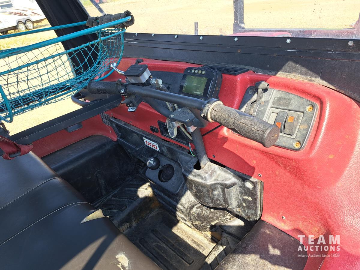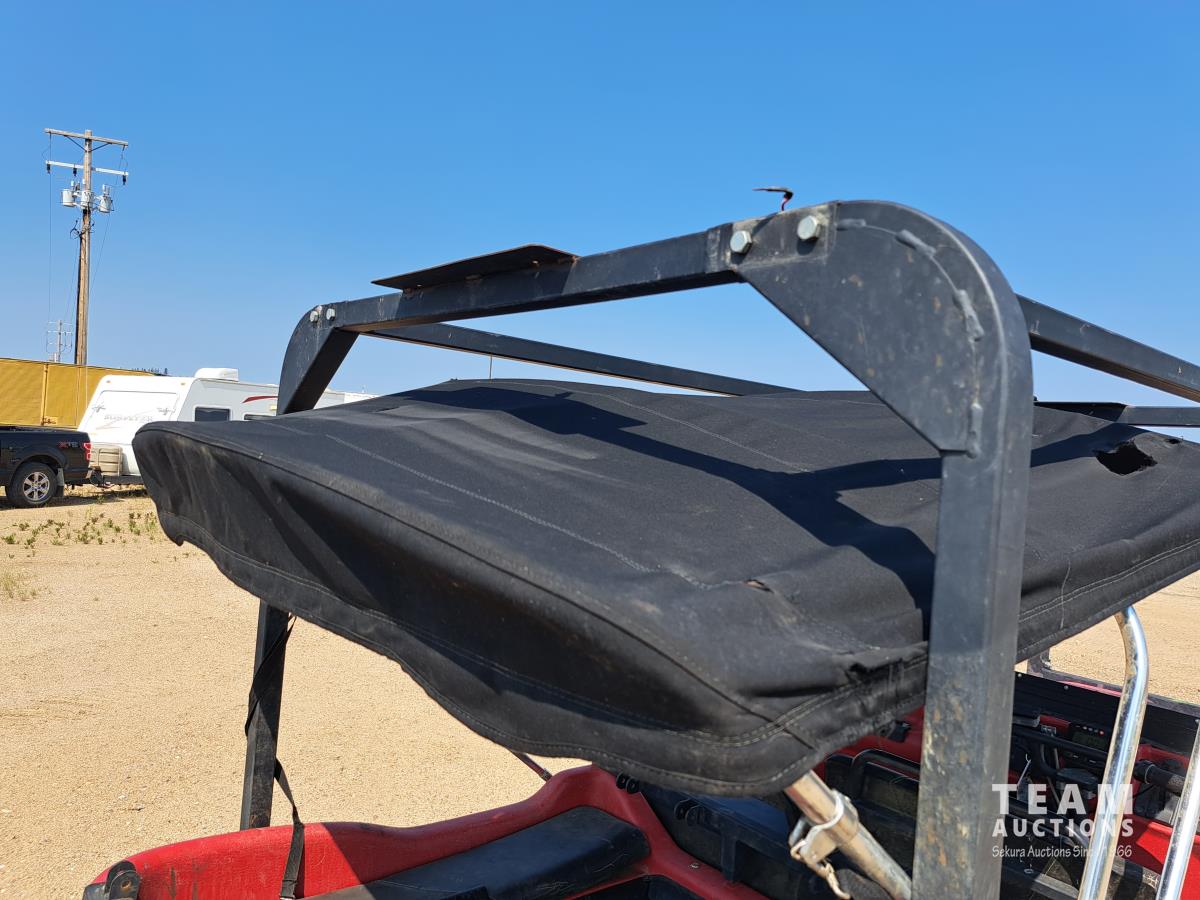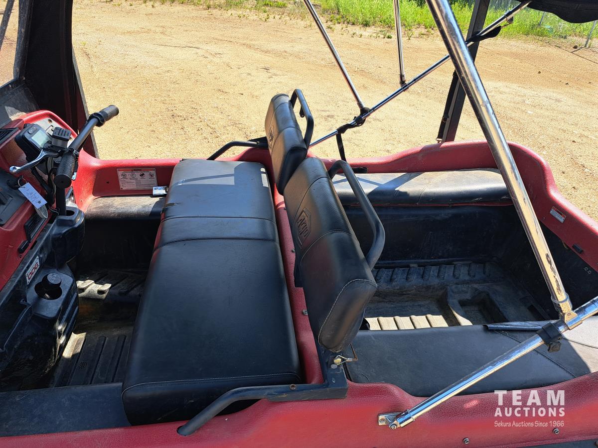 750 Kohler liquid cooled twin cylinder gas engine, Roll bar, canvas cover with poly windows, Hi-Lo range, 2500 lb Warn Pro Vantage winch, 2 inch receiver hitch, stretcher basket with all mounting hardware, 25X12.00-9 tires