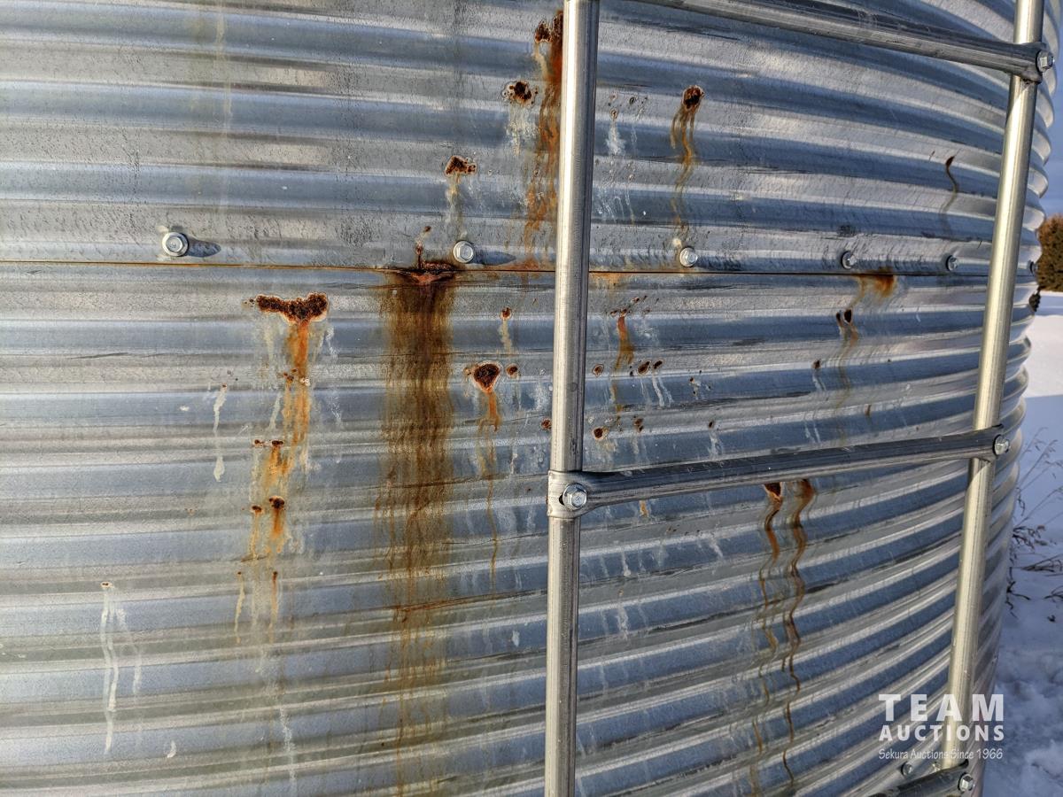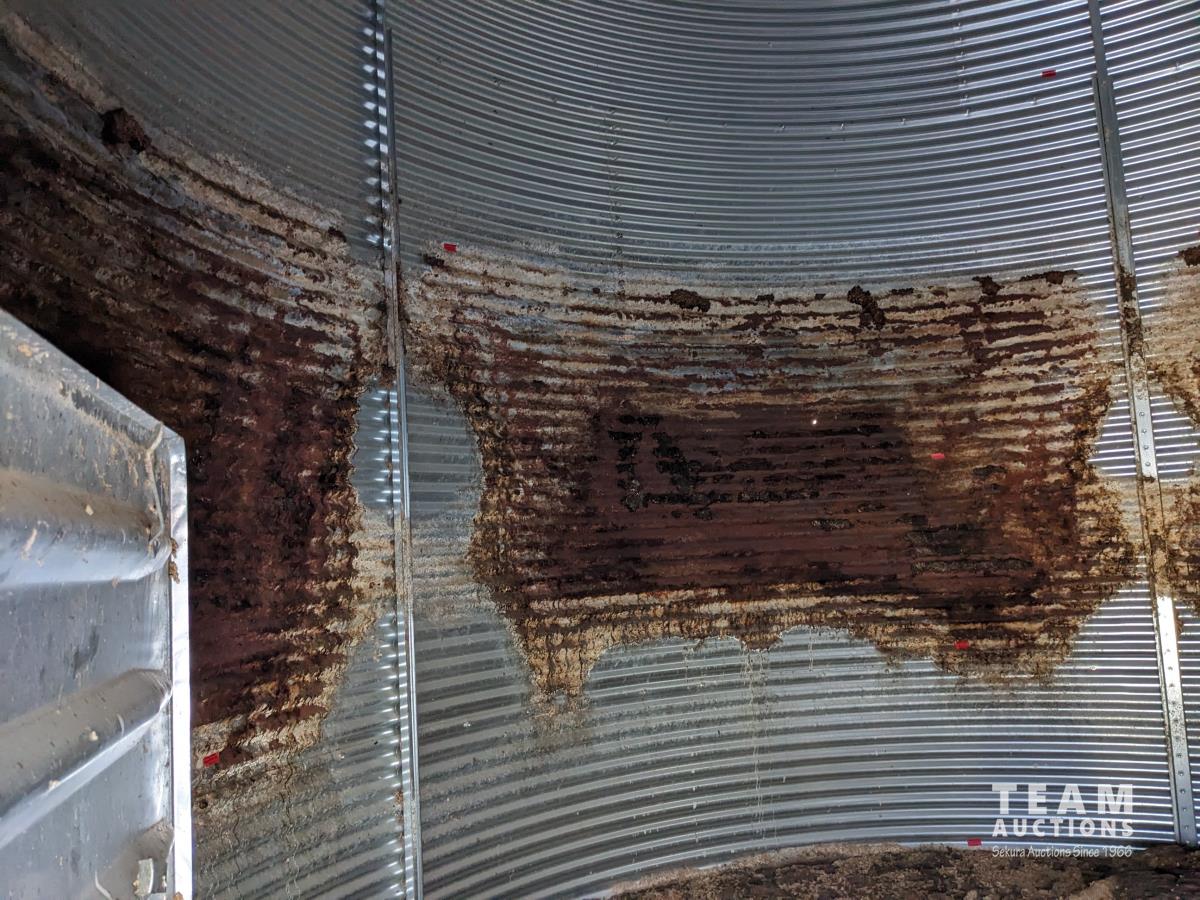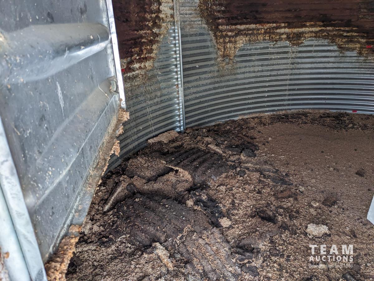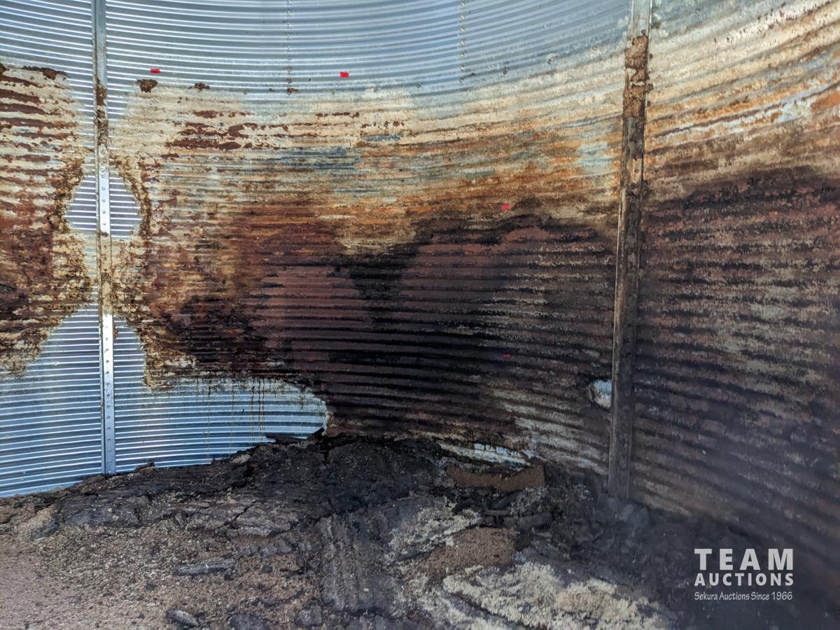 This is a complete estate dispersal of grain bins. This bin has some heated grain in it. It is the buyers responsibility to remove heated and moldy grain using proper protective clothing and respirator equipment. Moldy grain can be left at farm. There is wall damage and we do not know the condition of floor.