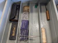 Cabinet 44 inch wide X 22 inch deep, X 32 inch high, paint spray guns, GMC mirrors, miscellaneous tools, pipe dies with handles, set of brake shoes