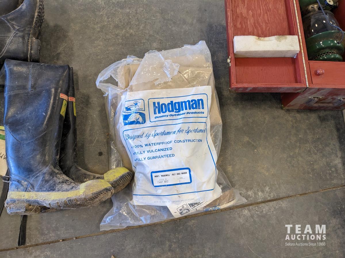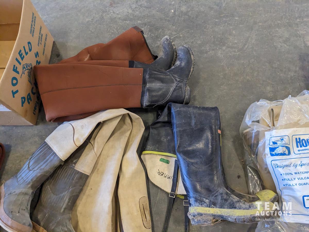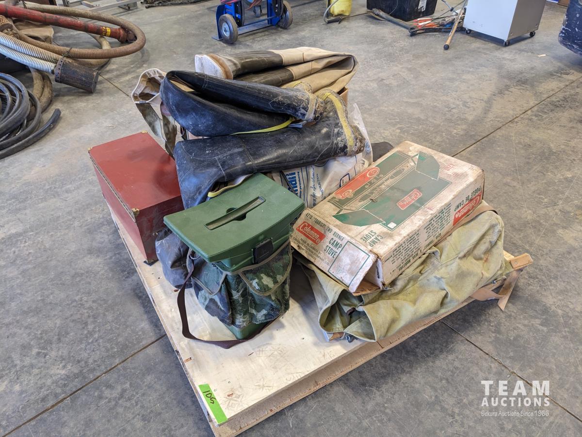 Back pack, folding chair, lantern, (5) various size hip waders, camp stove