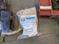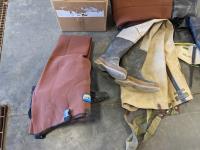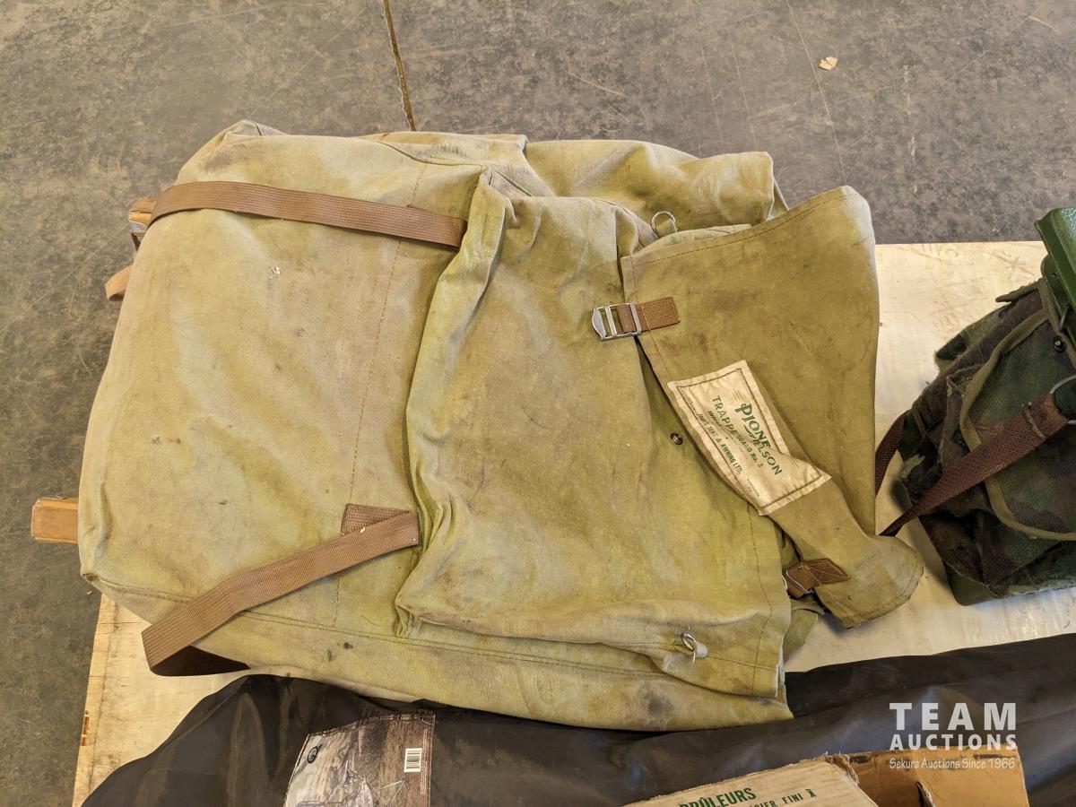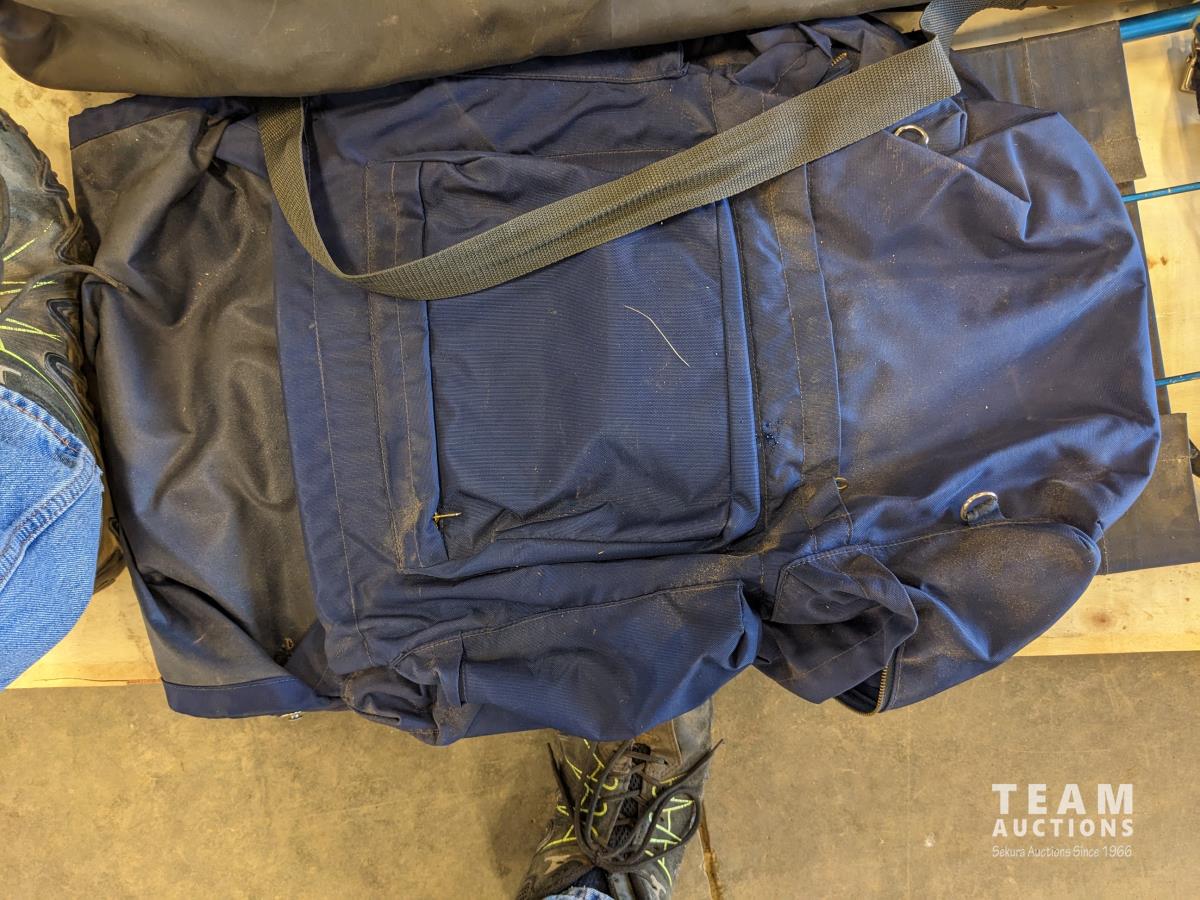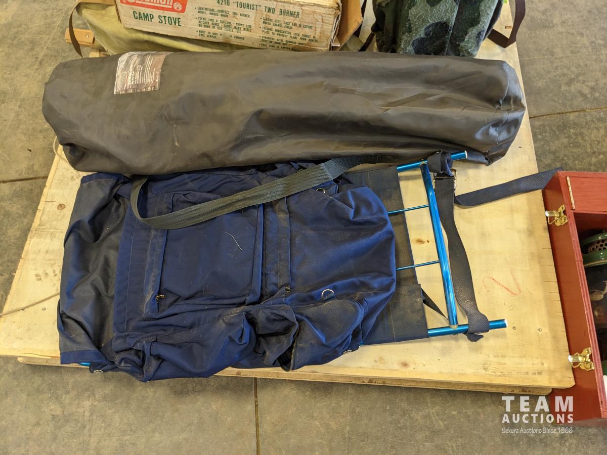 Back pack, folding chair, lantern, (5) various size hip waders, camp stove