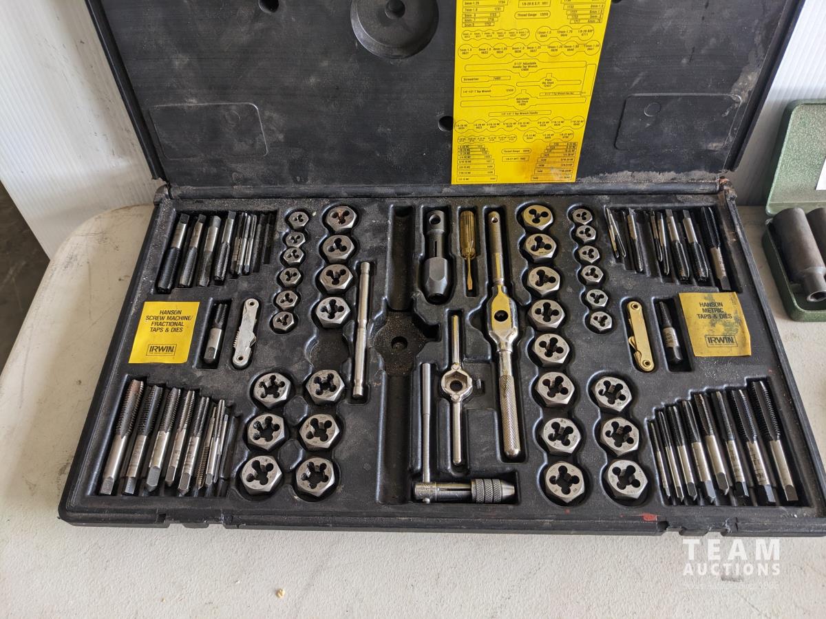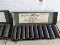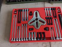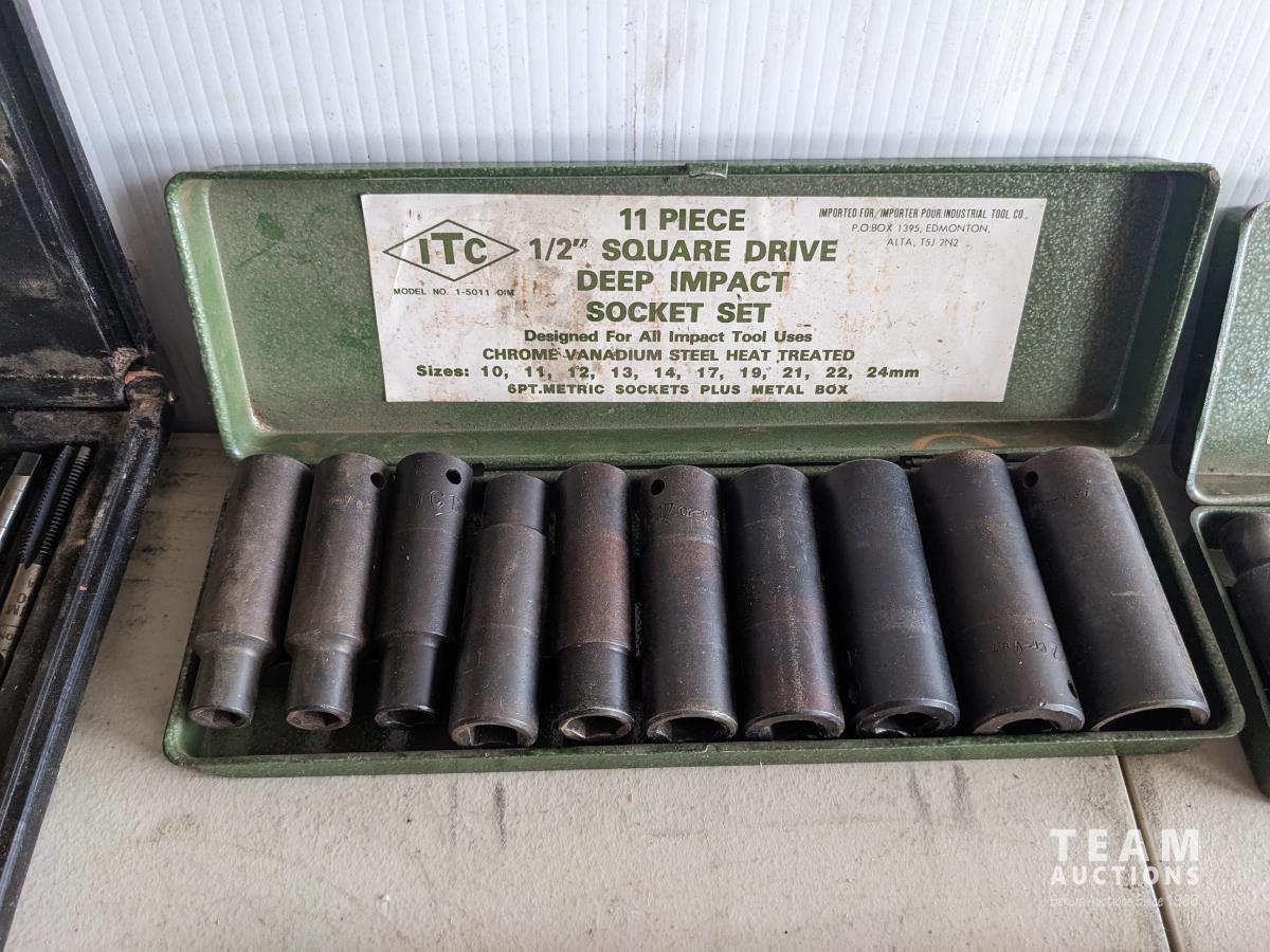 46 piece bolt type puller set, 11 piece 1/2 inch metric impact sockets set from 10-24, 11 piece 1/2 inch imperial impact socket set from 7/16-1 inch, tap & die set