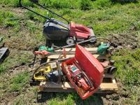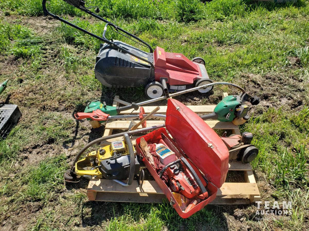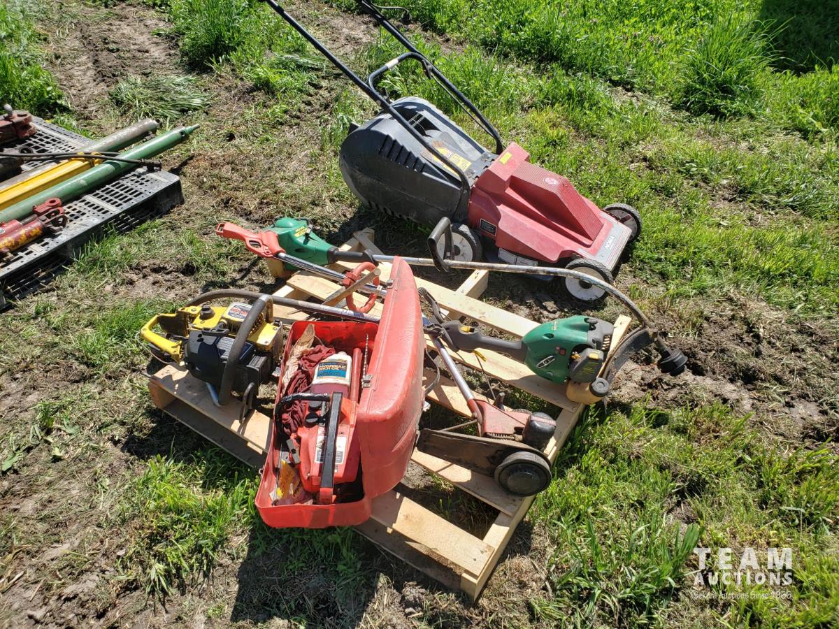 Electric lawn mower, (2) trimmers, (2) chainsaws
