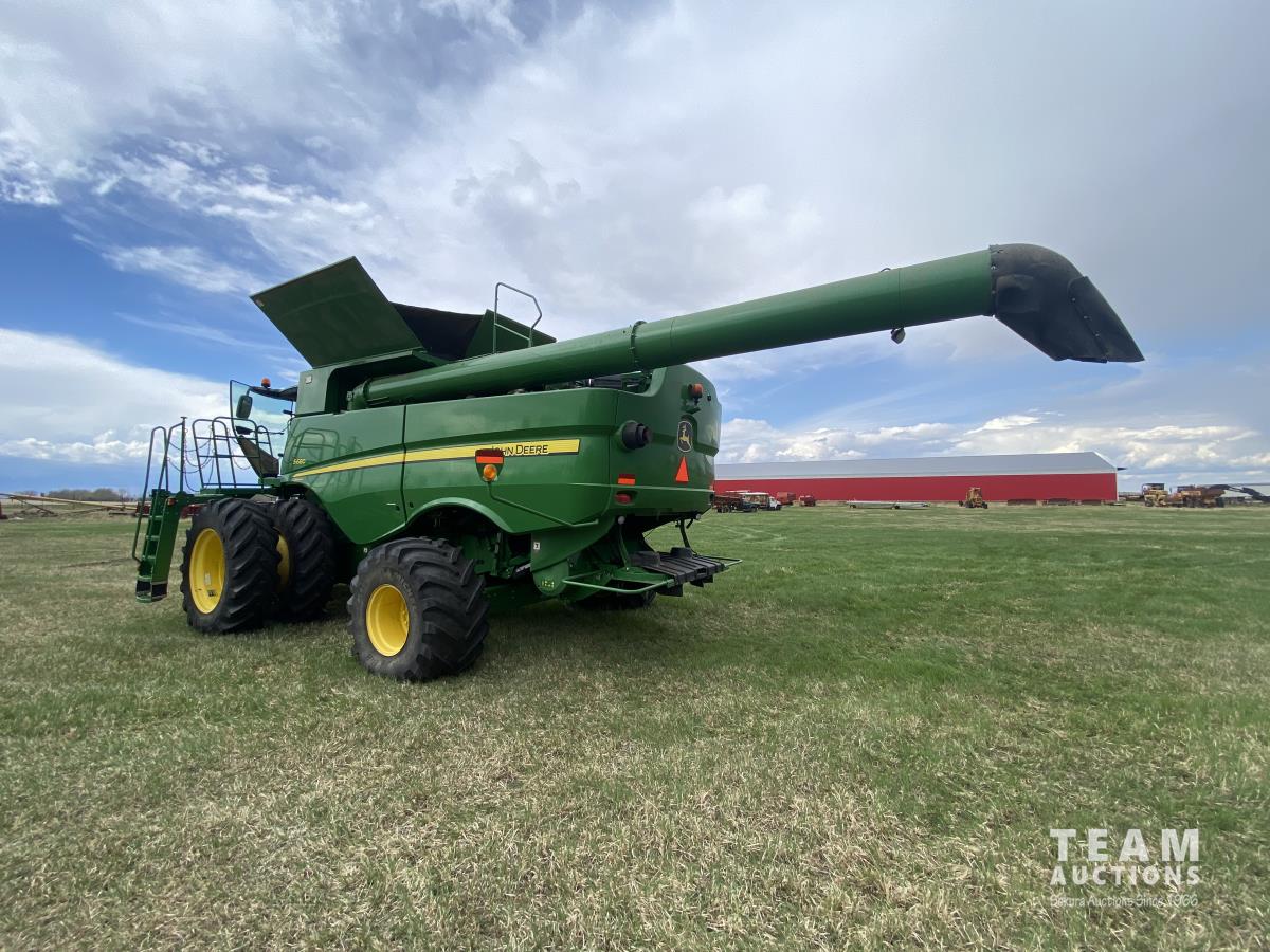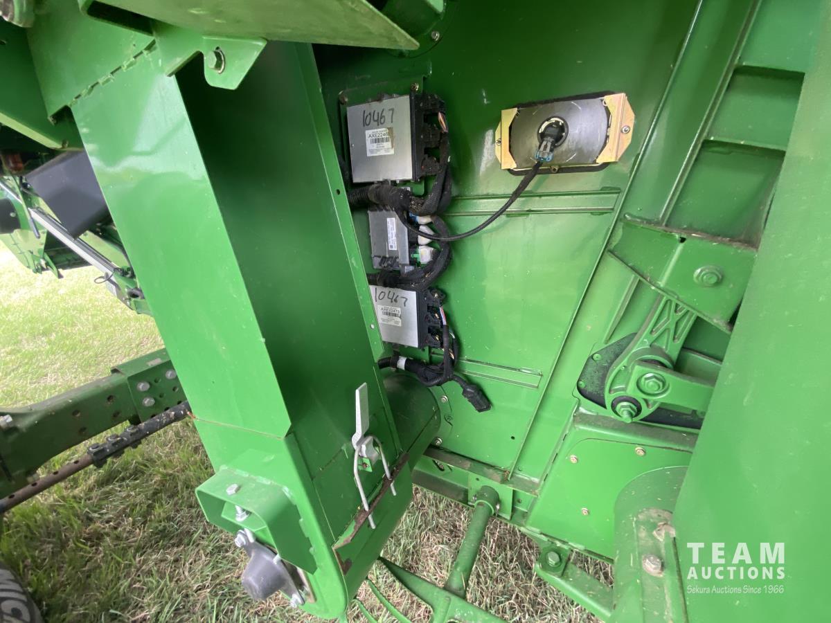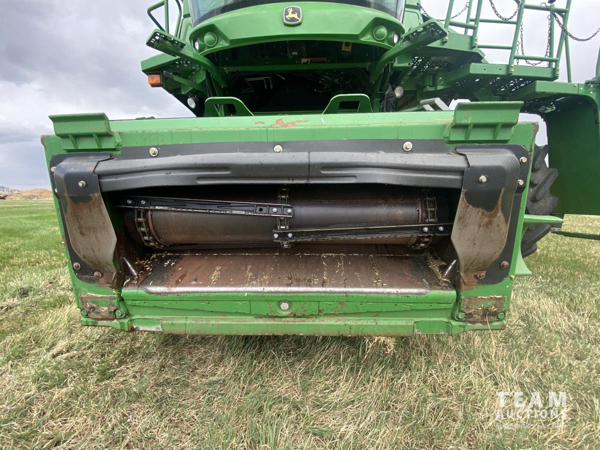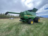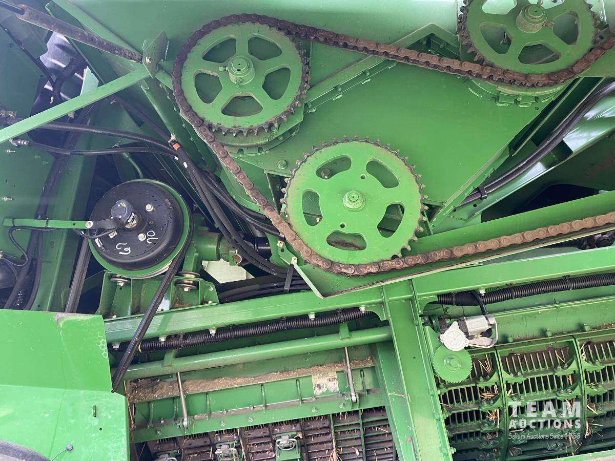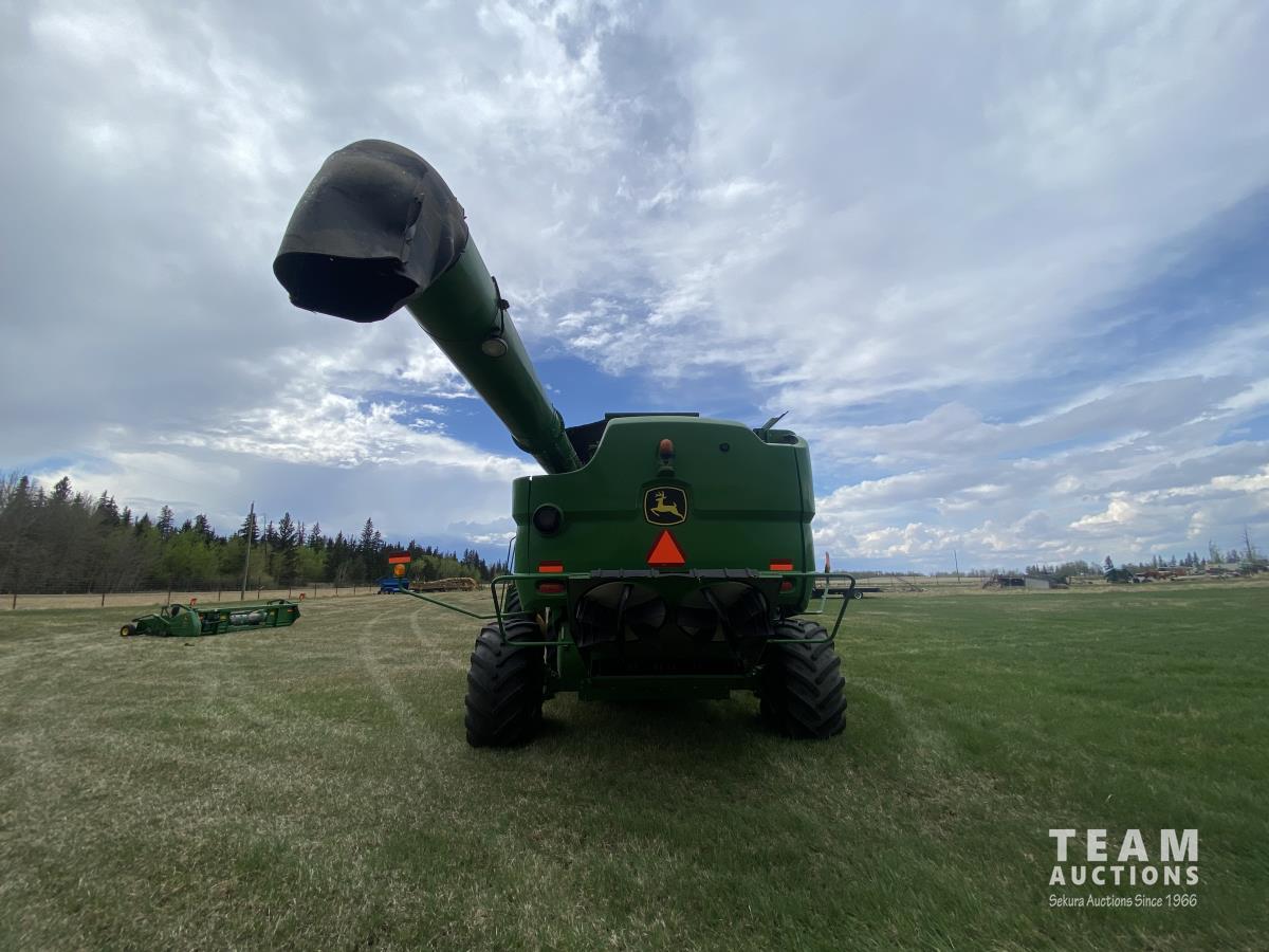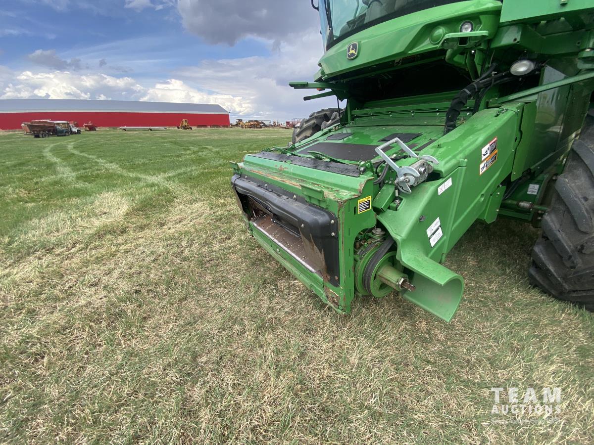 John Deere 615P pick-up header, variable speed reel, auto header height, fore & aft, reverser, lateral tilt, rock trap, chopper/straw spreader, grain tank extensions, A/C, radio, 520/85R42 front tires, duals, 750/65R26 rear tires