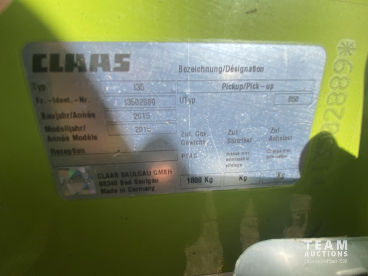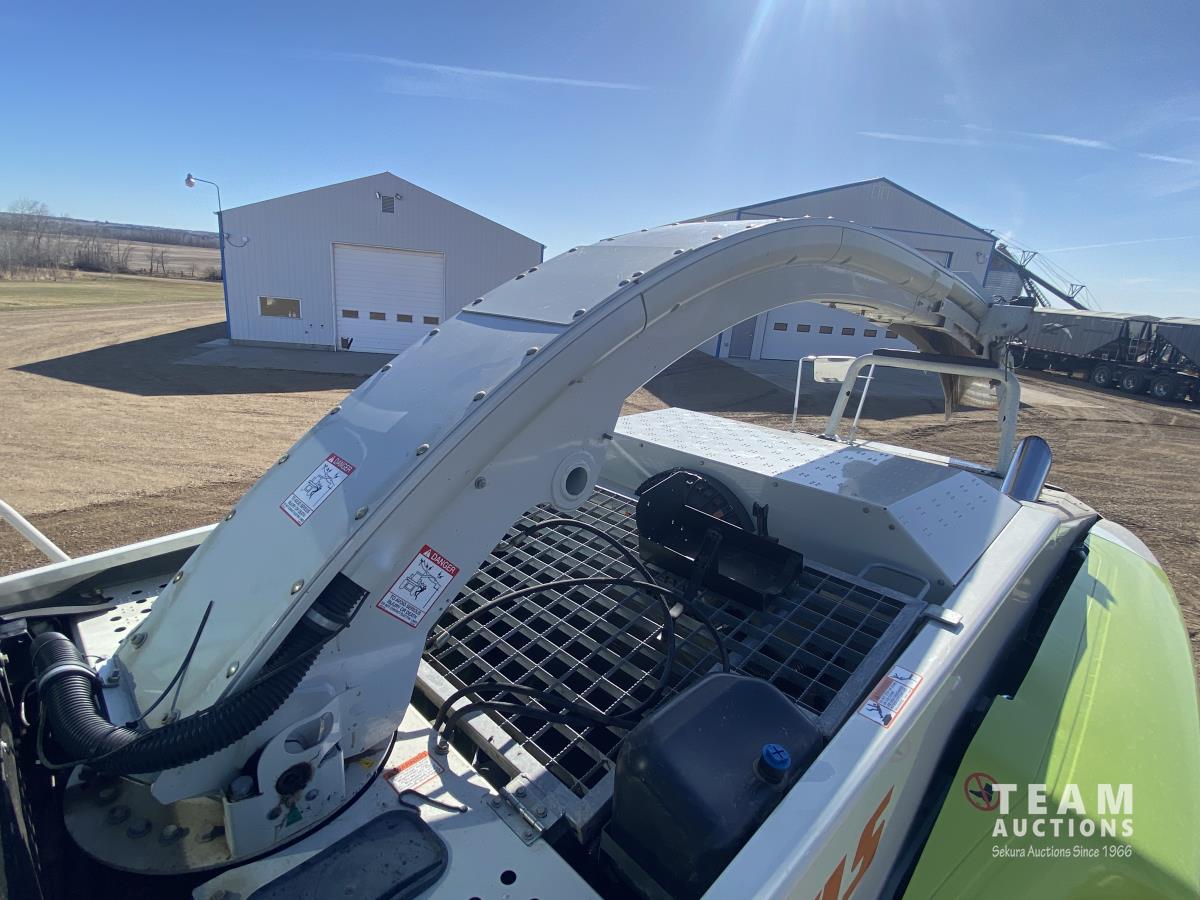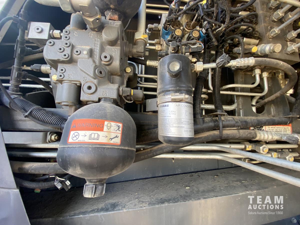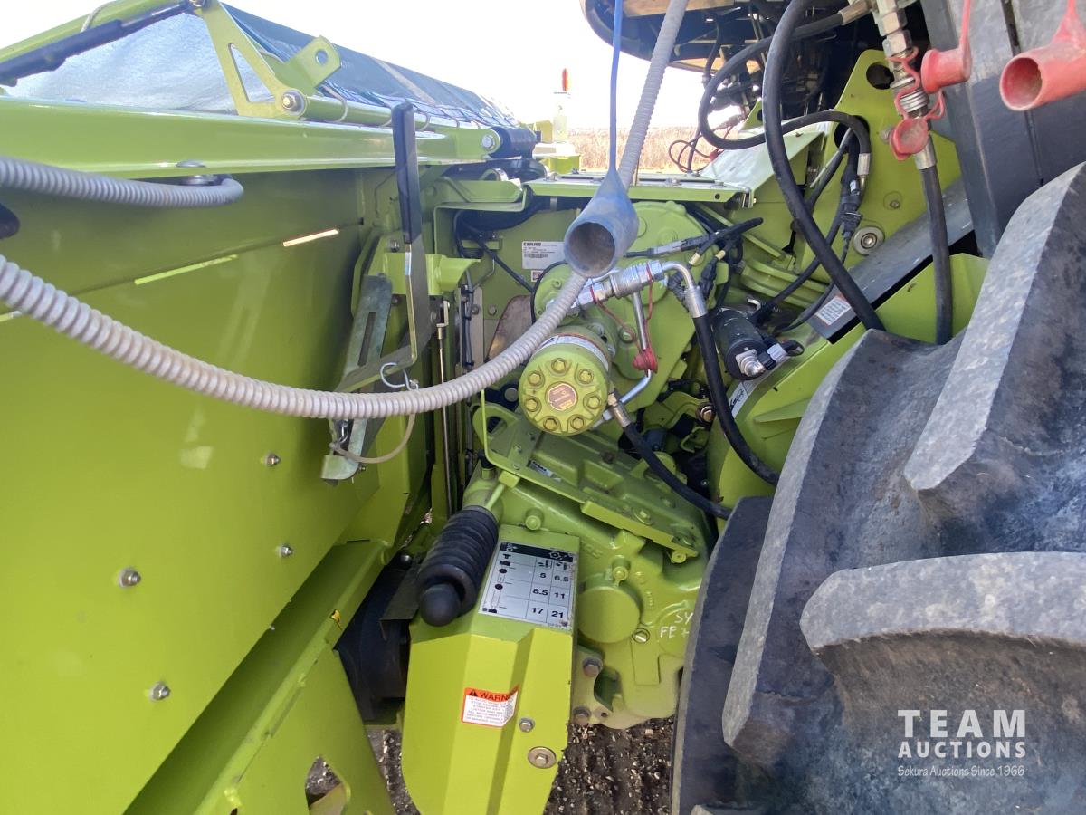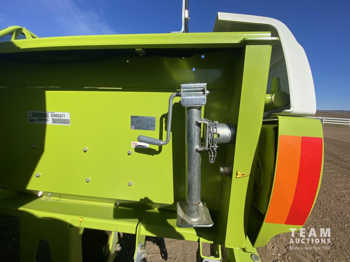 2015 Claas PU380HD 12 ft pickup, Mercedes OM470LA, 10.6 L, 6 cylinder, diesel engine, enclosed cab, A/C, air ride seat, hydrostatic drive, reverser, spout camera, metal detector, factory rock stopper, auto sharpening shear bar,18.5X8.5-8 pickup tires, 800/65R32 front, 16.5/85R24 rear