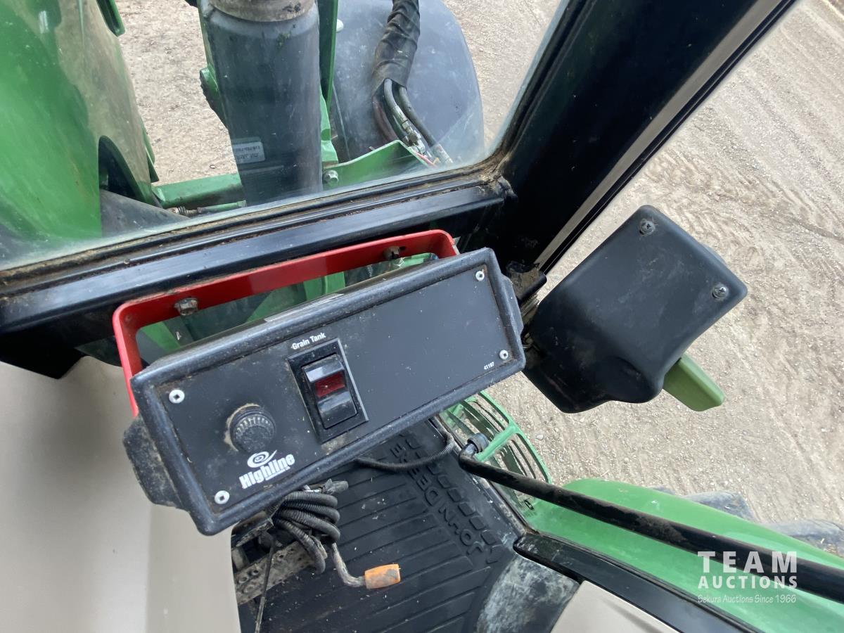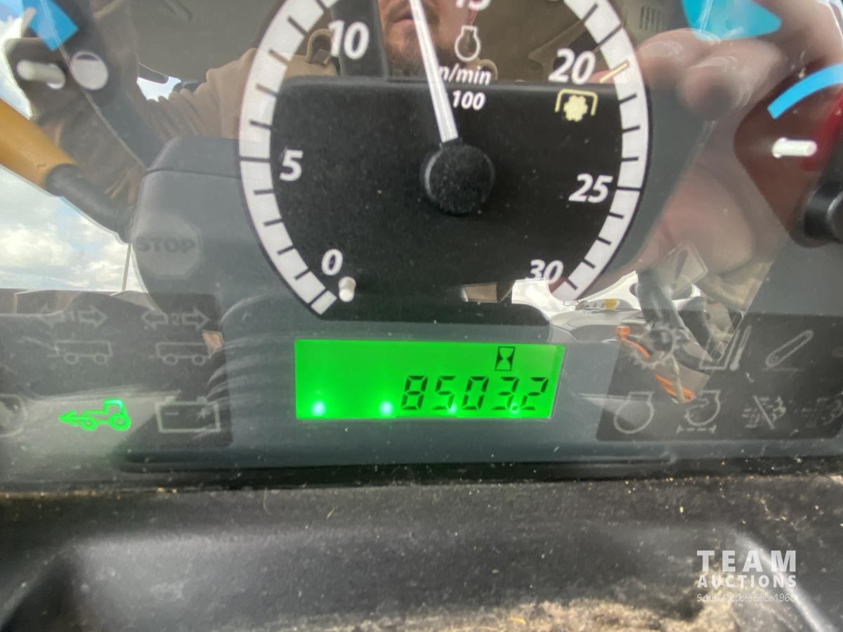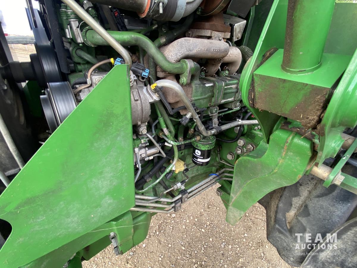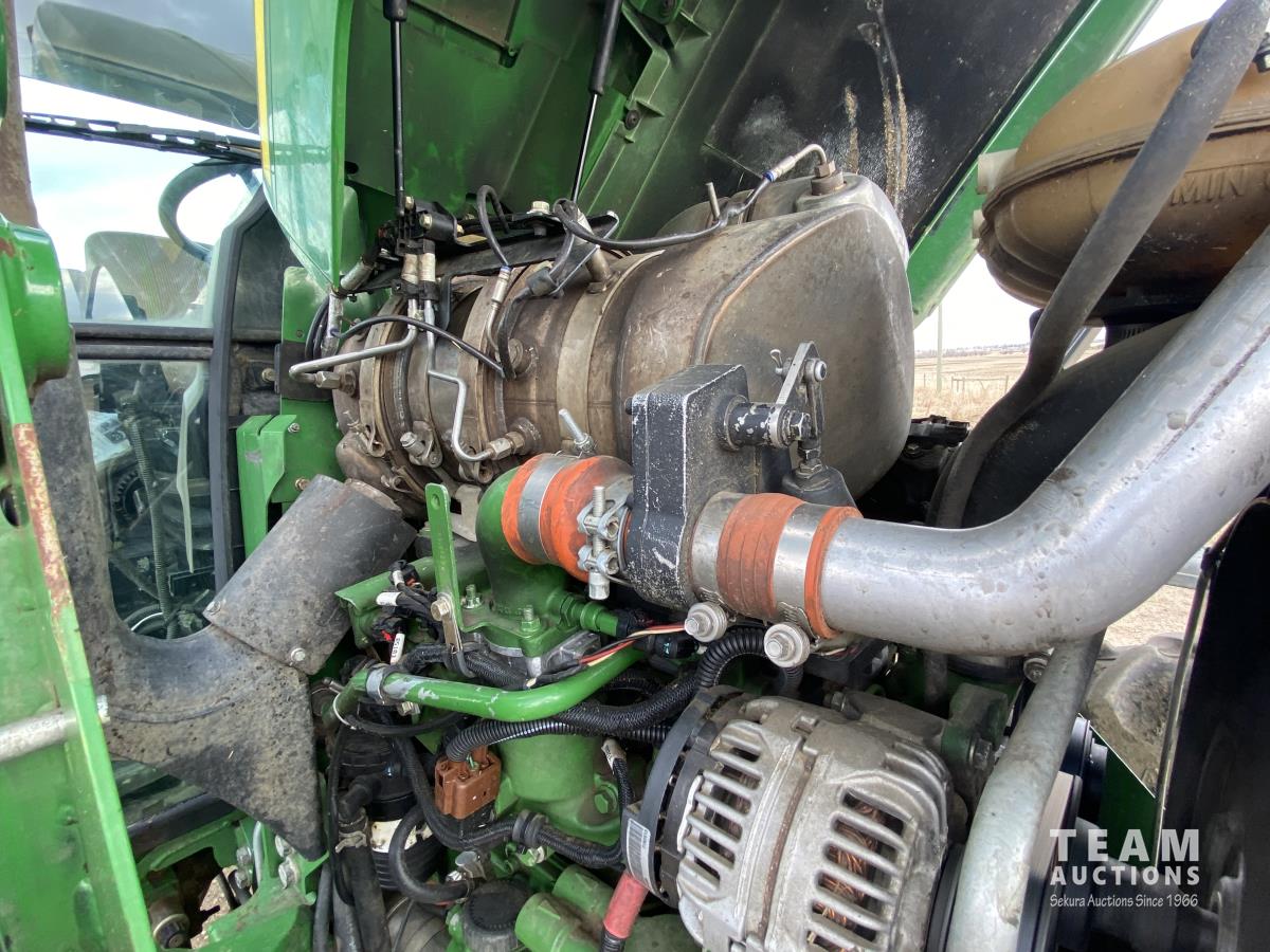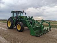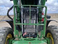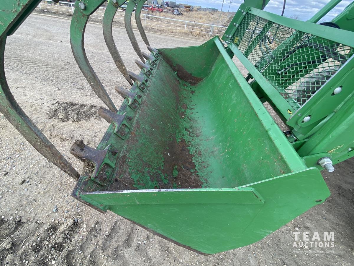 John Deere H310 loader, Q/A, 84 inch bucket, grapple, mid mount hydraulic connection, 4.5 L 4 cylinder 138 HP, diesel engine, 115 PTO HP, 9 speed partial synchro transmission, cab, ROPS, left hand reverser, A/C, air ride seat, joystick, 540/1000 PTO, 3 point hitch, 3 rear hydraulic outlets, drawbar, 14.9-24 front tires, 18.4-38 rear tires