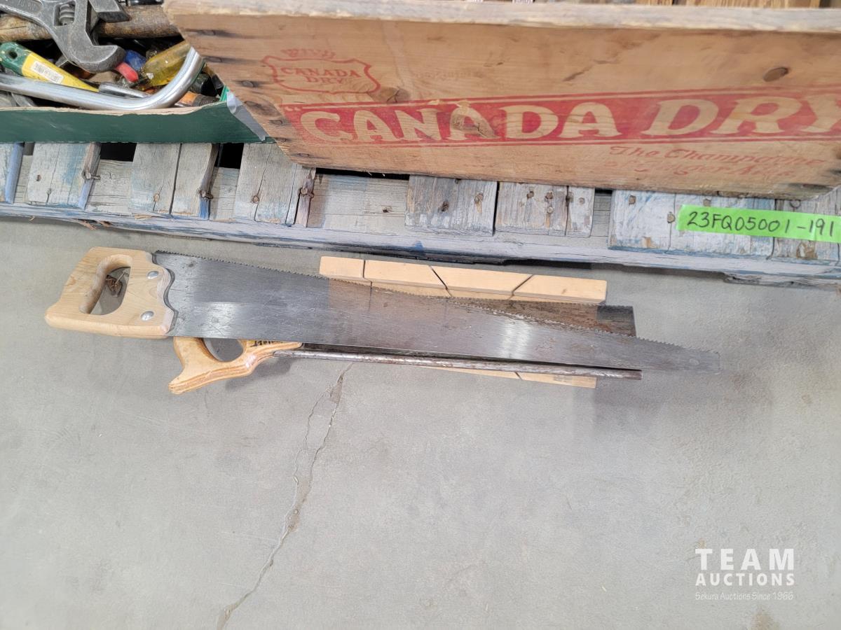 Canada Dry crate, hand saws, disassembled end table, antique clothes drying rack