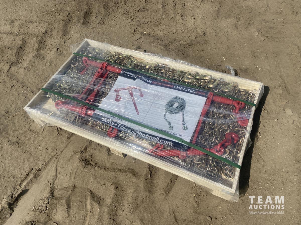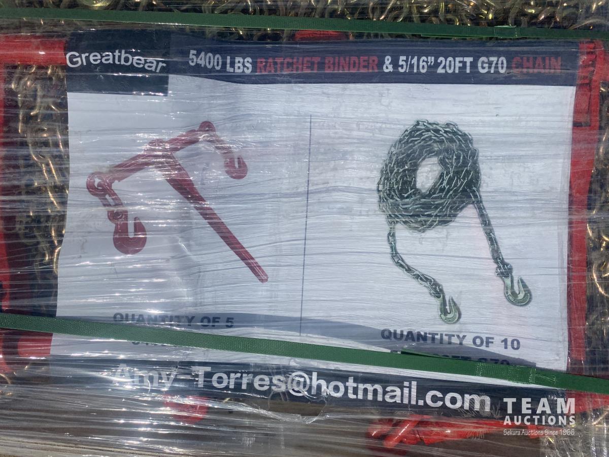 12 2023 Greatbear (5) 5400 lb Ratchet Binders & (10) 5/16 Inch 20 Ft G70 Chain (Unused)